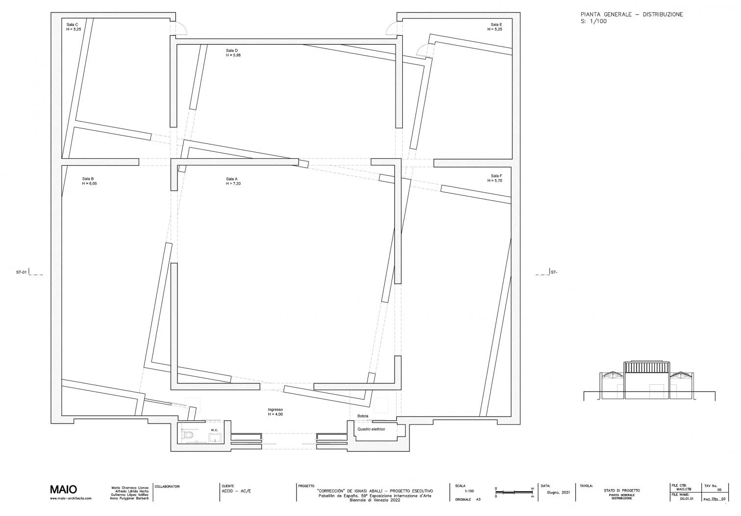 La intervención en el Pabellón de España en la 59.º Bienal de Venecia ha partido de la constatación de un error y se ha traducido en una instalación de raíz minimalista y escala 1:1. El error es que el recinto del pabellón se erigió en su momento ligeramente desplazado respecto a los edificios vecinos de los Giardini. Y la instalación consiste en la inserción de la planta corregida en el marco de la planta errónea a la manera de dos muñecas rusas mal avenidas, de suerte que el desfase de diez grados entre una y otra dé pie a una serie de inesperadas combinaciones que el visitante deberá descubrir por su cuenta. Esta yuxtaposición de arquitecturas en apariencia iguales pero de difícil macla propicia un espacio en la que el interior original queda completamente desdibujado, y en el que la placidez de lo ortogonal se quiebra por medio de encuentros de planos, esquinas imposibles y remates imprevistos que, juntos, componen una suerte de inquietante laberinto.