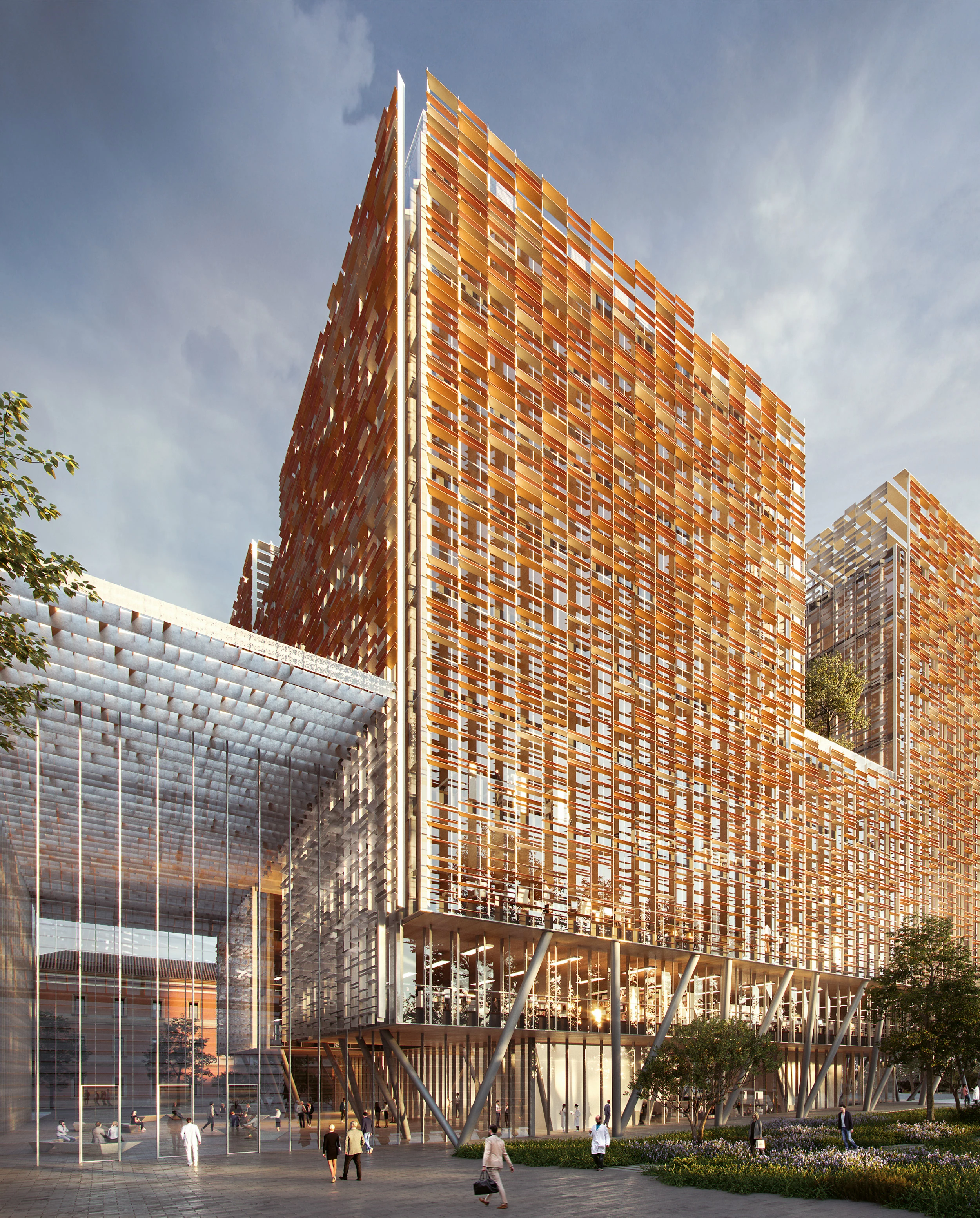El edificio se concibe como un banco de materiales para el futuro, con componentes recuperables montados en seco, ligeros y de bajo impacto. En torno a un gran atrio bioclimático se sitúan los laboratorios y oficinas liberadas de bajantes de instalaciones y estructura...[+]