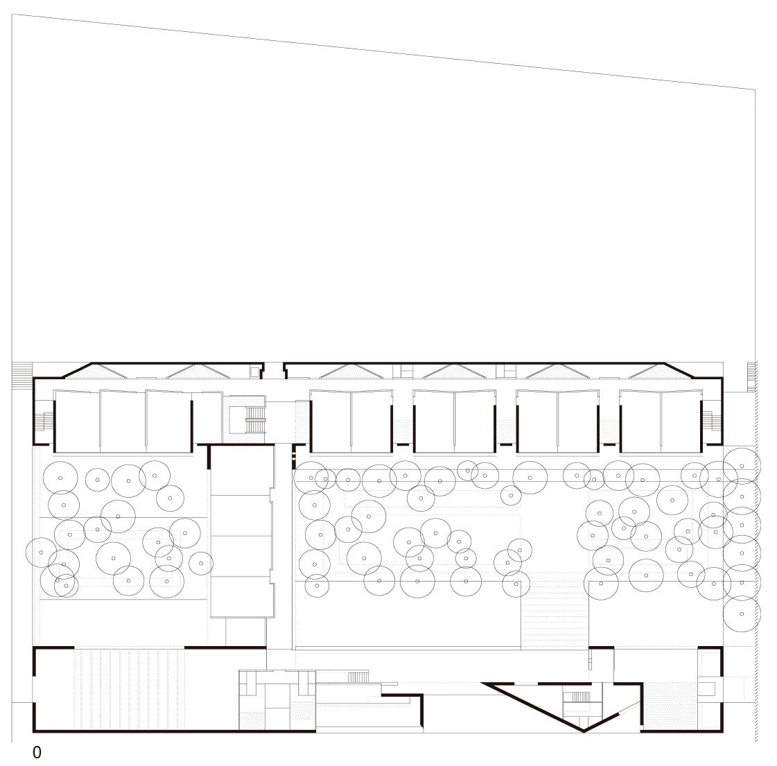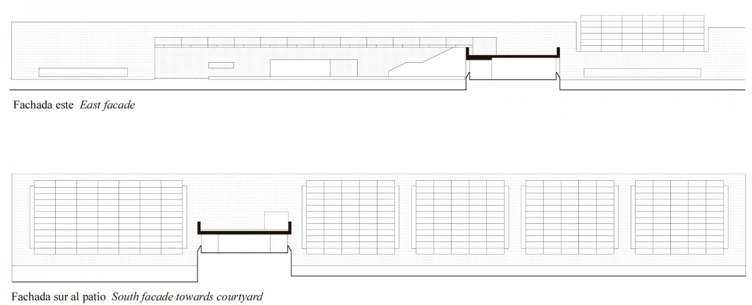 El patio central está atravesado por una pieza de cubierta transitable que conecta los dos brazos. El primero de ellos, situado al sur del emplazamiento, da la bienvenida a estudiantes y profesores ofreciendo un umbral en sombra, en el que destaca el elemento triangular que acoge la conserjería y la delegación de alumnos. Este brazo también alberga la biblioteca y el gimnasio, iluminado por una doble piel de vidrio y chapa perforada. El rectángulo de la parte superior contiene las aulas, conectadas por un largo pasillo y volcadas al patio interior.
