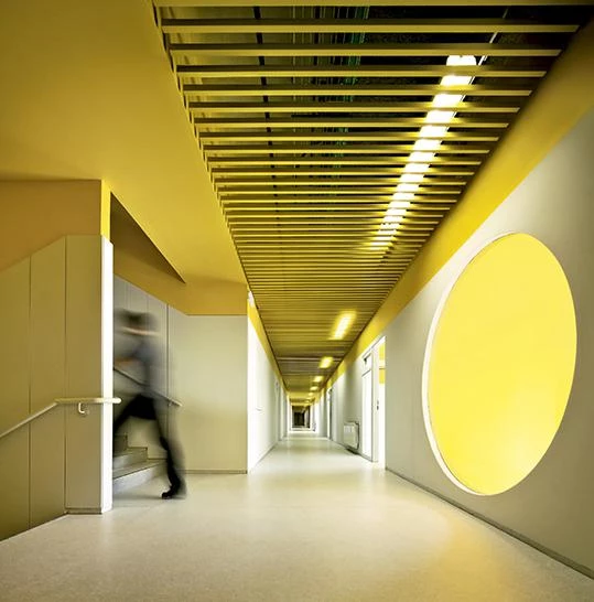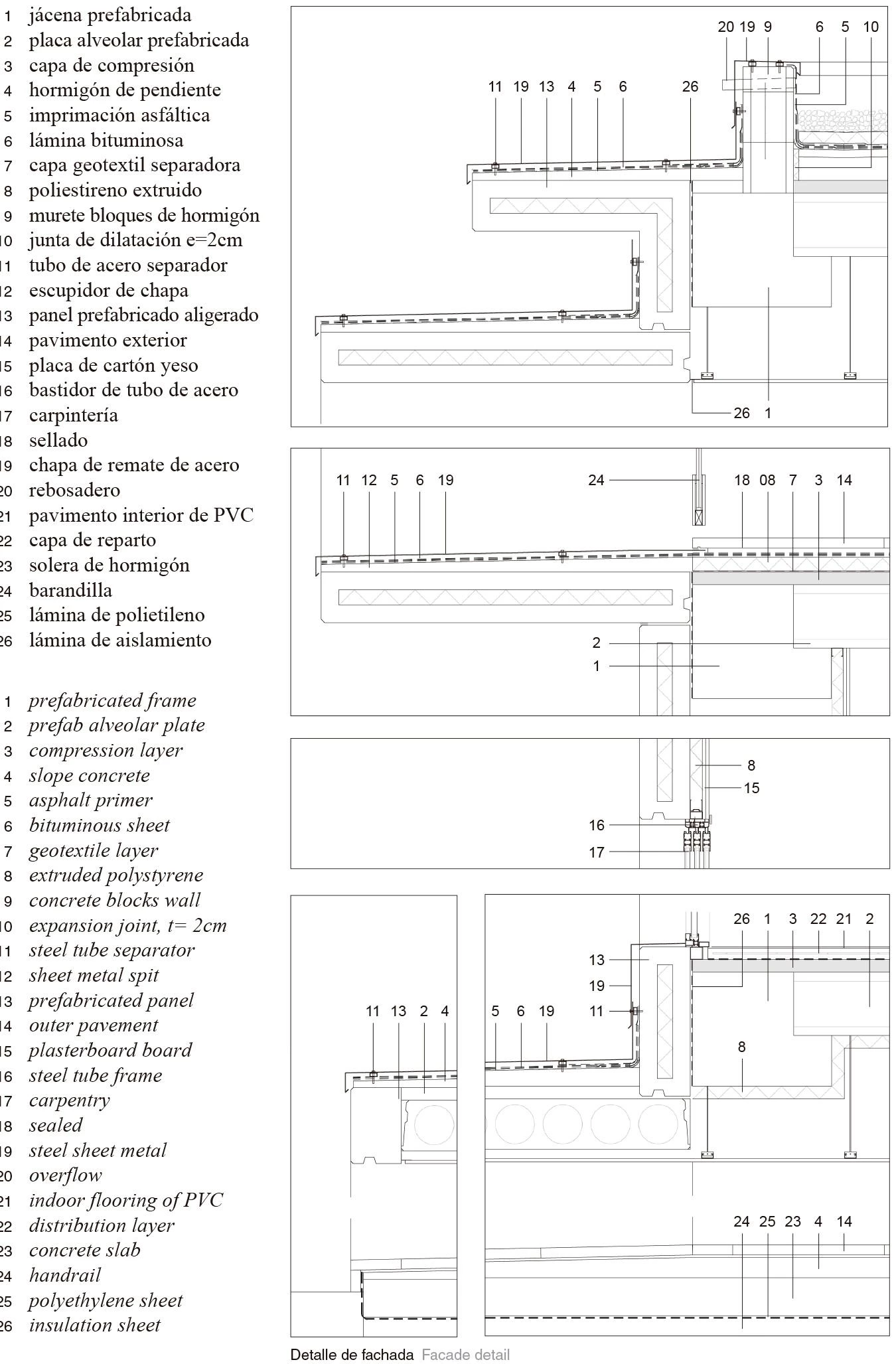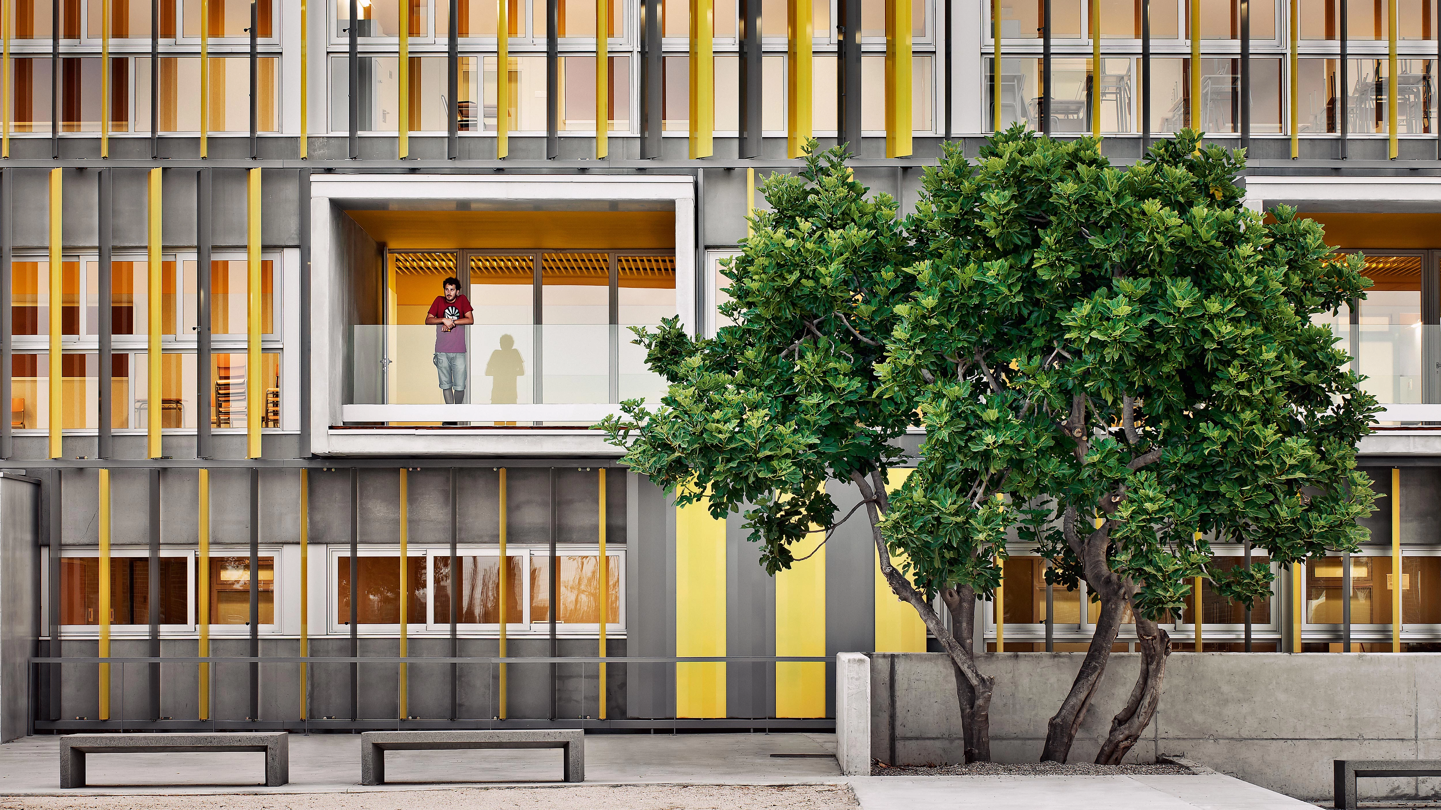 Los cerramientos se resuelven en hormigón prefabricado, con especial atención al control lumínico y acústico de las aulas. Para la protección solar se dispone en cada planta un sistema de lamas orientables lacadas alternativamente en plata y amarillo. Este sistema solo se interrumpe por las terrazas enmarcadas en gris a modo de ventanas a gran escala.
