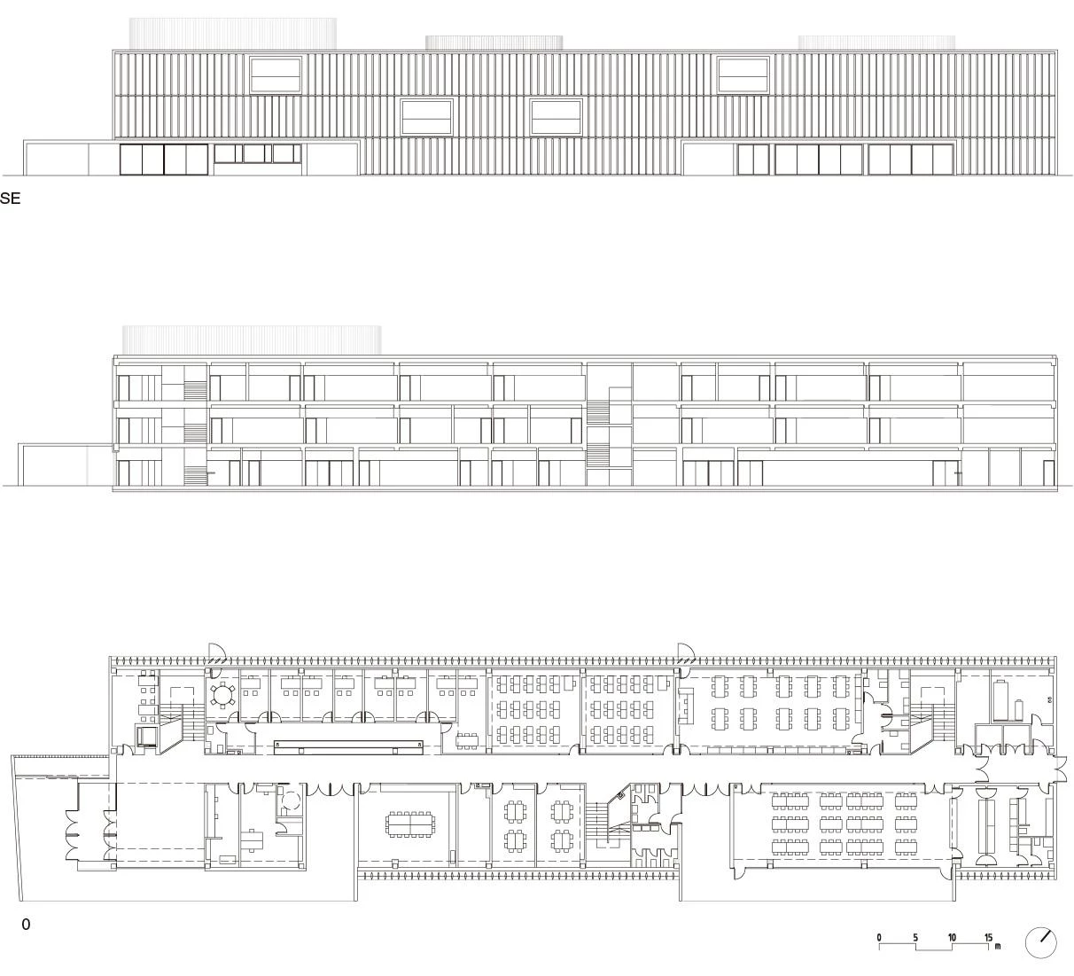 La orientación, con las fachadas principales a noreste y sudoeste, permite organizar cada planta a partir de un corredor central al que se abren a ambos lados las aulas y demás dependencias. Estos corredores parten de un vestíbulo situado en un extremo, abierto a tres alturas, donde se sitúa el acceso principal. Este espacio cualifica el edificio convirtiéndose en su principal zona de relación. Para iluminar los corredores se abren terrazas que funcionan como áreas de estudio o descanso.