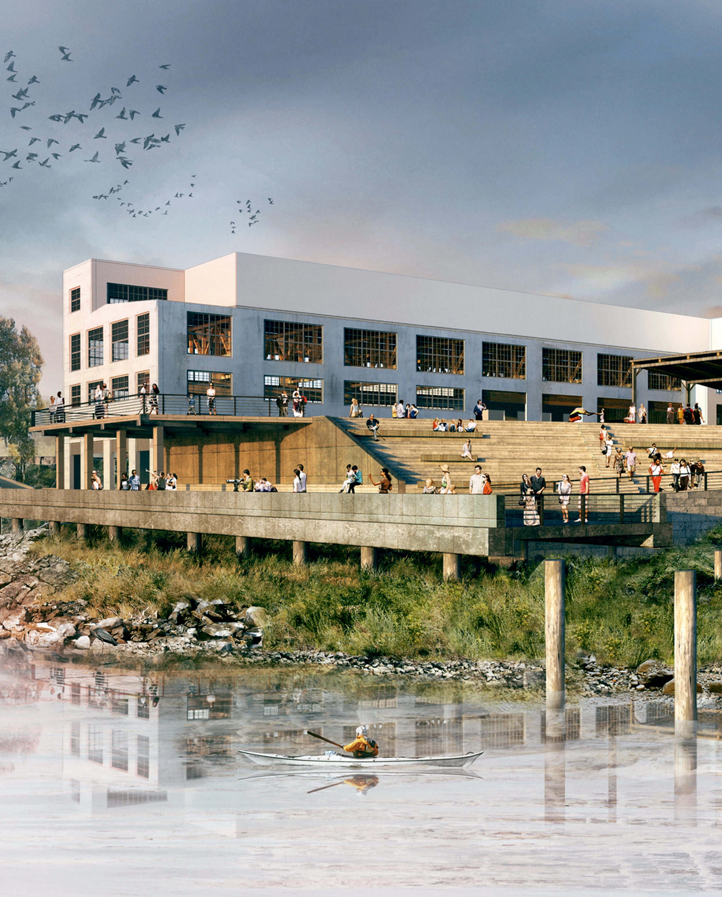Las calderas y las estructuras del Mill H conforman un enclave icónico al borde del río. El Mill H se fragmenta en tres partes: un bosque de coníferas, una torre de juegos y una estructura con dos miradores en los niveles inferior y superior.