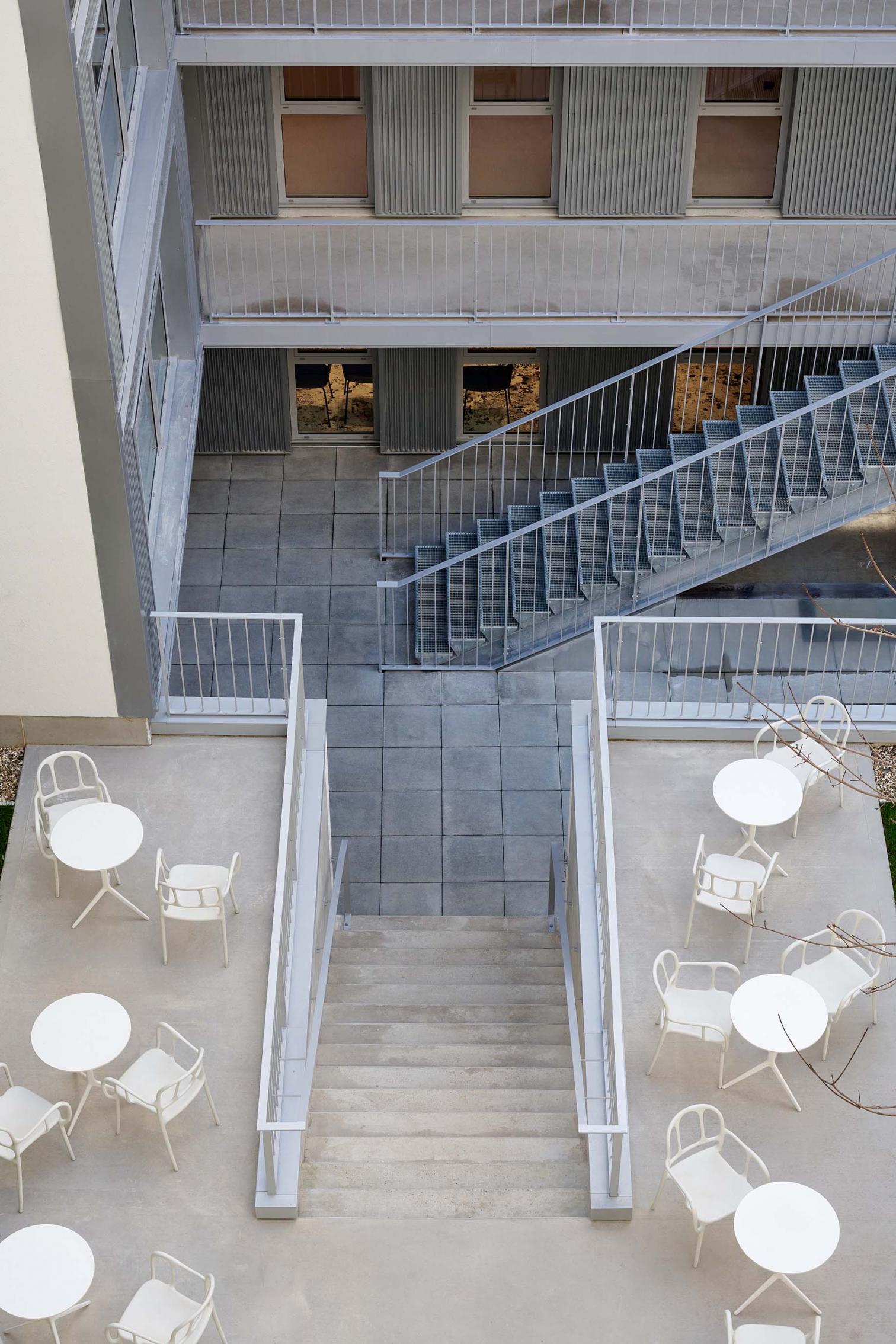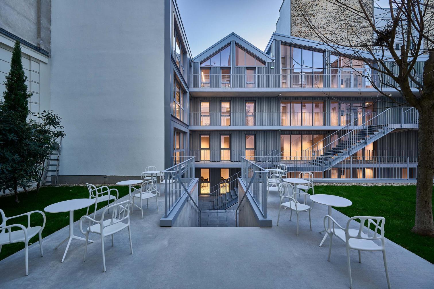 Para adaptarse a la normativa local y el tejido urbano parisino, el diseño del centro de formación adopta una forma en U, organizada en torno a un patio que permite el diálogo entre los edificios antiguos y los nuevos. La escalera exterior, suspendida sobre el jardín, actúa como un elemento unificador entre las pasarelas de acceso a los diferentes niveles del edificio. La cubierta fragmentada incorpora vegetación, terrazas accesibles e inclinaciones que aportan dinamismo a la composición.