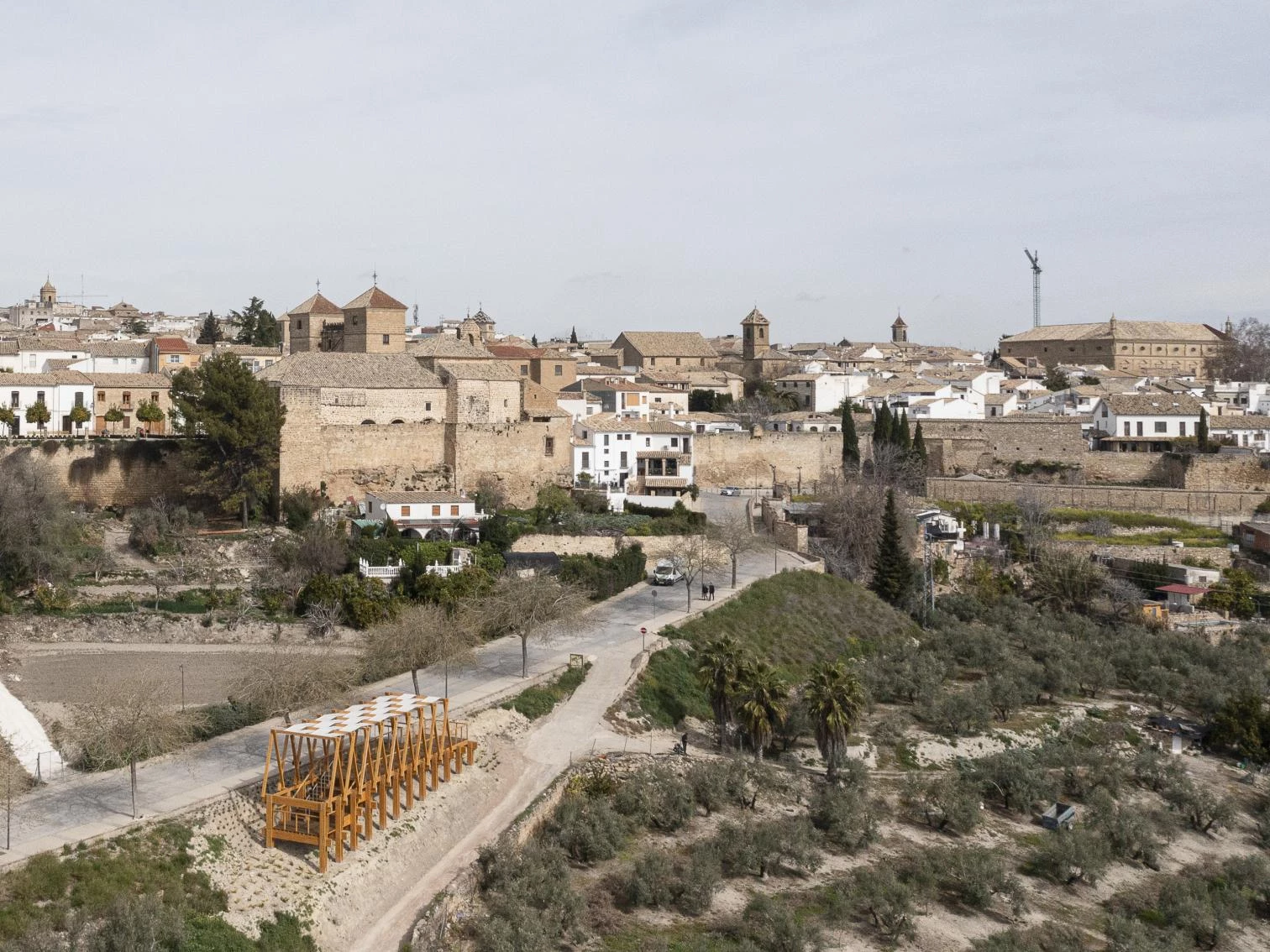 Junto al camino de Granada, actualmente una vía pecuaria, se construye el mirador y centro de recepción de visitantes Antonio Muñoz Molina, un pabellón realizado en madera con herrajes de acero. La plataforma está elevada sobre pilares en pórticos equidistantes de 2,5 m. El volumen se levantó con piezas prefabricadas en madera, utilizando un sistema con junta seca.