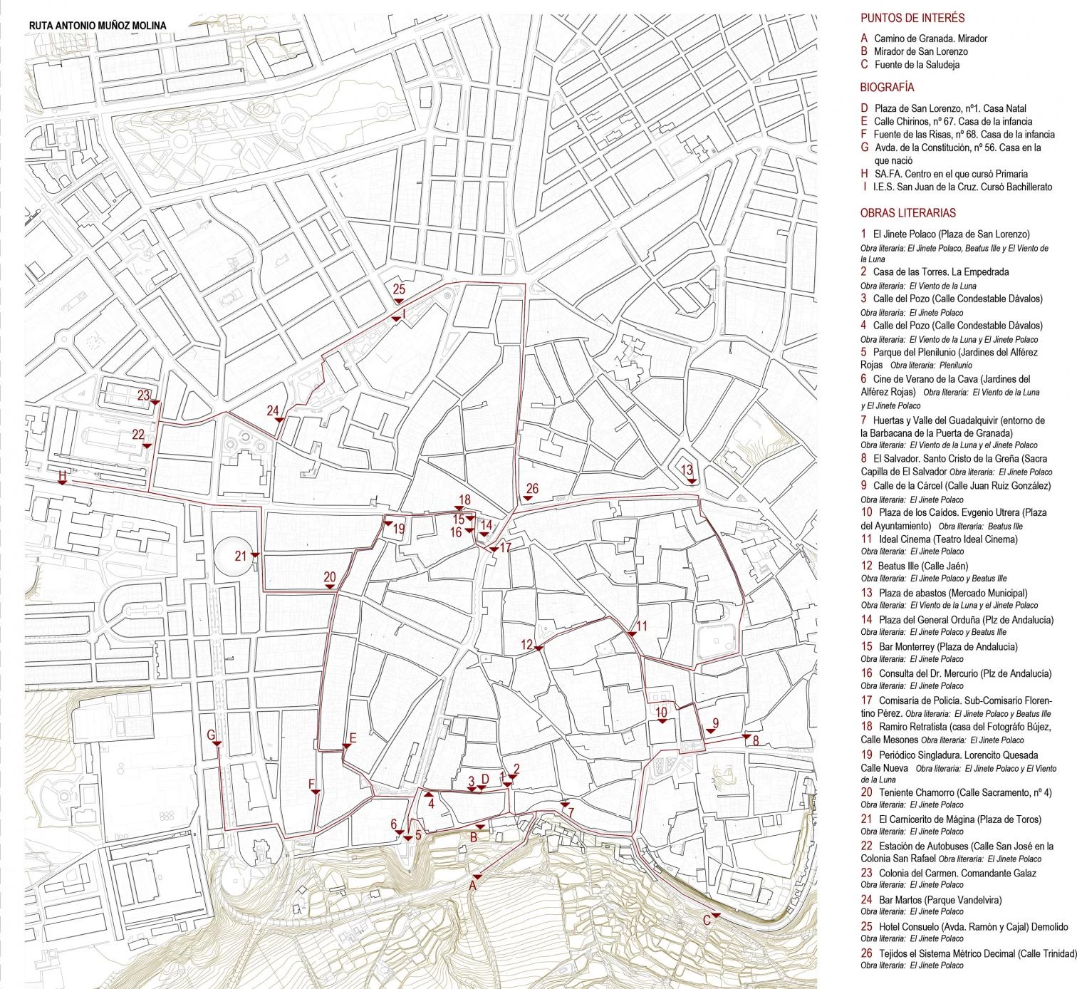 El itinerario reconoce la estrecha relación entre el escritor Antonio Muñoz Molina y su ciudad natal, Úbeda, declarada Patrimonio Mundial de la Unesco en 2003. La ruta recorre arquitecturas y espacios que se desarrollan como telón de fondo en su literatura y han sido de gran significado para el autor. El circuito recupera una serie de espacios urbanos degradados y zonas naturales con alto valor patrimonial. De entre todos los puntos que se han establecido en la visita del recorrido cultural se decide actuar en dos: el mirador y centro de recepción de visitantes Antonio Muñoz Molina, y en el mirador de San Lorenzo, ambas obras del estudio malagueño de Luis Machuca.