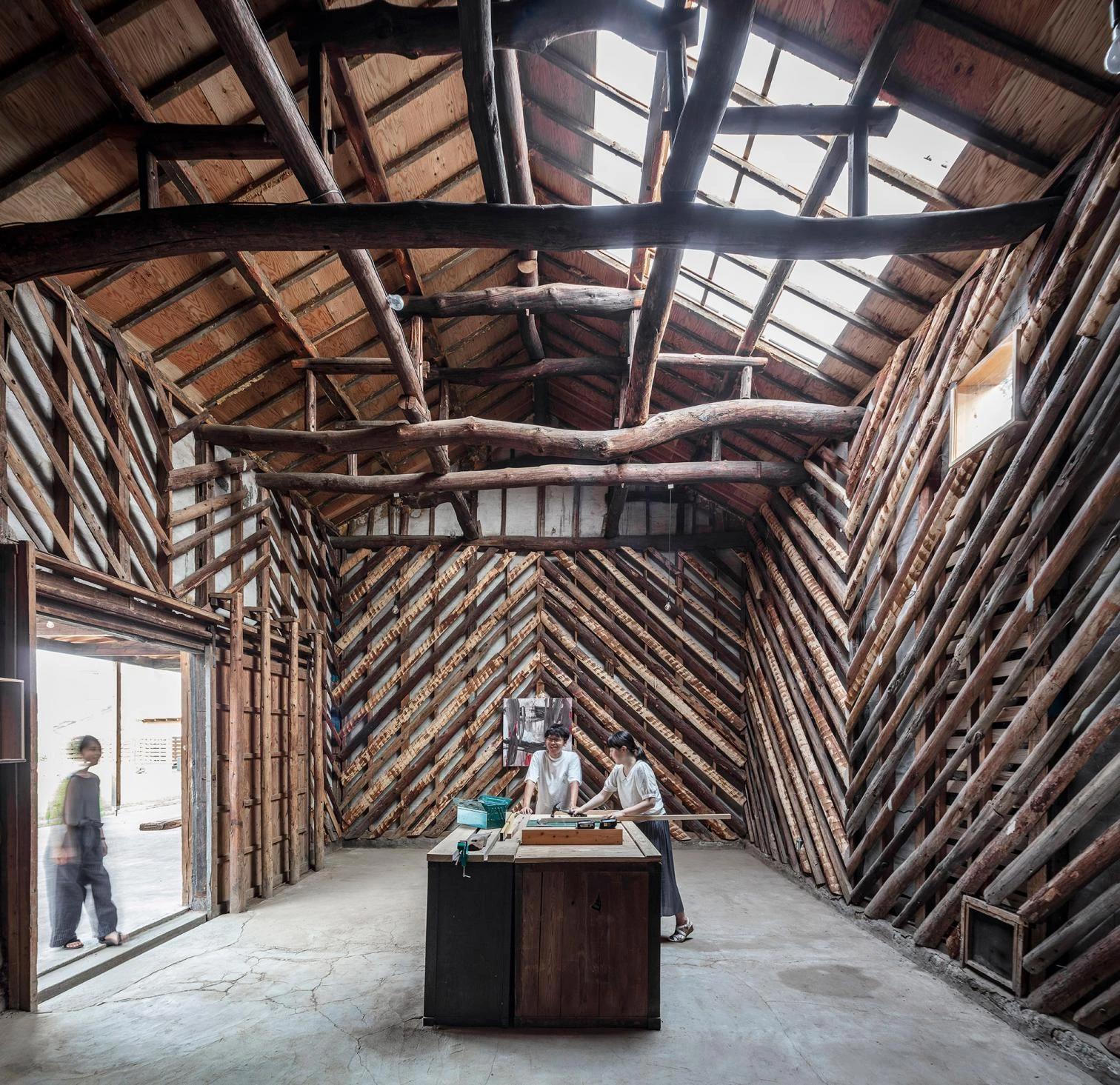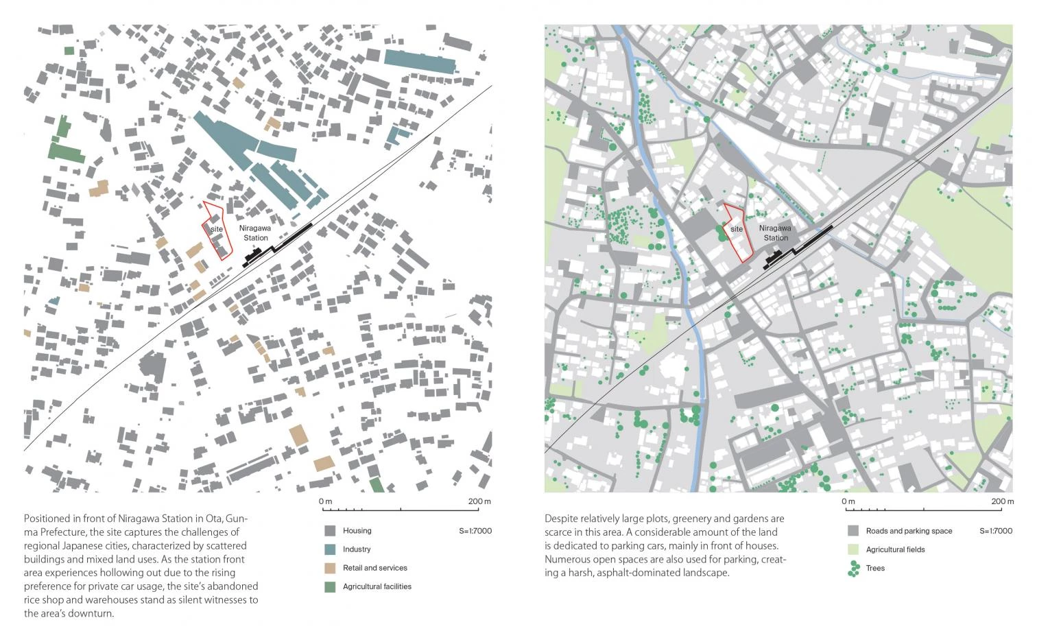 El proyecto incluye la demolición de algunas piezas, como los bloques de hormigón que cerraban el recinto. En su lugar, se introduce un banco protegido por una marquesina. Empleando técnicas tradicionales japonesas de construcción modular en madera, se reutilizan elementos estructurales, puertas y ventanas. Los palés de los almacenes se convirtieron en vallas, mientras que las tejas, el hormigón y las piedras encontraron una nueva vida como materiales de pavimentación.