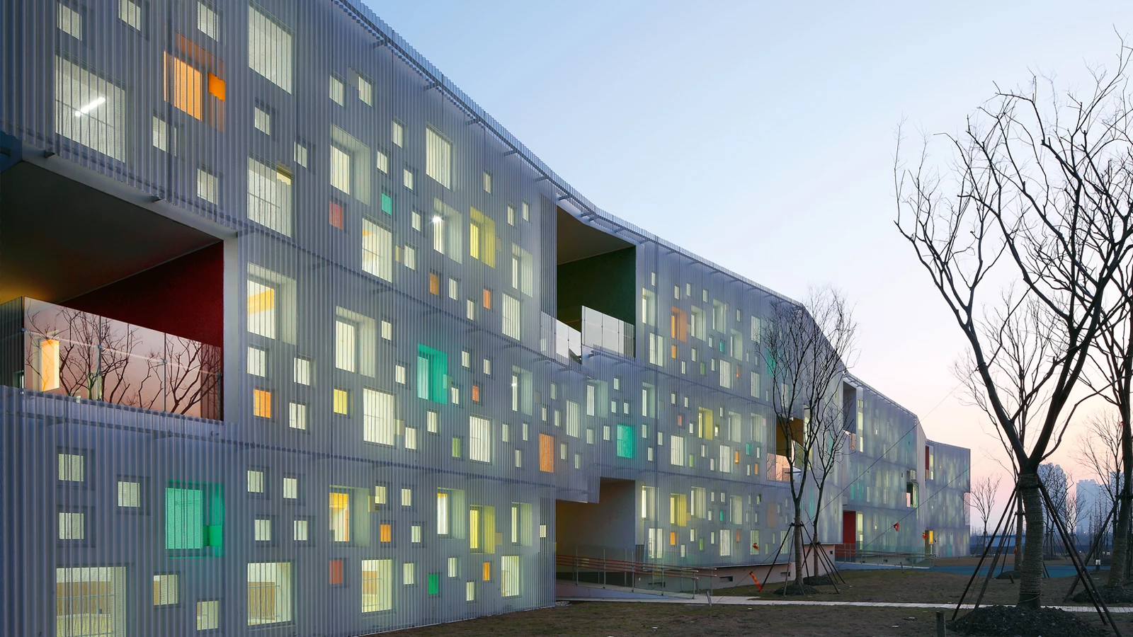 En la periferia de Shanghai, en el suburbio de Jiading, se encuentra esta escuela infantil. Está dividida en dos bloques longitudinales y zigzagueantes separados por un estrecho espacio que sirve como acceso y también como lugar en el que iniciar a los pequeños a las labores del huerto. El bloque más estrecho contiene algunos espacios administrativos y de apoyo de la escuela, pero sobre todo canaliza la circulación vertical mediante un juego de rampas que crean un espacio singular iluminado cenitalmente. A lo largo de este recorrido ascendente se da acceso a pasarelas que, volando a distintos niveles sobre el espacio intersticial que separa ambos volúmenes, conectan con las quince aulas. Éstas y sus servicios adjuntos ocupan el volumen más ancho, haciendo uso del mismo mecanismo quebrado de la planta en la sección, de modo que las aulas se disponen escalonadamente.