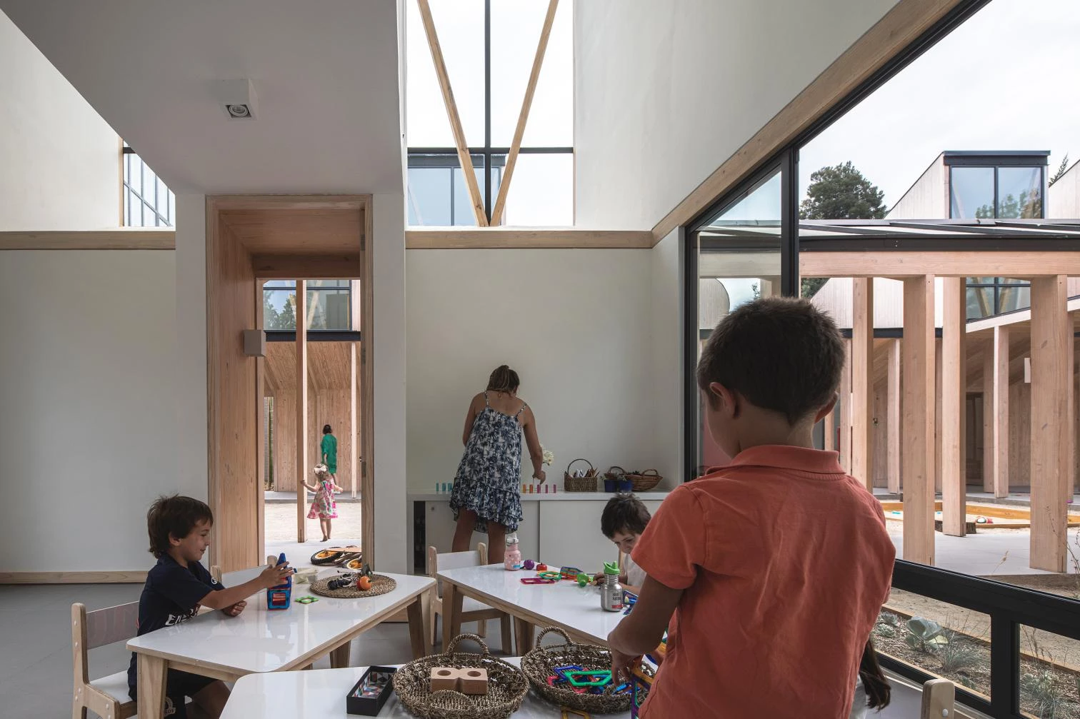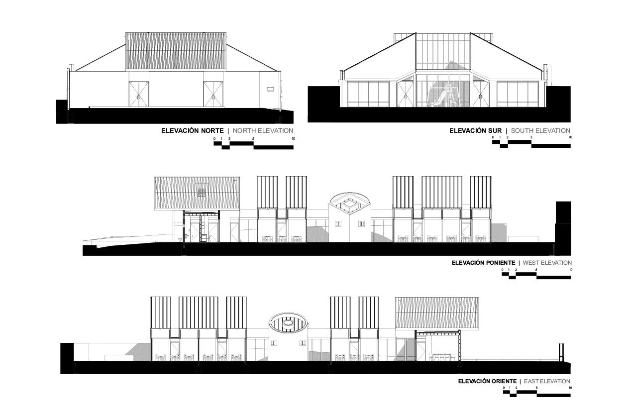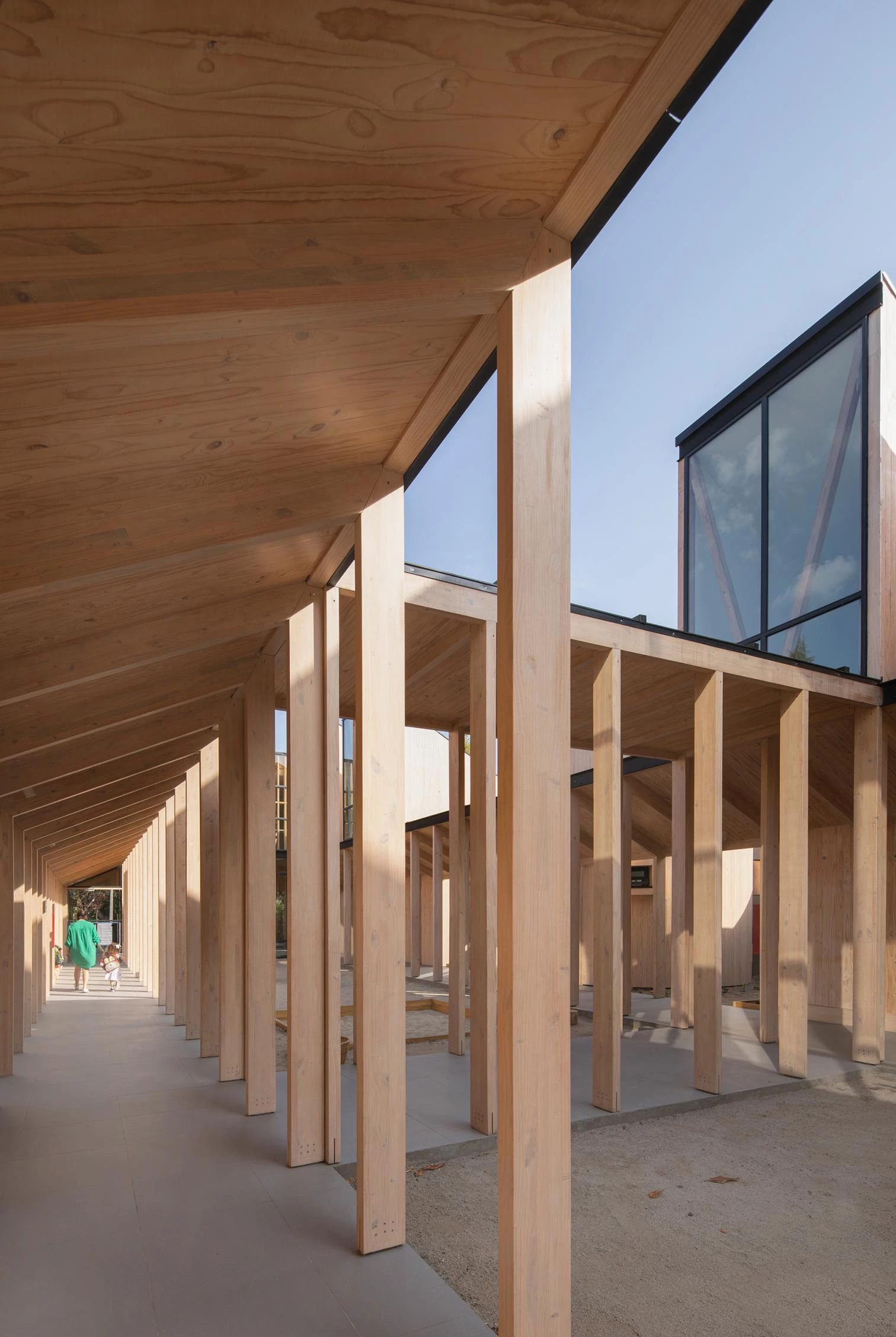 A través de la estructura vista y los acabados de madera de pino insigne se consigue dar unidad a las instalaciones del centro, cuya riqueza espacial se acentúa con diferentes entradas de luz vertical, horizontal o diagonal.