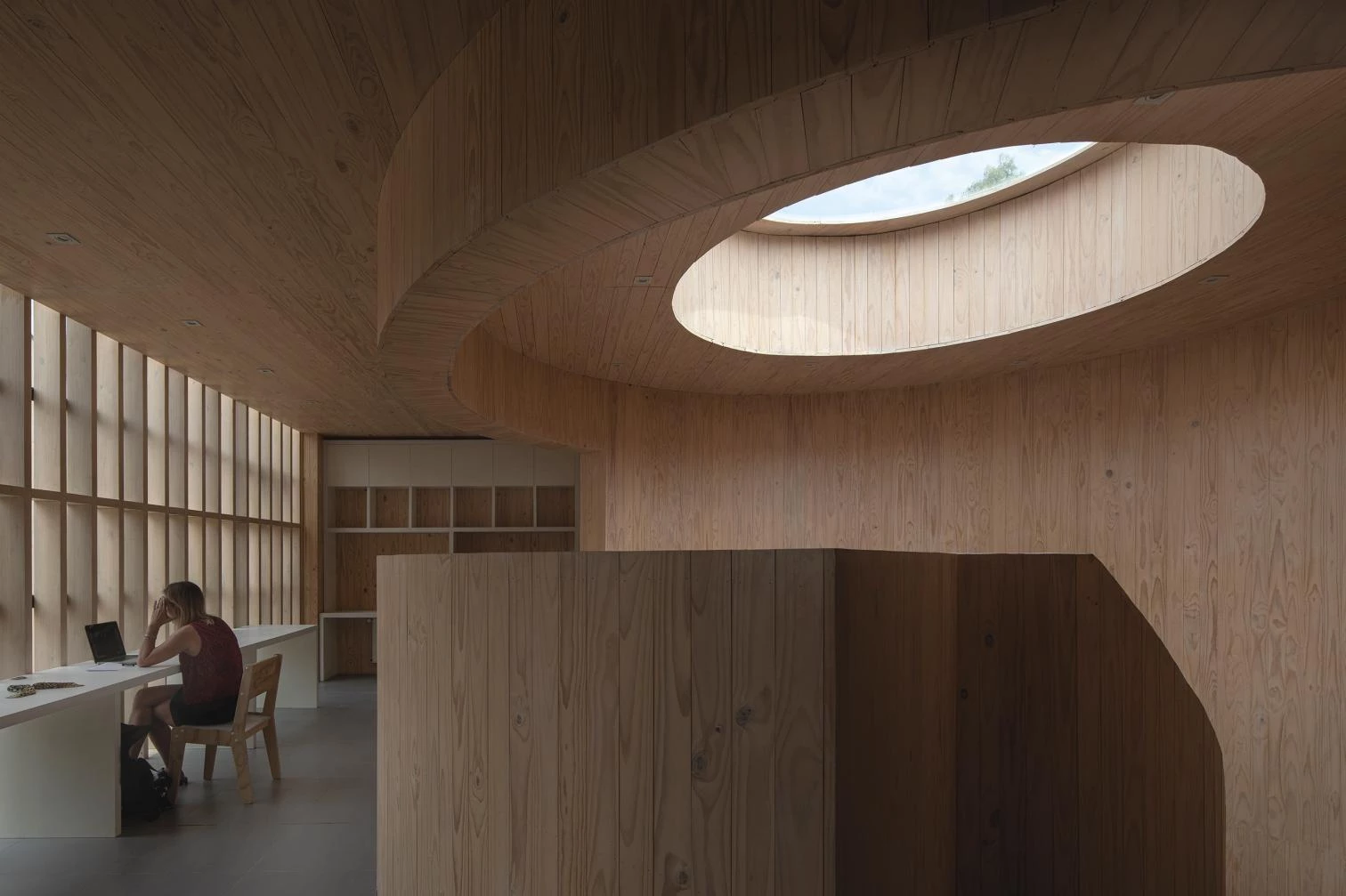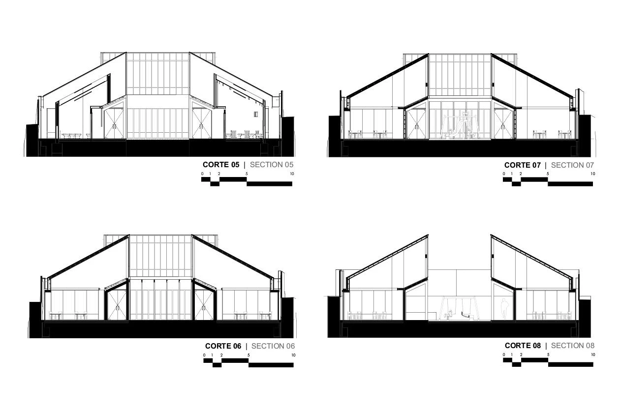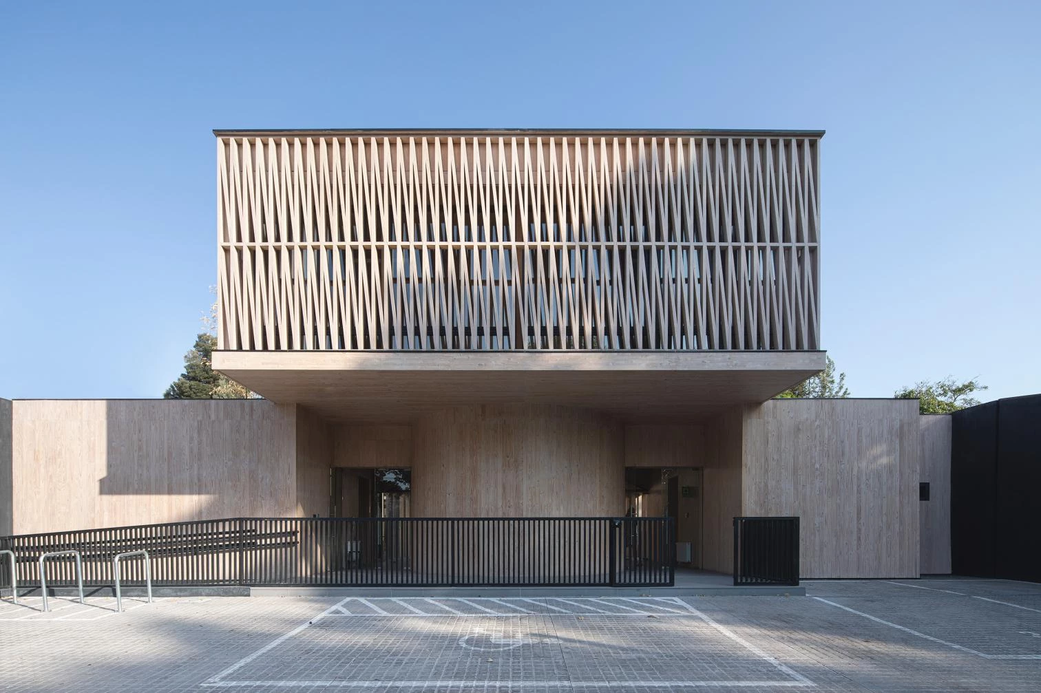 A través de la estructura vista y los acabados de madera de pino insigne se consigue dar unidad a las instalaciones del centro, cuya riqueza espacial se acentúa con diferentes entradas de luz vertical, horizontal o diagonal.