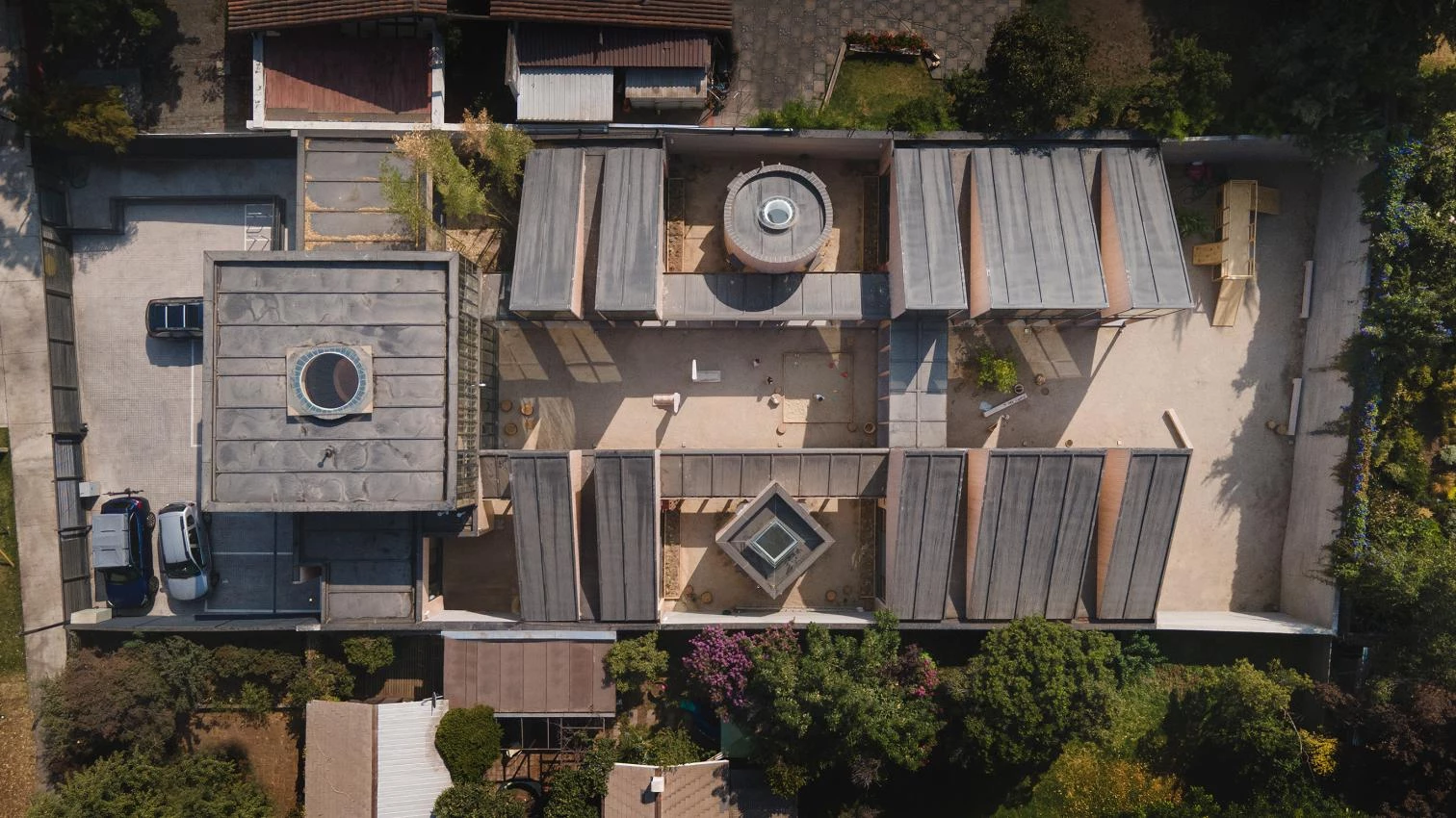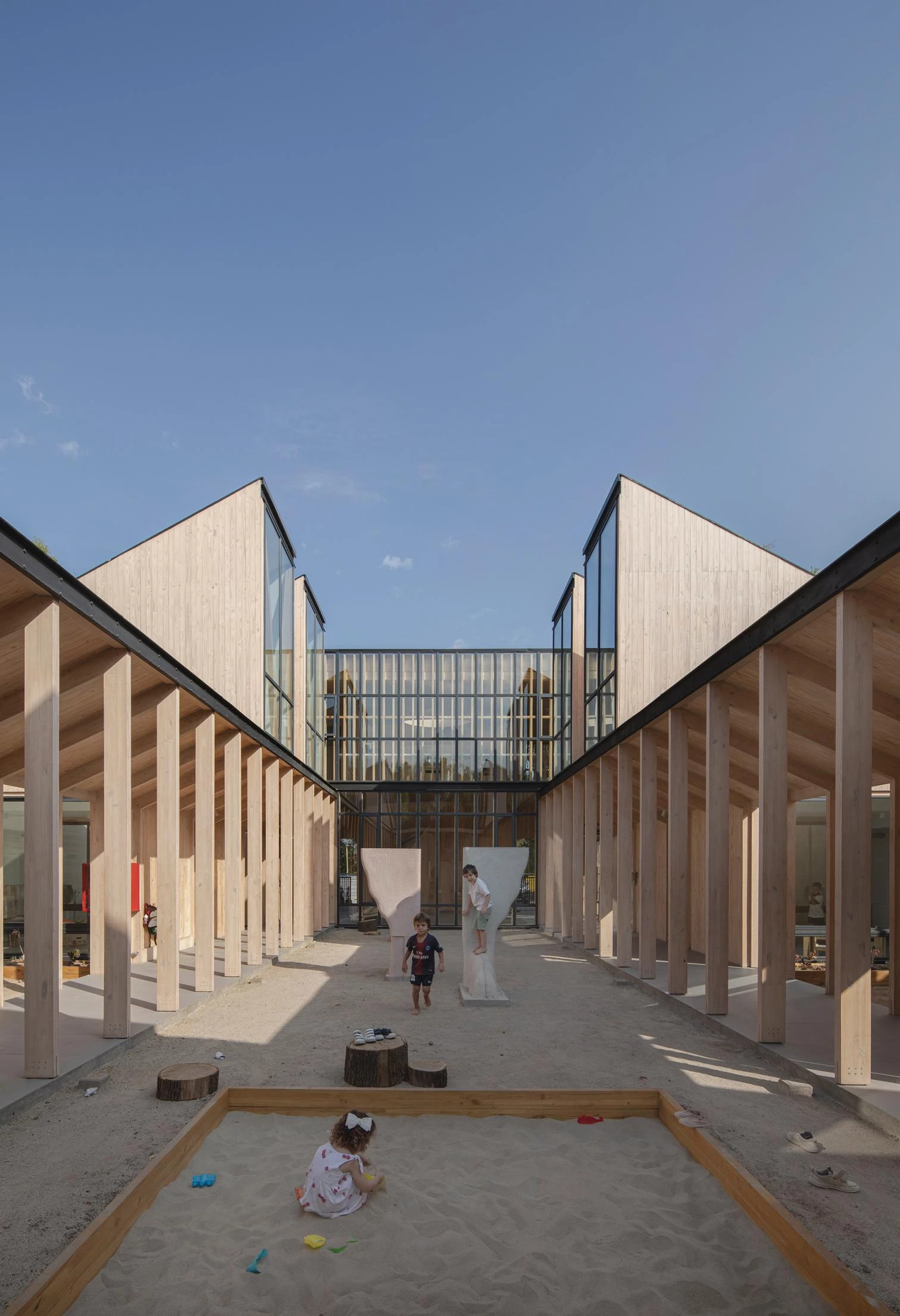 Un conjunto de volúmenes elementales fácilmente reconocibles por los niños se vuelca hacia un patio porticado para asegurar un ambiente de aprendizaje sin distracciones externas.