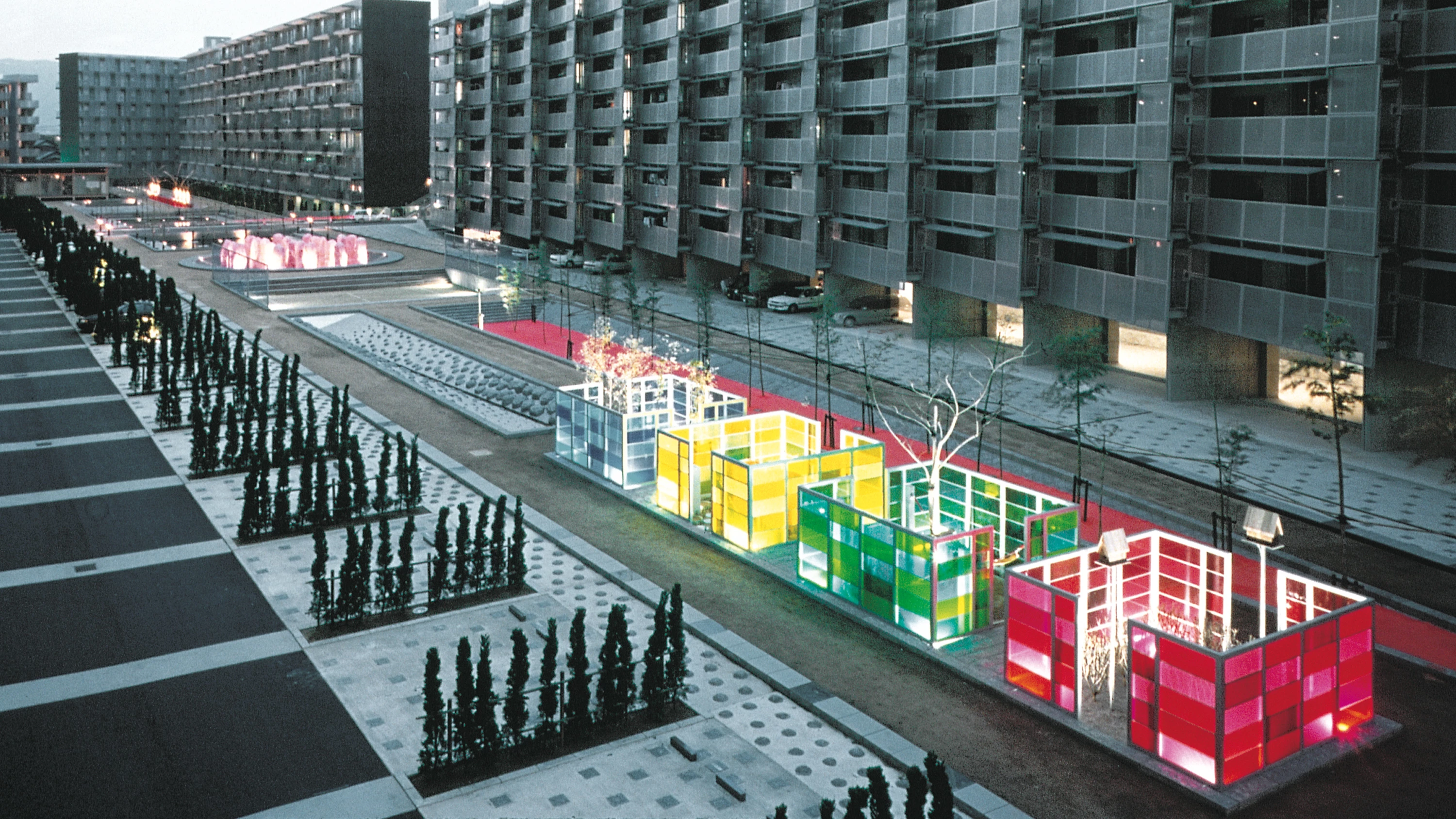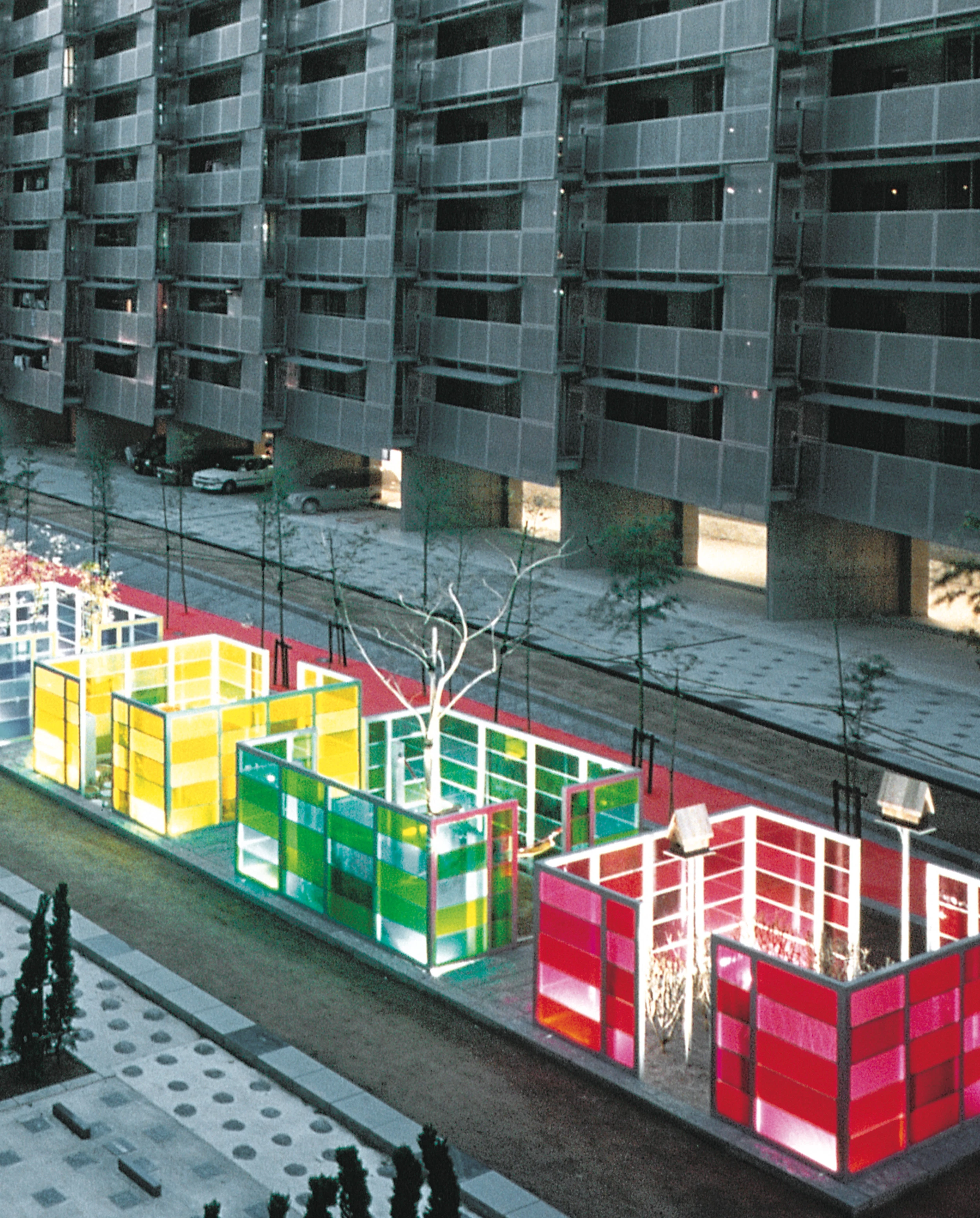 El paisaje de arrozales que ocupaba la zona hasta que se construyeron las viviendas—marcado por un patrón geométrico de diques de contención y campos de cultivo inundados de agua— fue la imagen que guió el diseño del patio de manzana. El vacío entre bloques se organizó a partir de una serie de espacios rehundidos que ofrecen distintas posibilidades para la actividad y el descanso, combinando elementos acuáticos, parques infantiles y arte público en una secuencia de episodios autónomos. El plano del suelo se eleva así 2,5 metros sobre el terreno para separarlo de la zona de aparcamiento habilitada en la planta baja de cada bloque y acercar el jardín a las viviendas. Una pasarela de madera cruza en la parte central un estanque plantado de sauces y vegetación propia de zonas pantanosas, dividiendo el patio en dos mitades equivalentes y prolongando el eje peatonal que atraviesa la manzana. De proporciones alargadas, la parte oriental del jardín tiene sus puntos álgidos en una piscina circular de rocas donde los niños pueden jugar con el agua que escupen unos menhires, y en los jardines de las cuatro estaciones, unos cubículos de vidrio de distinto color que recrean las condiciones lumínicas y vegetales de cada época del año. La sucesión de la zona este se completa con una pista deportiva, un huerto de bambú y un arroyo geometrizado en una diagonal de agua que cruza una alfombra de piedra. De mayor anchura y perímetro quebrado, la parte oeste del patio ofrece un canal plantado de iris, una pista de baile, un parque infantil rehundido en el que los toboganes se apoyan en los taludes, y un patio con los cerezos que la tradición japonesa ha elevado a la categoría de objetos artísticos. La arena amarilla, los alicatados de tonos fuertes y los colores vivos asignados a los distintos elementos insisten en el carácter artificial de este paisaje recreado que trae el recuerdo de la naturaleza hasta el corazón de la ciudad... [+]