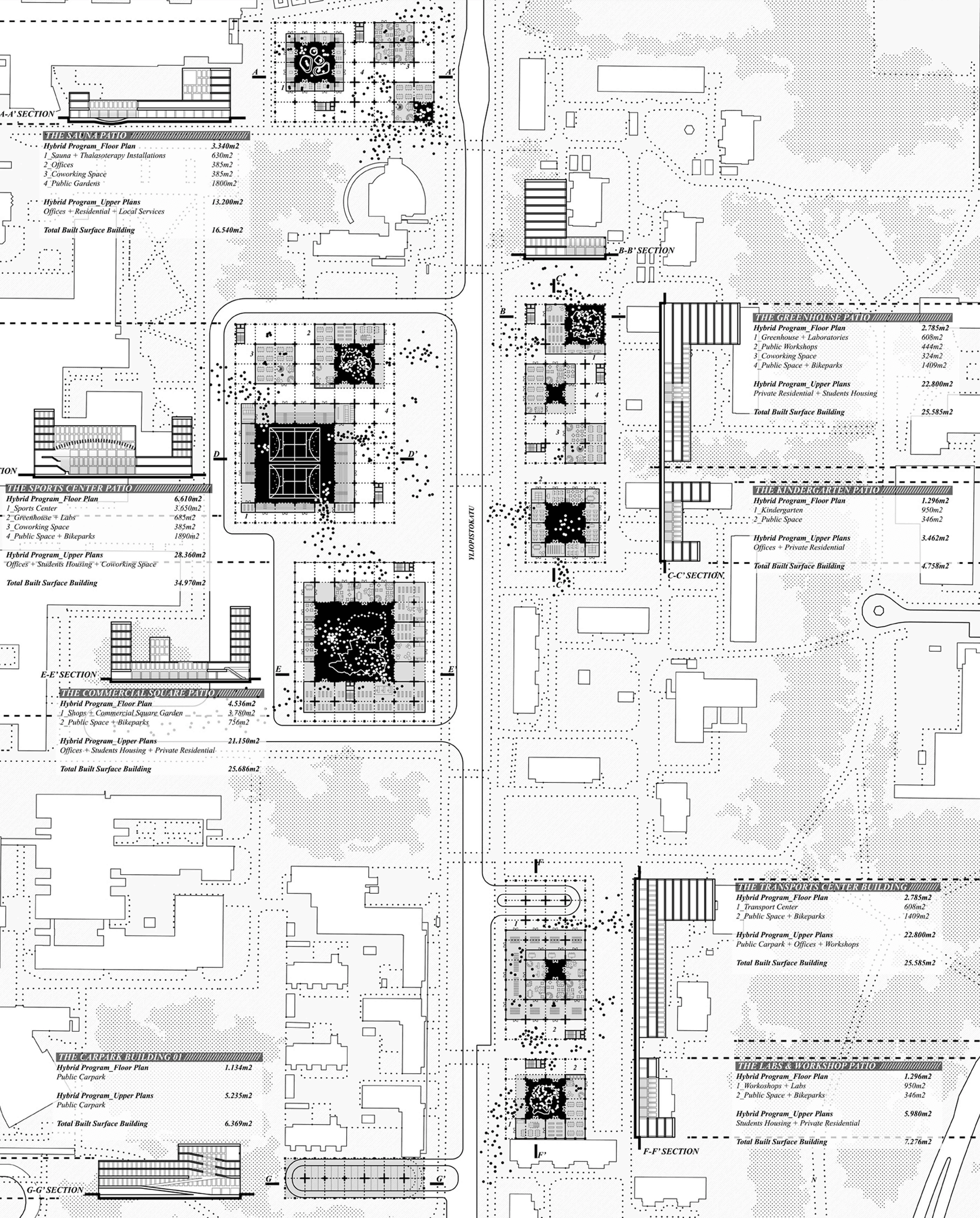 Los aparcamientos, huellas de un modelo urbano obsoleto, se interpretan en la propuesta como espacios de oportunidad para crear una ciudad más compacta y funcionalmente compleja, con arquitecturas porosas e híbridas fortalecidas por una red de patios programáticos... [+]