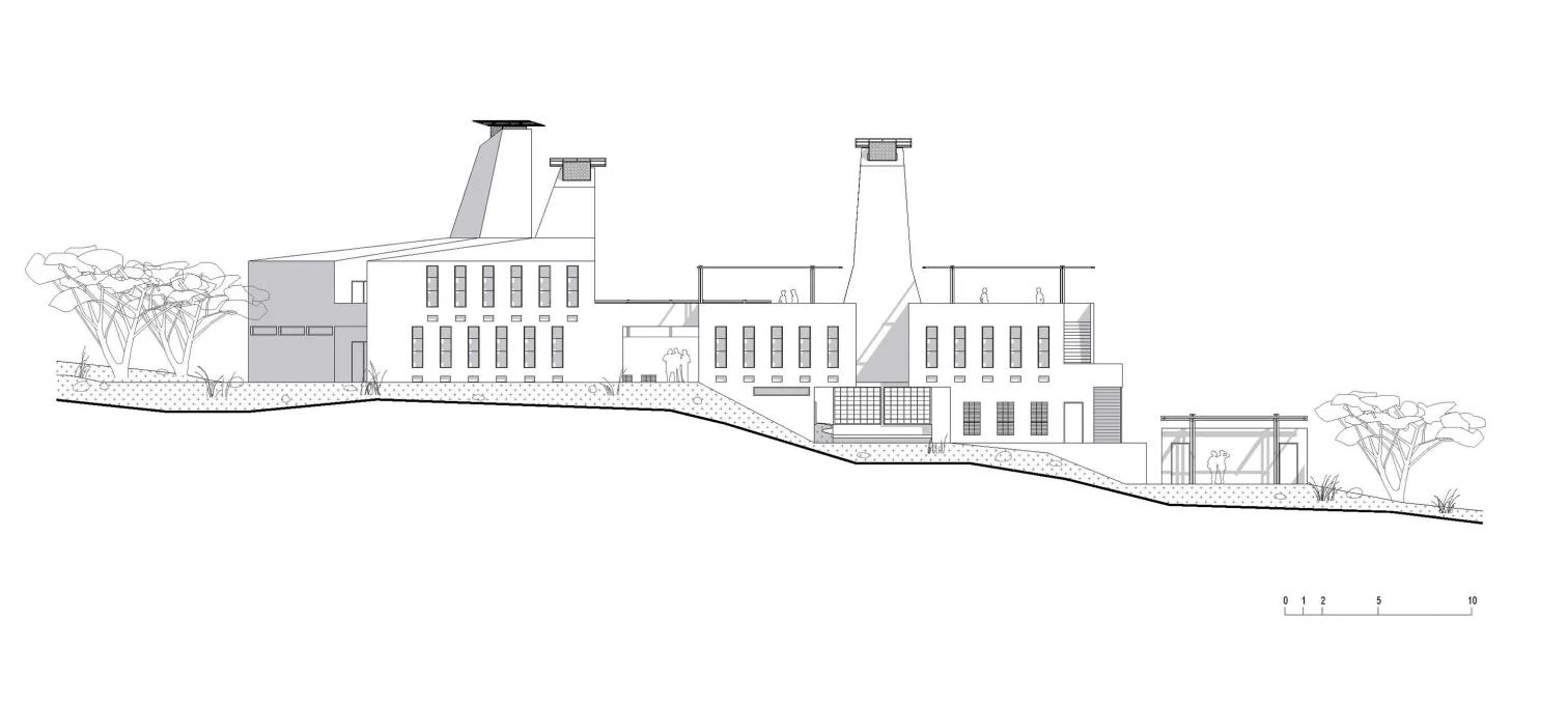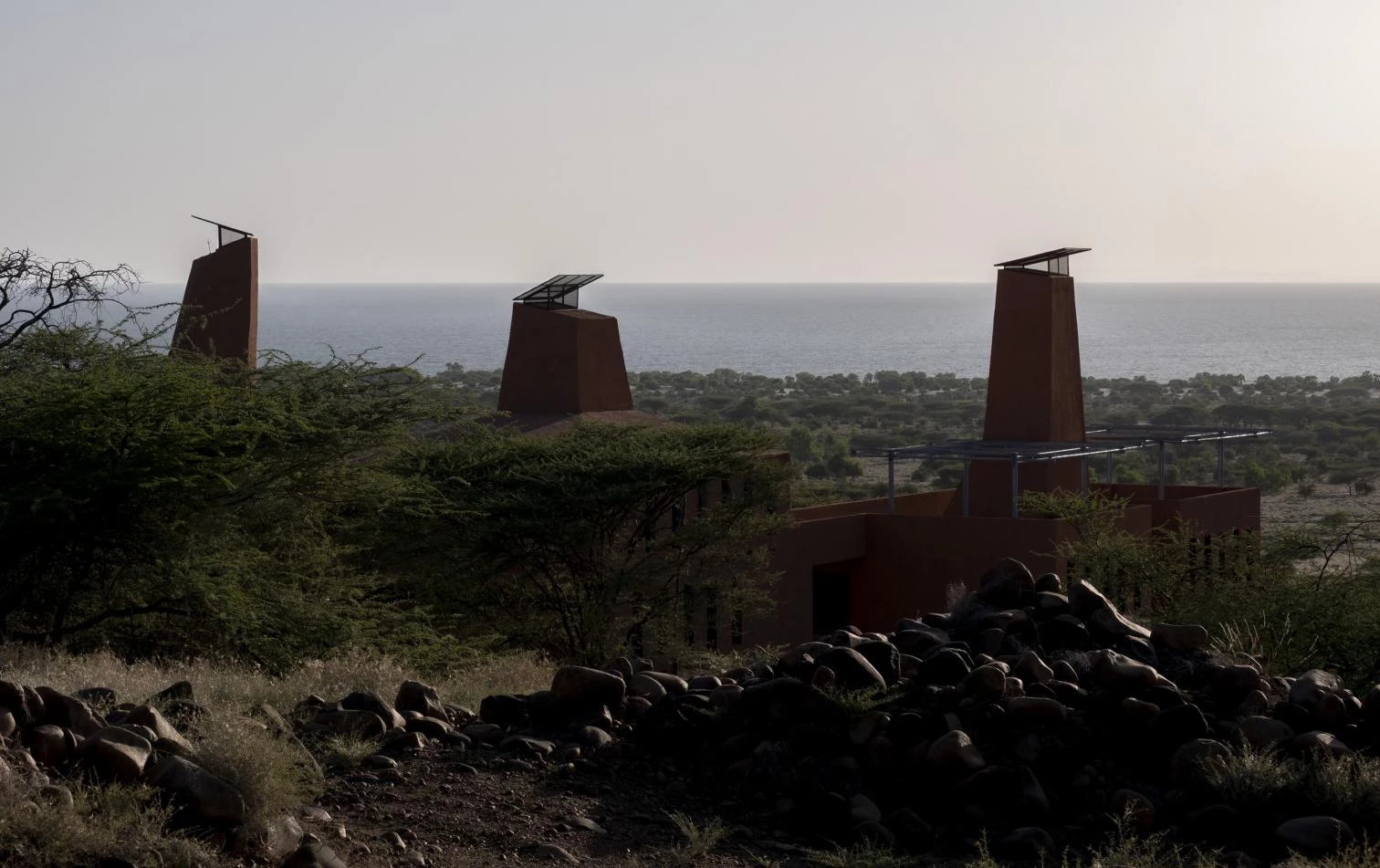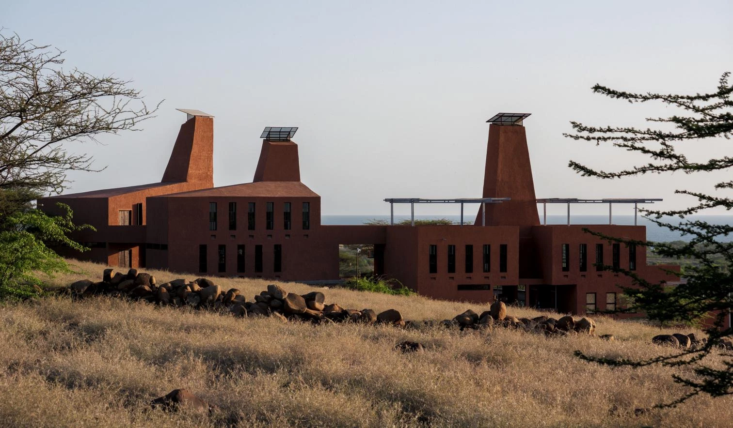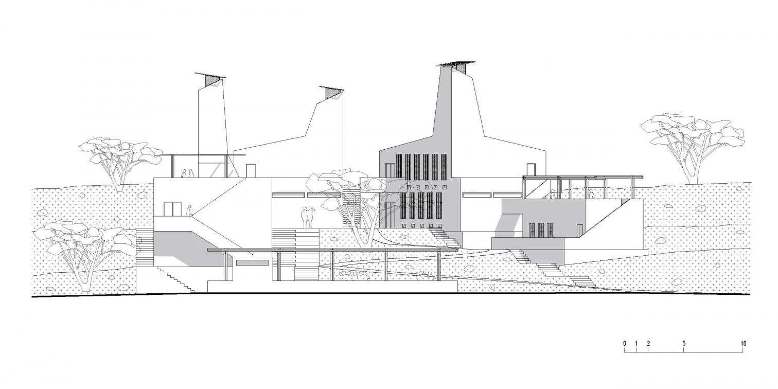 Hallando inspiración en los montículos que construyen las termitas en el entorno, el edificio aterrazado incorpora unas chimeneas de ventilación que mitigan las altas temperaturas y evitan la acumulación de polvo en los interiores.