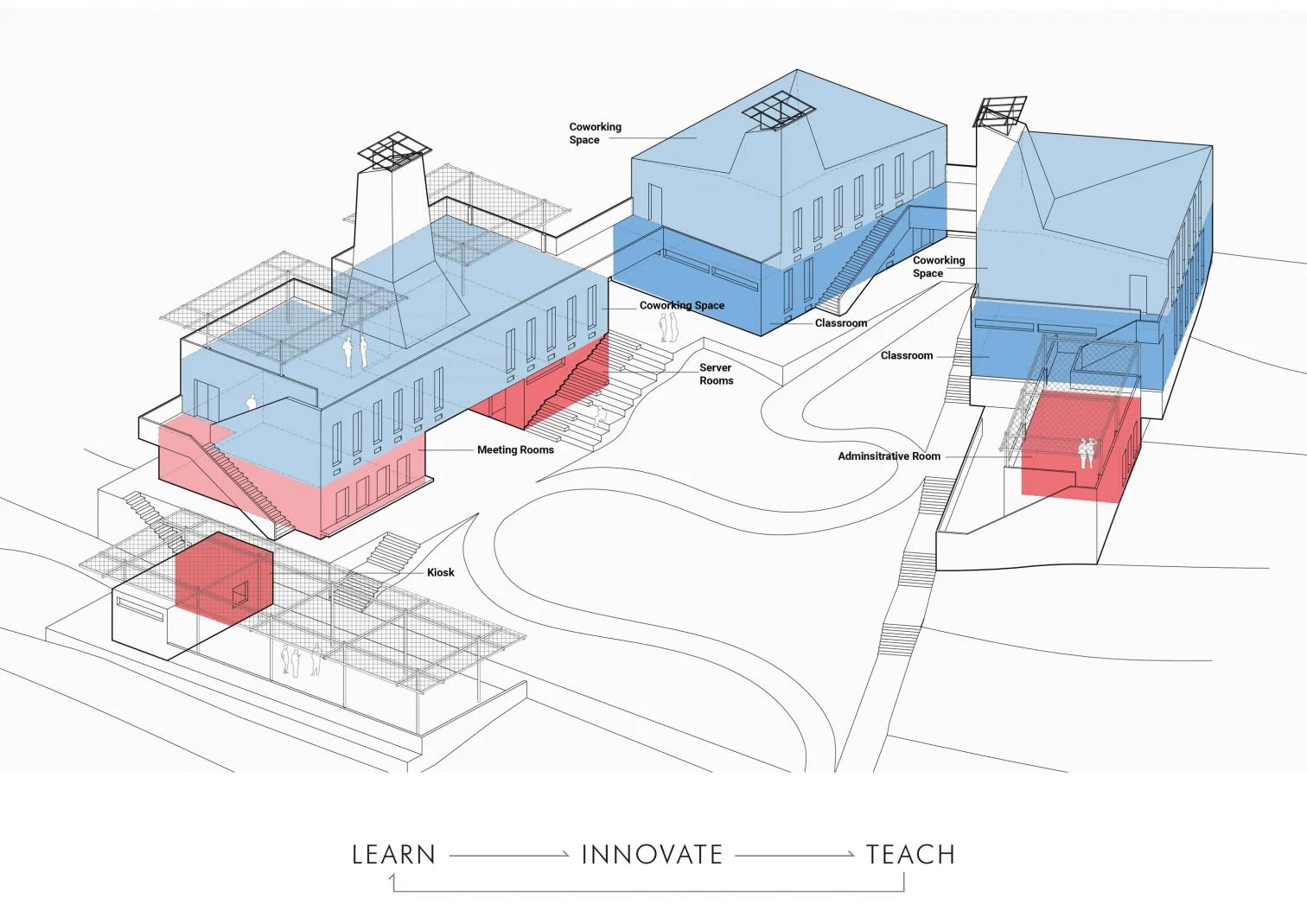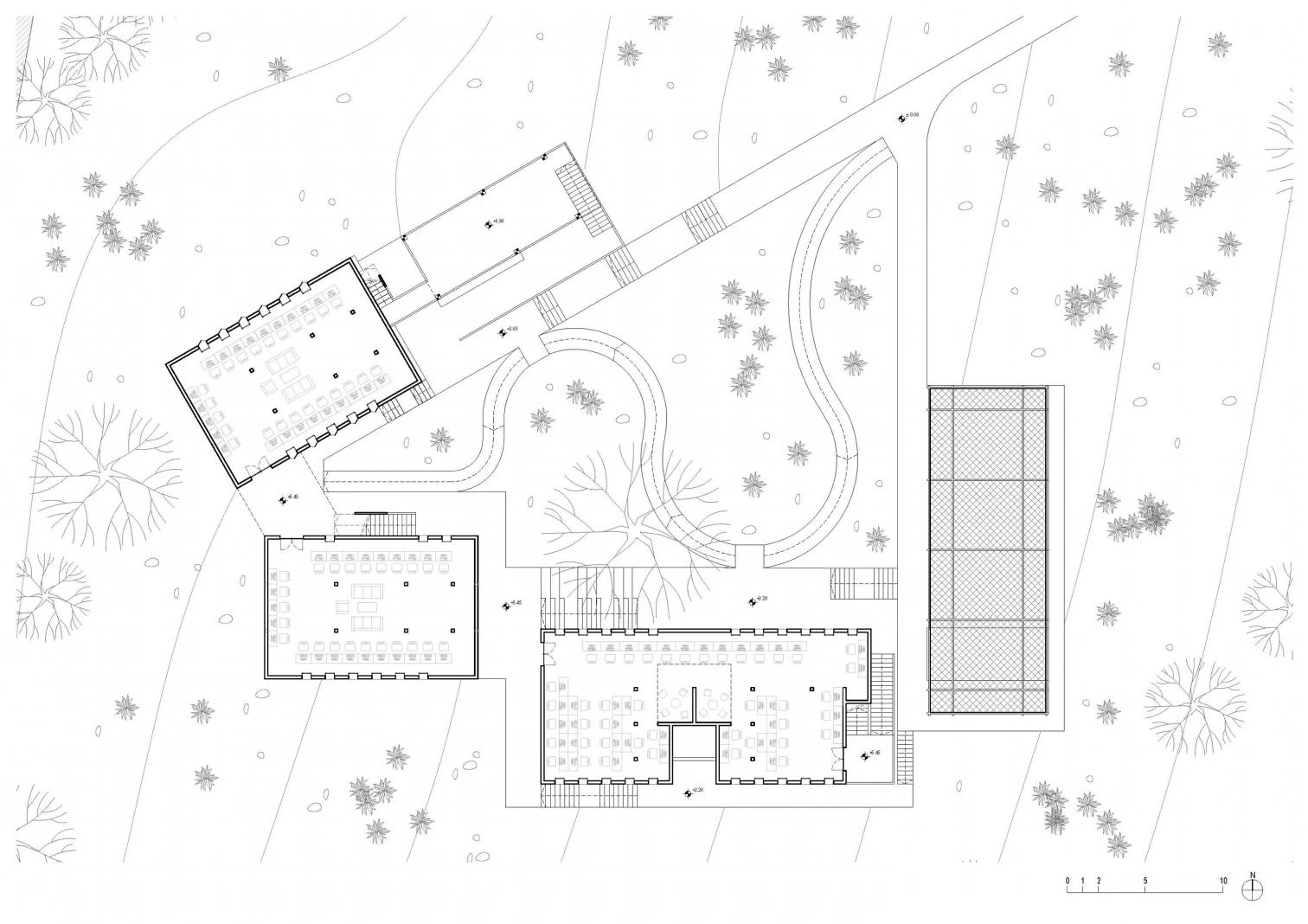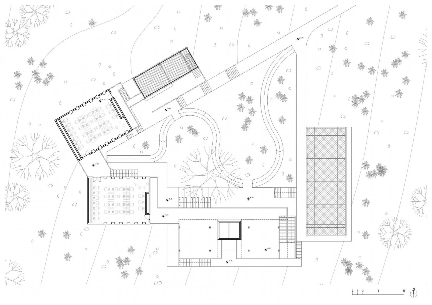 Construidos con piedra local enlucida, los cinco edificios de clases y talleres se adaptan a las irregularidades del terreno repartiéndose en varios niveles en torno a un patio central al que se abren generosas terrazas.