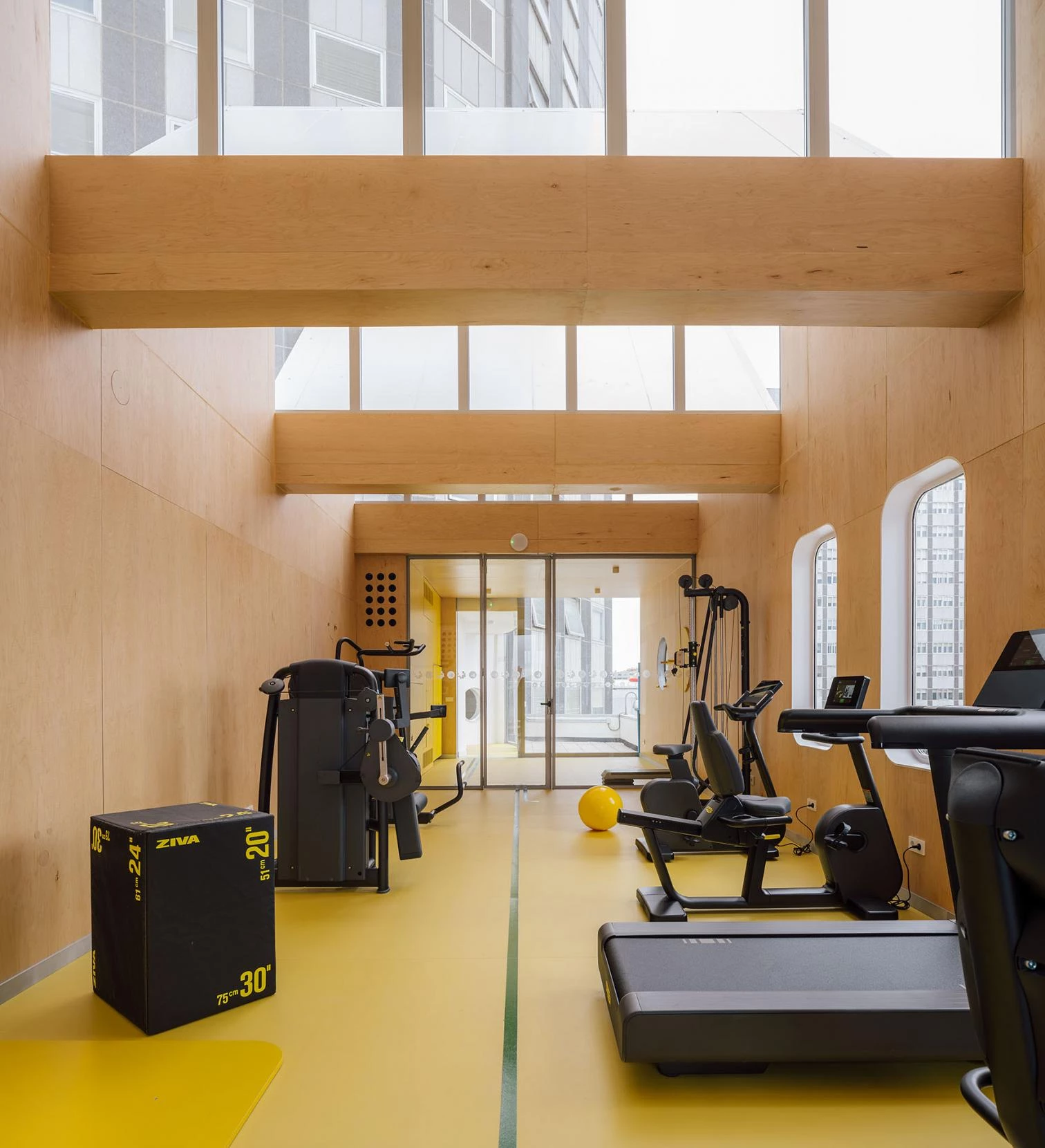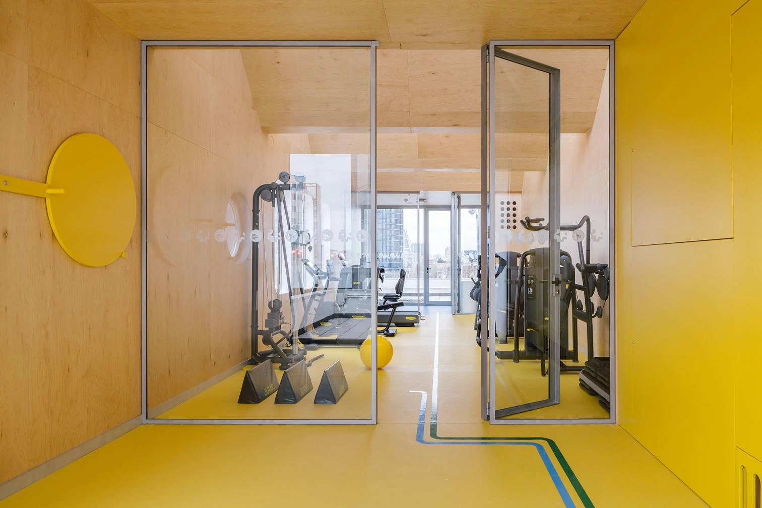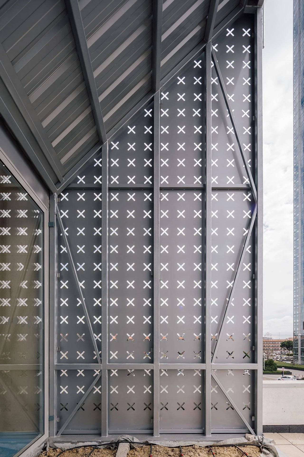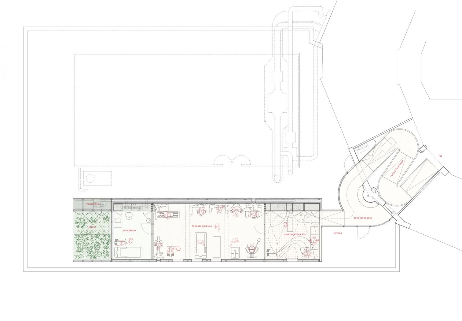 Con una estructura metálica, paneles sándwich y tableros en contrachapado de madera, los distintos módulos prefabricados de este primer prototipo se construyeron en una nave en dos meses, y se ensamblaron in situ en diez horas. El pabellón está conectado con la segunda planta de la torre de materno-infantil, a través de una rampa de madera. Entre las salas de ejercicio se encuentra la de mayor tamaño, iluminada con tres lucernarios orientados a norte. Una terraza exterior cubierta contiene un pequeño jardín de especies autóctonas. El pabellón contiene todo el cuerpo de instalaciones en su interior, y solo se conecta a la red existente de agua, la electricidad y los gases medicinales del hospital.
