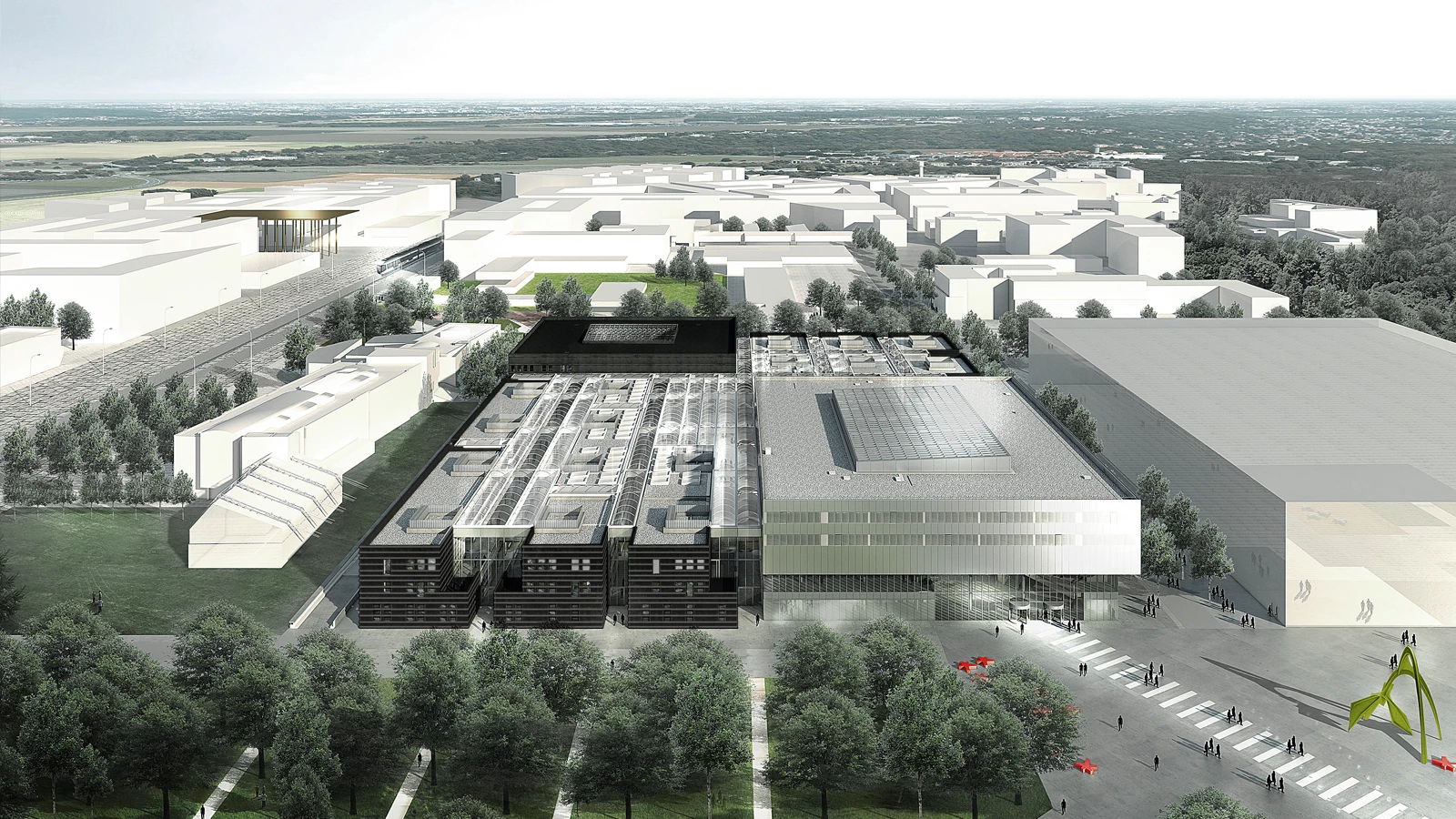 Situada en el extrarradio de la capital francesa, la École Centrale Paris es una de las más antiguas y prestigiosas escuelas de ingeniería del país. Como parte de un proceso de reestructuración interna, la escuela convocó en 2012 un concurso para la creación de una nueva sede universitaria situada en el suburbio parisino de Saclay. Bajo el concepto de ‘Lab City’, el proyecto formula una variante a la distribución lineal mediante largos pasillos que suele caracterizar tipológicamente los edificios educativos y de investigación, debido a las restrictivas condiciones de aislamiento que precisan los laboratorios. En lugar de enormes construcciones aisladas y cerradas en sí mismas, el proyecto fragmenta el programa en departamentos y los distribuye en las pequeñas parcelas de una retícula territorial que se extiende por el solar, como si formase una ciudad con calles y edificios de escala amable. Este modelo permite, también, una mayor independencia de las partes y, por lo tanto, introduce más flexibilidad a largo plazo. La trasposición de la escala urbana al campus incluye la creación de una avenida principal, que atraviesa diagonalmente el conjunto y une su centro con la estación de metro, de la que parten las calles secundarias. Una cubierta ligera y translúcida protege el conjunto y le otorga unidad.