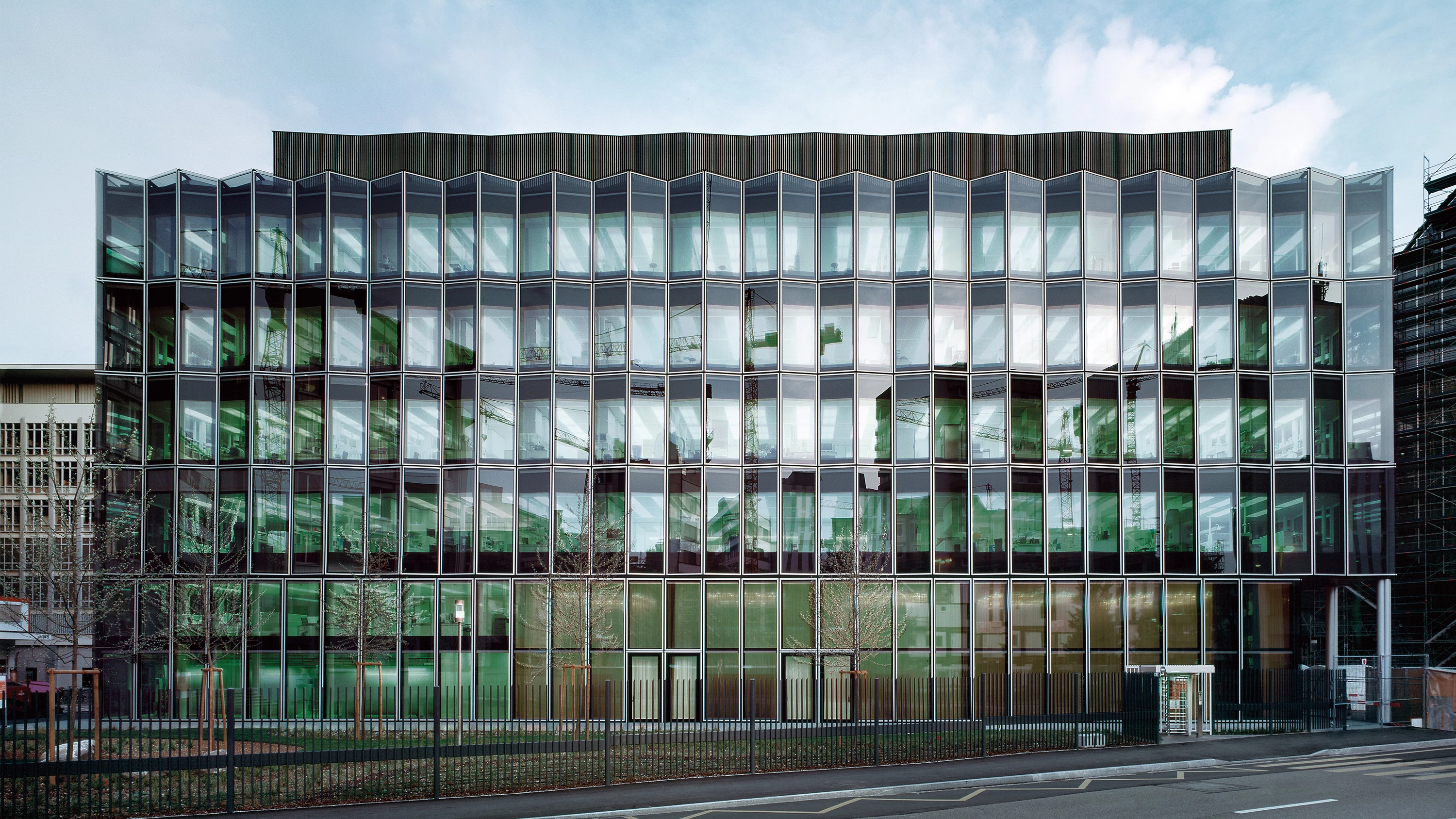 En coherencia con la claridad del concepto urbano, el volumen del edificio se pone al servicio de una continua economía del espacio, tanto en su interior como hacia el exterior, como un filtro mediante su fachada parcialmente transparente. El prisma resultante queda, sin embargo disuelto gracias a la aplicación de determinados recursos formales en las superficies y en la conformación de espacios, y se transforma visto desde el exterior en un ‘pabellón’ abierto y brillante. Los paneles oscilantes de la fachada crean con su estricto orden vertical una compleja ilusión óptica de transparencia, reflexión, fragmentación y ritmo. Los esbeltos pilares portantes de acero quedan insertos en los quiebros de la doble fachada; y desde el exterior el conjunto transmite la impresión de encontrarse ante una estructura textil, generando un frente de fachada dinámico que se corona con un remate zigzagueante.
