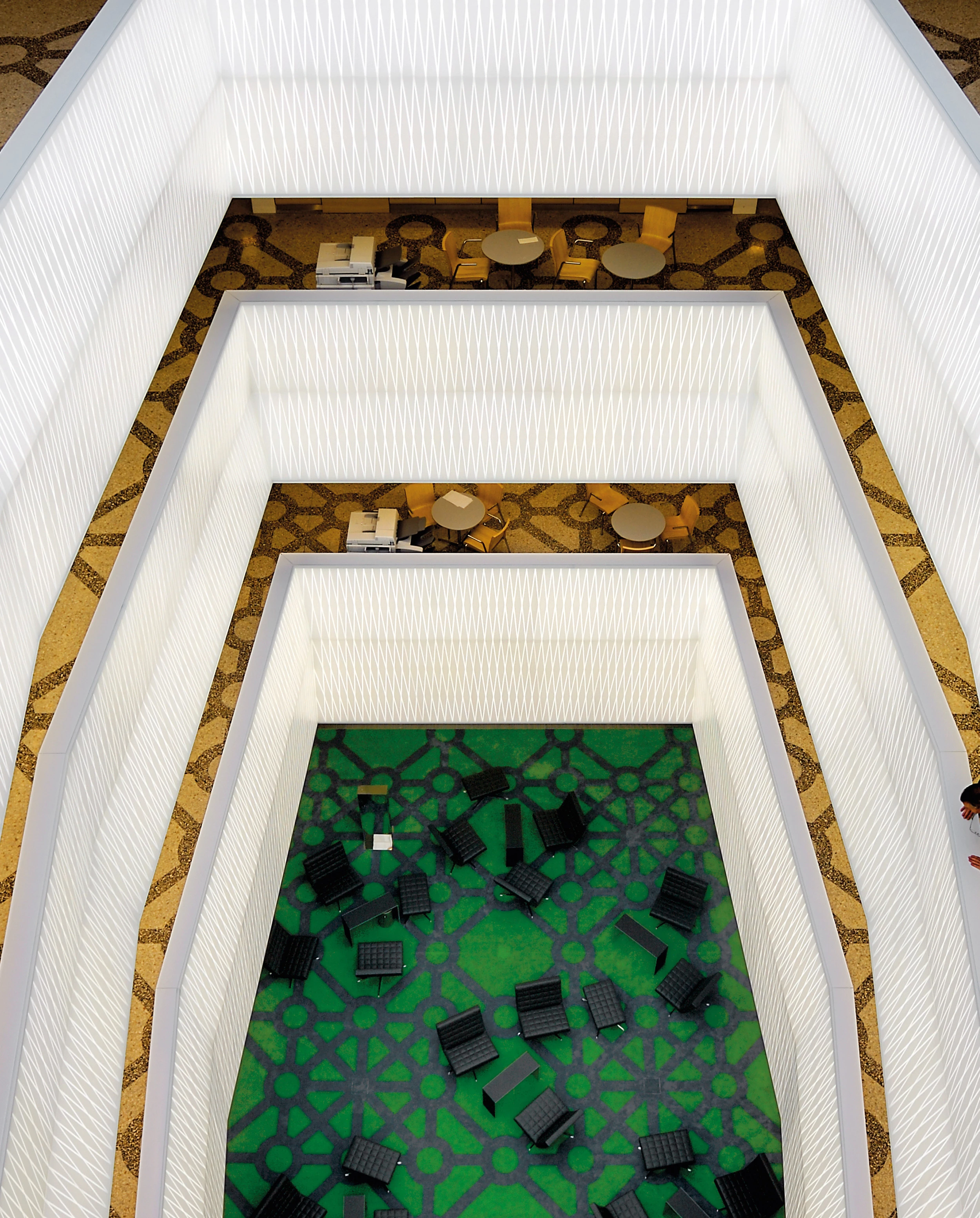 El interior alberga espacios de trabajo —laboratorios, despachos y salas de reuniones— así como funciones representativas.?El atrio central es el corazón simbólico del edificio, un elemento poco habitual en laboratorios, que contribuye a la comunicación entre el personal. Los petos que lo conforman están revestidos de paneles acrílicos retroiluminados con unos 10.000 leds, creando una superficie luminosa absolutamente homogénea.