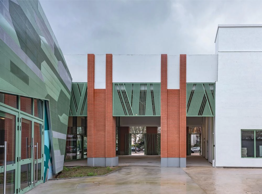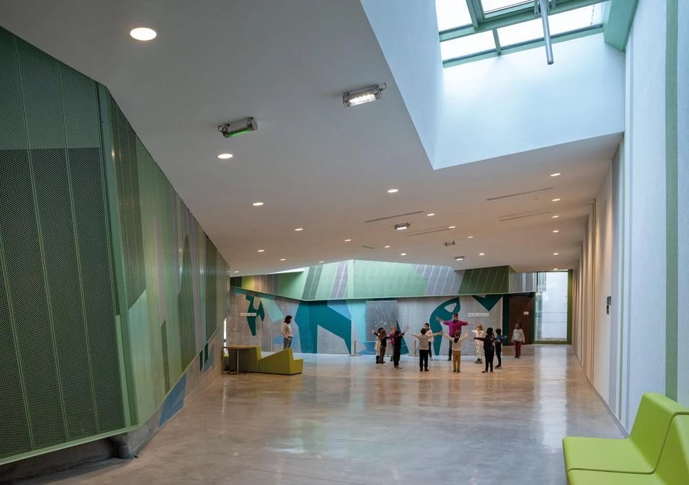 La actuación incorpora en diálogo dos nuevos volúmenes facetados envueltos por una doble piel que combina el hormigón visto, pintado en diferentes colores, y planchas metálicas perforadas. La renovación de la fachada hacia la calle genera grandes aperturas en un juego ritmado de opacidades y transparencias. La organización espacial favorece un uso continuo y simultáneo de actividades en el centro.