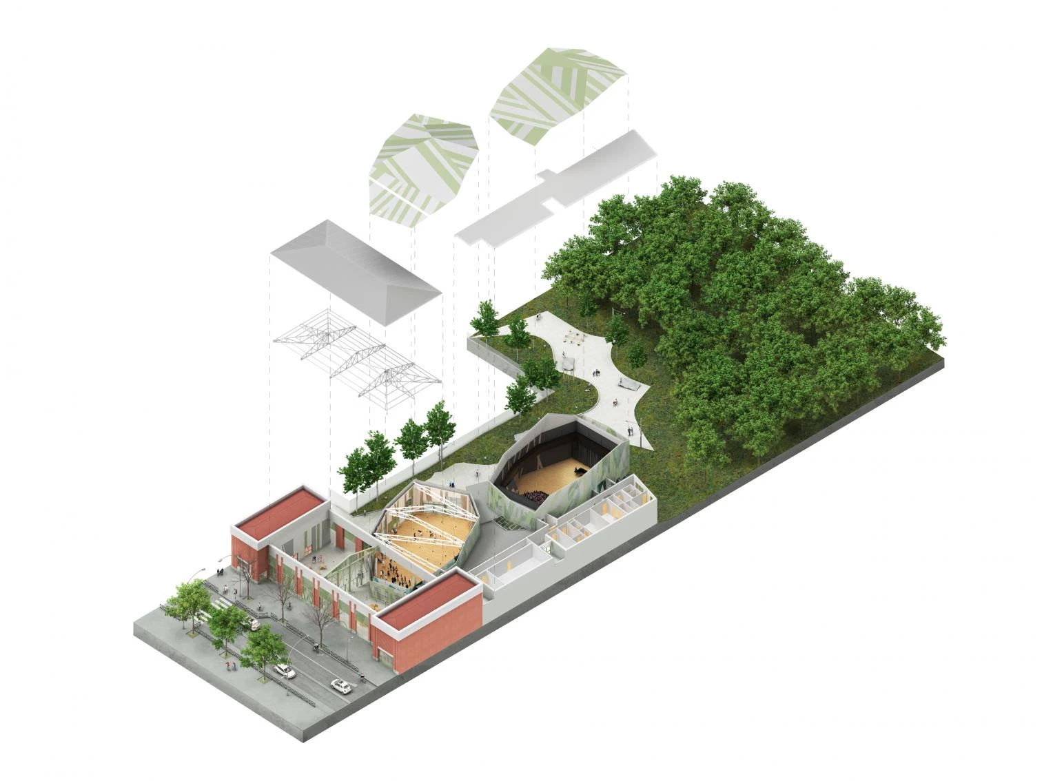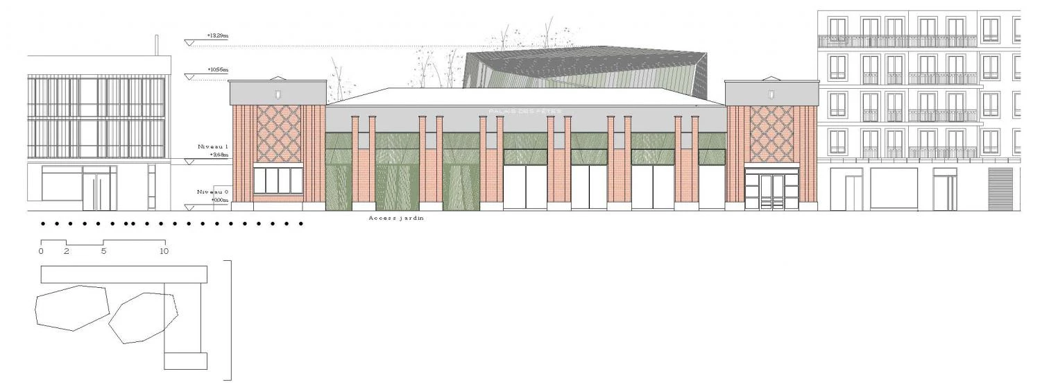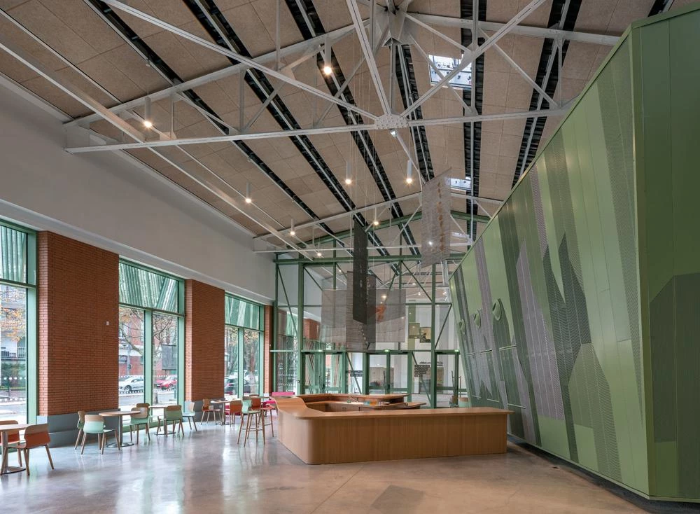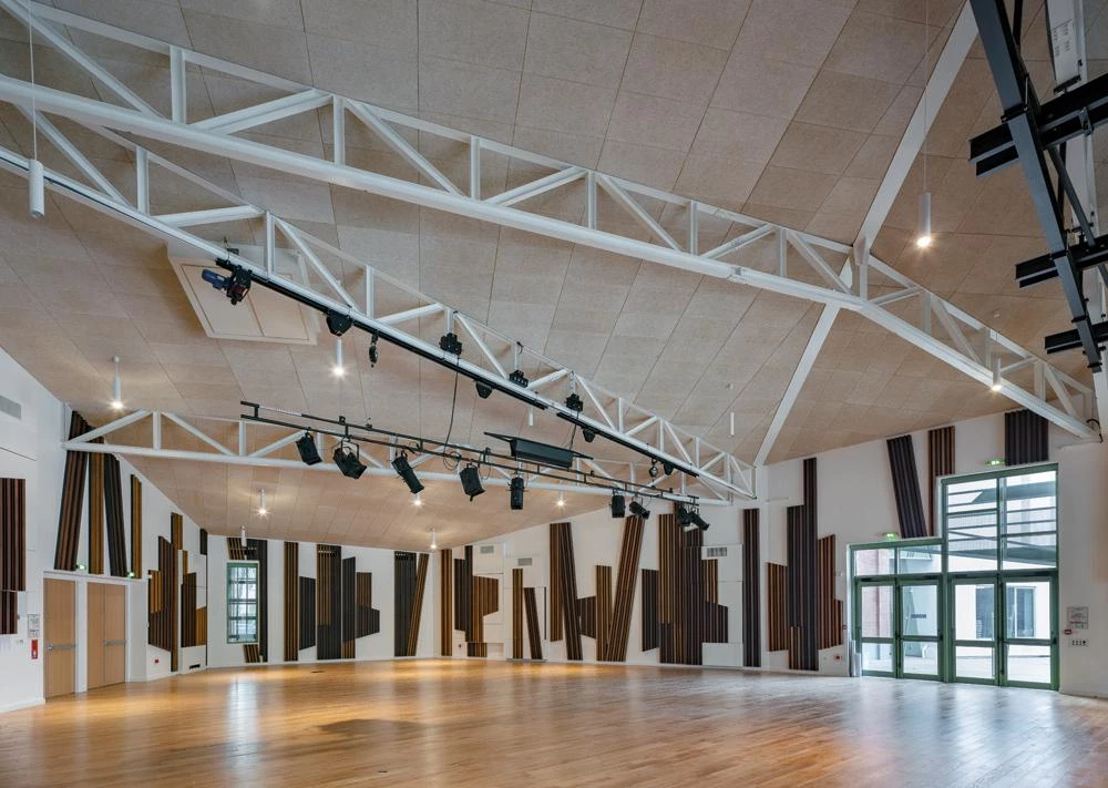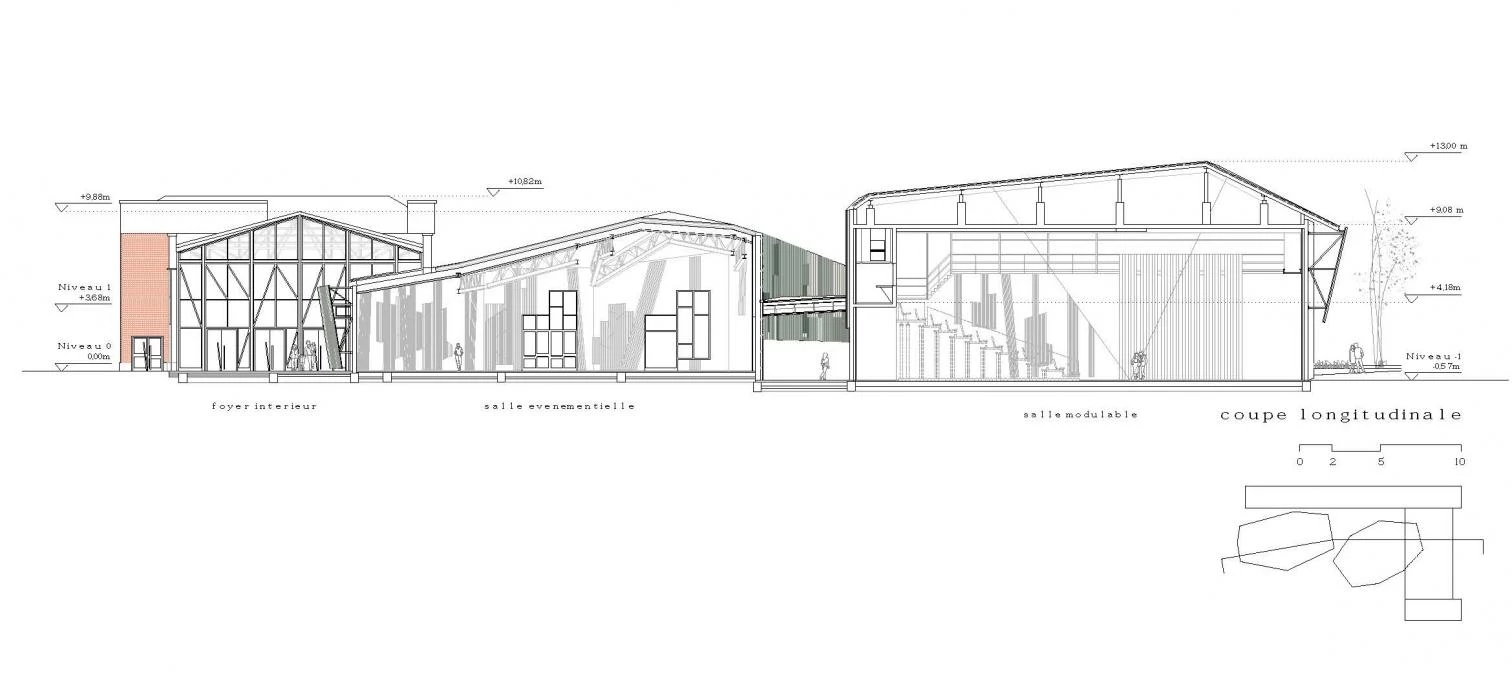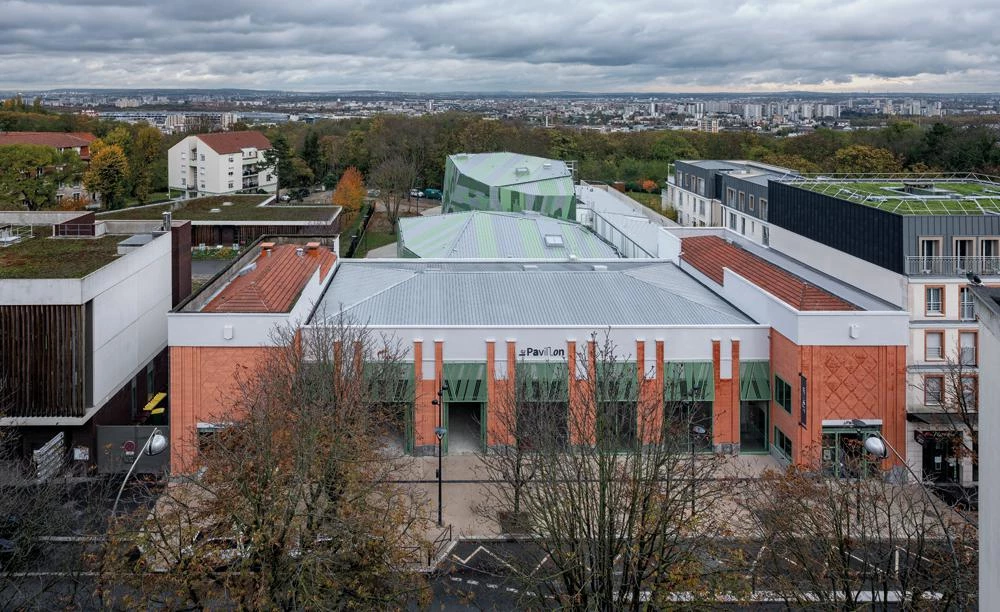Proyectada por la firma de Barcelona liderada por Benedetta Tagliabue, junto al estudio parisino ilimelgo architectes, la transformación de la antigua sala de eventos Le Palais des Fêtes de la ciudad de Romainville, situada a 10 kilómetros de la capital francesa, pone en valor la estructura histórica existente del Pabellón de Polonia que perteneció a la Exposición Internacional de las Artes y Técnicas Aplicadas de la Vida Moderna, celebrada en París en 1937.