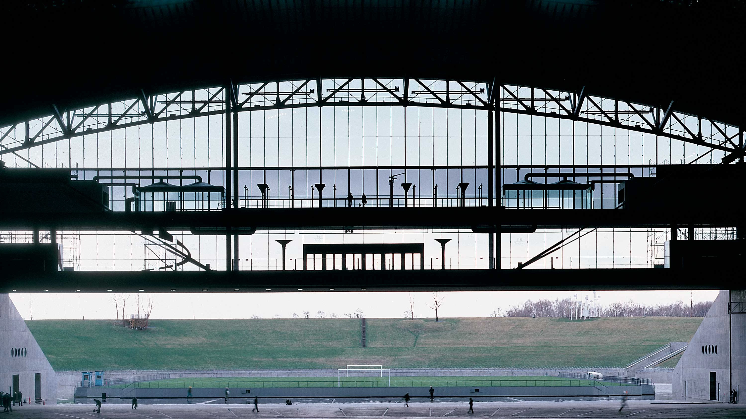 El campo de deportes respira habitualmente en el exterior y, cuando es necesario, como una topografía móvil o un gigantesco overcraft, se desliza sobre su cama de aire hacia el interior del estadio, accede por su lado menor y, una vez dentro, gira 90º hasta encajar entre los graderíos móviles y giratorios (4.000 asientos complementarios que colmatan el espacio disponible para el aforo). Todos los espectadores pueden disfrutar de una visión completa del espacio, sin interrupciones, específicamente adaptada a los diferentes condicionamientos de un concierto multitudinario, un partido de béisbol o un encuentro de fútbol entre Inglaterra y Argentina. Y la propia adaptación a cada uso es ya de por sí un evento digno de ser contemplado, una maniobra casi naval cuya duración no es en ningún caso superior a las dos horas. Hara ha incluido elementos formales ya ensayados en proyectos anteriores, que dan al conjunto una complejidad aparente y crean numerosos focos de atracción: recorridos quebrados que facilitan los efectos sorpresa; colores vivos y materiales lujosos; miradores imposibles; puentes hacia el exterior; observatorios, pórticos y galerías; zonas comerciales y de encuentro; servicios anejos; elementos escultóricos y chimeneas de aireación que son casi la firma de su autor. En suma, una ciudad completa con sus calles y sus plazas, una ‘carcasa serena’ sobre la nieve, un ‘jardín de sonidos’ que remite a la obra homónima del compositor Toru Takemitsu: escuchar música es lo más parecido a pasear por un jardín.