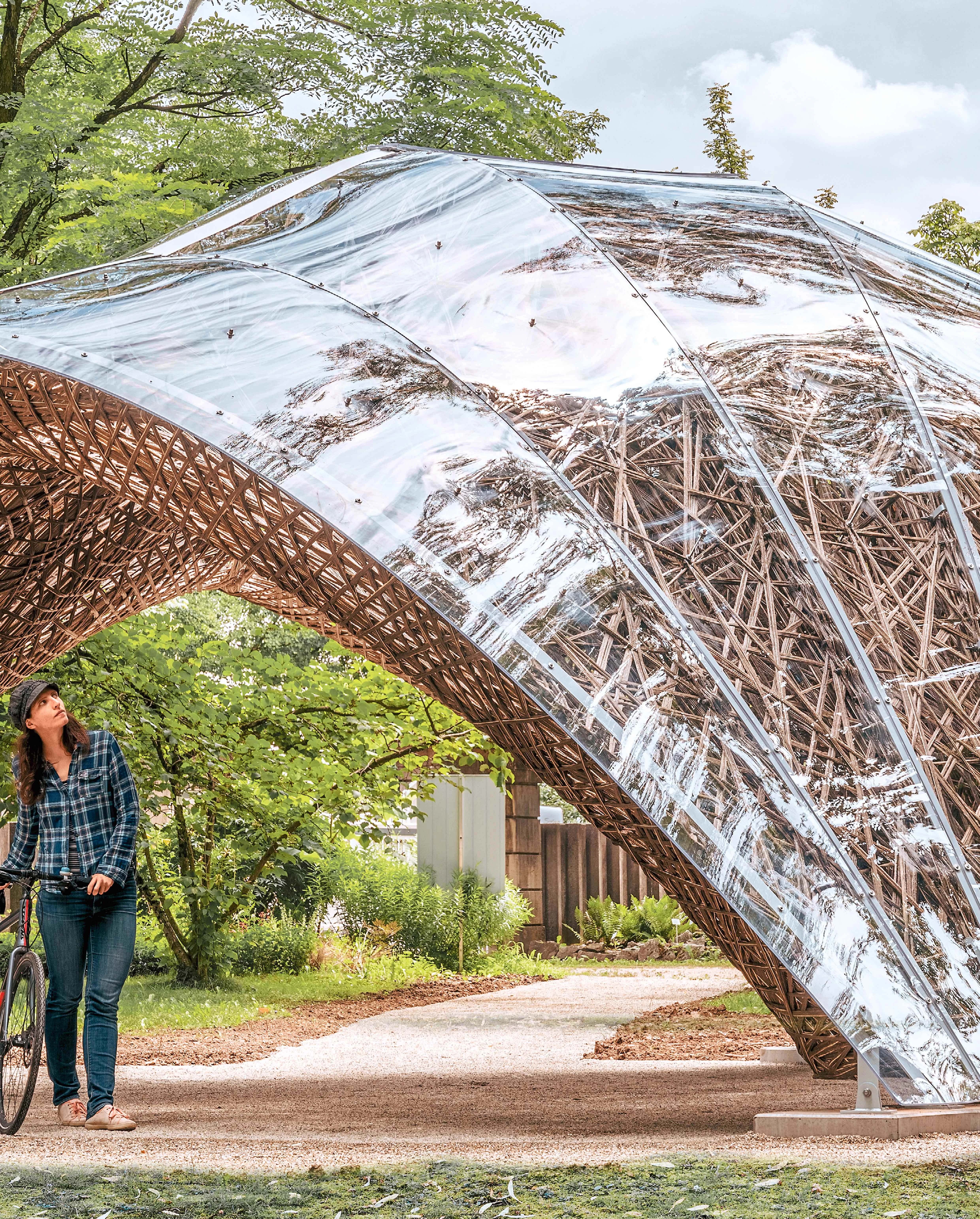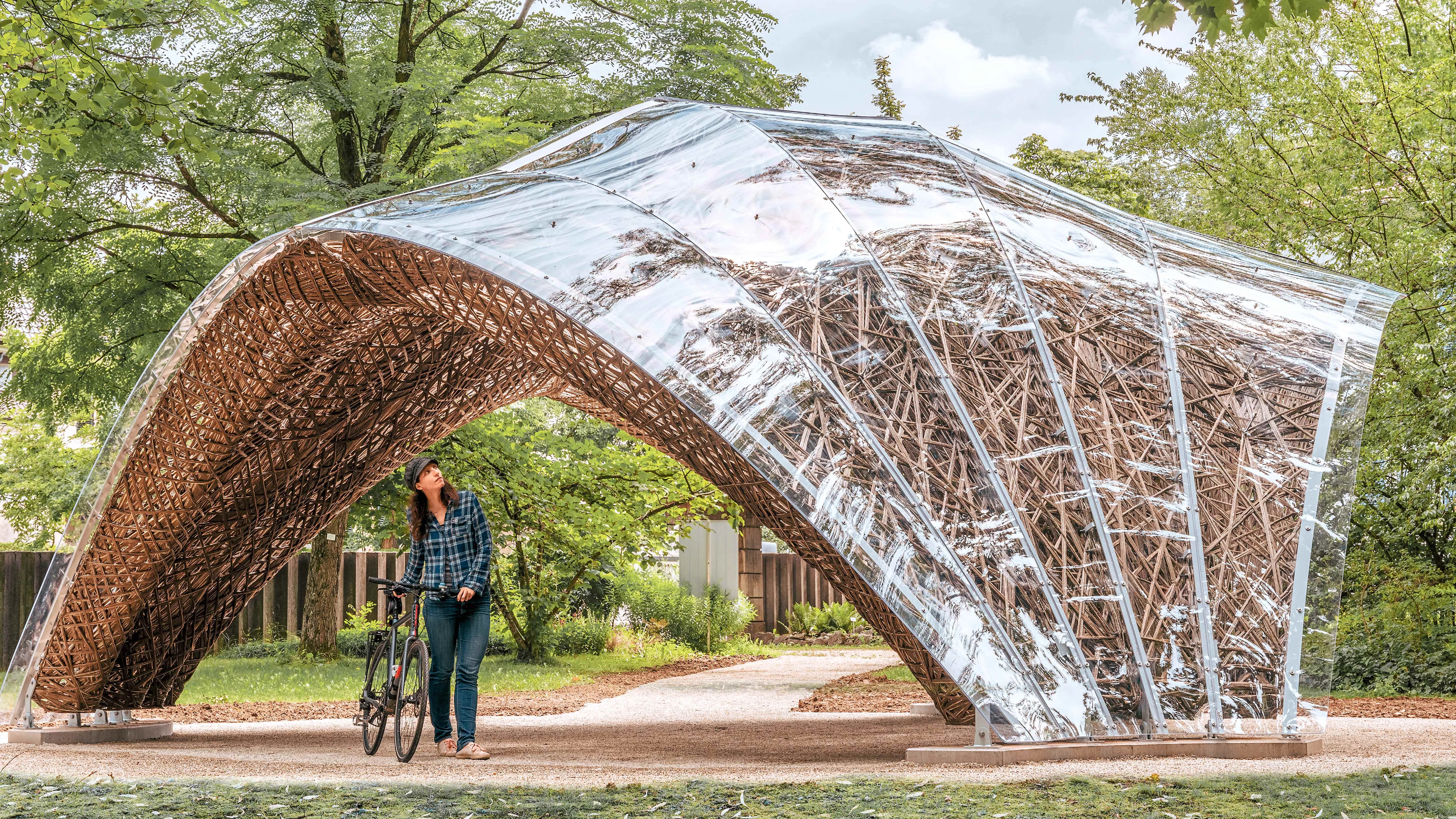 El pabellón bioinspirado muestra cómo los procesos que reparan en los requisitos geométricos, ambientales, estructurales, de producción, materiales y estéticos, junto con técnicas de fabricación robótica usando componentes naturales, generan obras ecológicas y expresivas...[+]