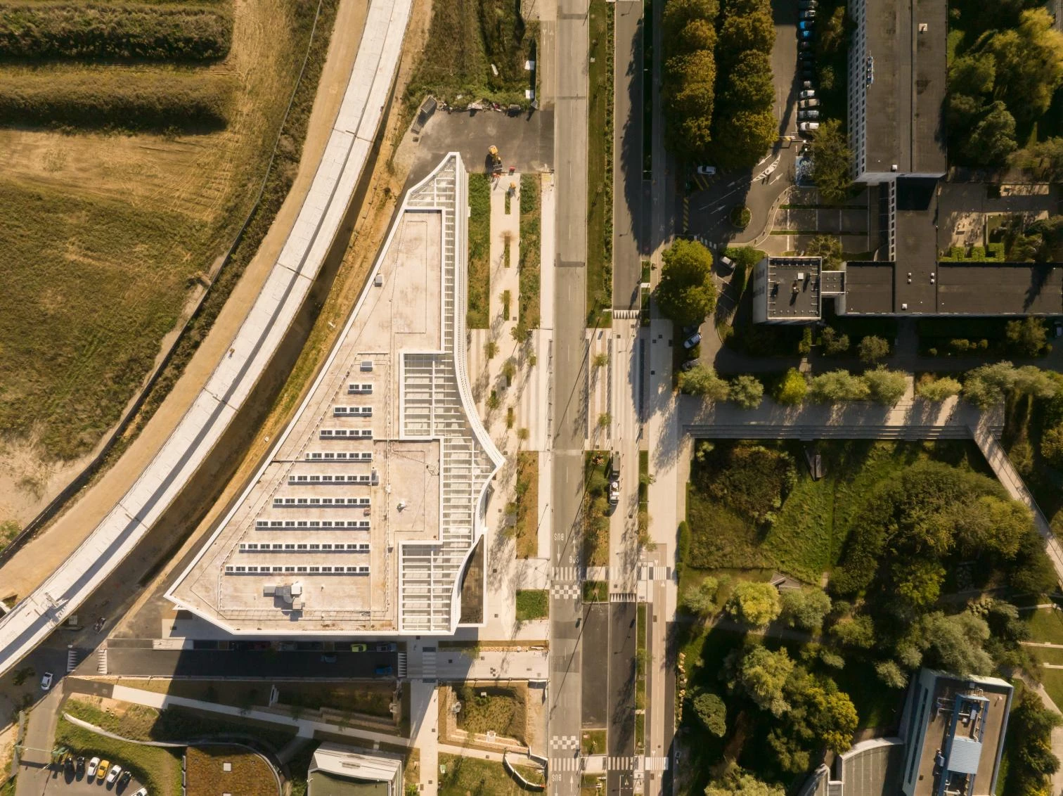 Ubicado entre la avenida principal del campus y la zona residencial universitaria, el proyecto busca ofrecer un edificio abierto y permeable, que invite a los estudiantes a un espacio de convivencia, investigación y trabajo de fácil uso y recorrido interior continuo. La posición y geometría triangular del solar venía marcado por la ordenación del campus, así como por el trazado curvilíneo de la línea de metro aéreo situada al norte.