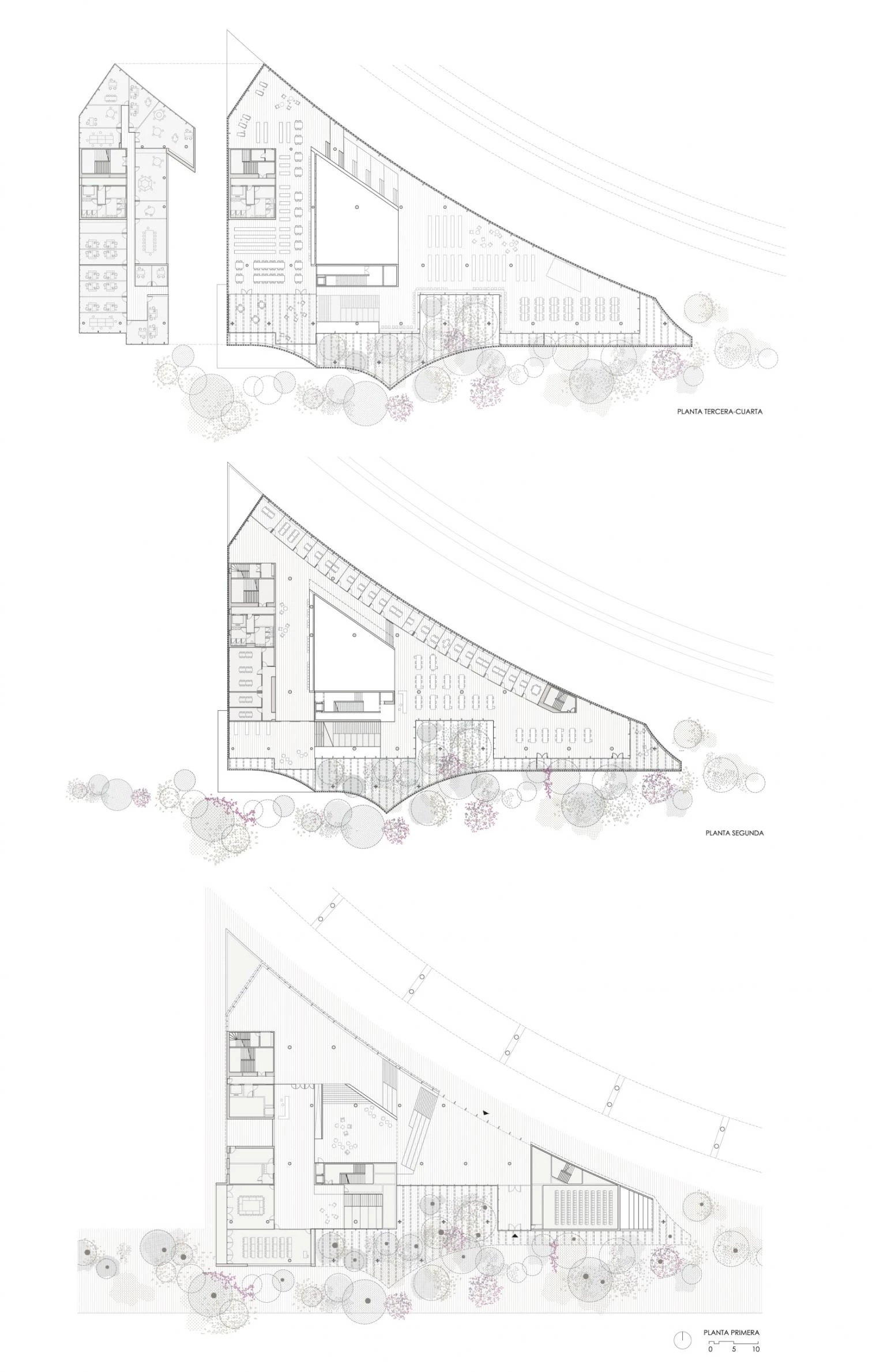 La permeabilidad de la planta baja refuerza el tránsito de personas desde la cercana estación del metro. El acceso se convierte en un espacio intermedio cuya vegetación genera un paisaje en estrecha relación con la avenida principal del campus y con los jardines Argenté, fomentando así la continuidad entre exterior e interior. En esta cota se disponen dos amplios graderíos para generar un nuevo espacio de relación y un lugar de trabajo distendido. Uno de ellos se sitúa en el espacio exterior cubierto, orientado hacia la estación, marcando así la entrada al edificio. El otro, en el interior, invita a un recorrido ascendente hacia los niveles superiores. Hacia el norte y en paralelo al viaducto elevado del metro, el edificio se muestra como un paisaje, pudiéndose apreciar desde el exterior las actividades que tienen lugar en el foro —proyecciones audiovisuales, exposiciones, etc.—.