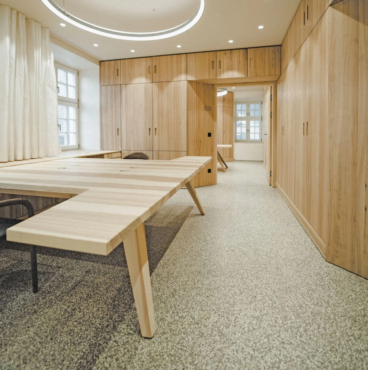 La firma alemana liderada por Manfred Lux ha sido la encargada de renovar el edificio del Ayuntamiento del municipio bávaro de Burtenbach, cuya primera mención histórica data de 1558. El edificio ha sido modificado a lo largo del tiempo, siendo significativamente reformado en 1972. Combinando el trabajo tradicional de artesanos locales con técnicas contemporáneas de producción, la intervención general aprobada en 2015 y finalizada en 2019 buscaba recuperar su pasado histórico y emplear materiales locales: de origen calcáreo para suelos, techos y paredes; madera maciza de fresno para puertas, muebles integrados y la escalera principal que vertebra el edificio. El ambiente cálido resulta de mezclar colores de tierra natural del suelo de terrazo, los tonos crema de los elementos enlucidos y la madera, aplicando a los detalles técnicas artesanales y máquinas basadas en la tecnología que utiliza el control numérico computarizado o CNC. Además, en este proyecto los elementos de madera fueron creados sin uniones metálicas o encolados.