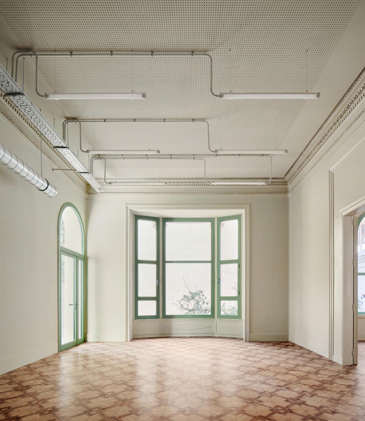 La intervención incorpora nuevos elementos construidos en madera, definidos por geometrías precisas y una paleta cromática controlada, que contrastan intencionalmente con la materialidad preexistente. Estos elementos se disponen de forma autónoma, sin alterar la estructura original, y alojan funciones específicas del programa. Los sistemas de ventilación e iluminación se mantienen a la vista y se integran al lenguaje arquitectónico, consolidando una intervención clara, legible y diferenciada entre lo nuevo y lo existente.