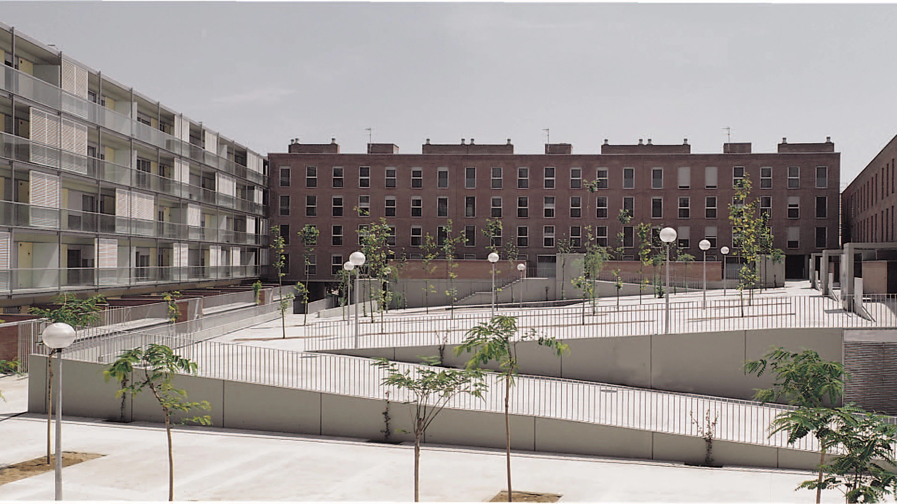 El volumen, conformado como una crujía regular que se ajusta a los bordes del solar, se rompe en uno de los laterales para dar paso a un patio interior desde el que se accede a todas las viviendas, como alternativa a las calles perimetrales con una sola fachada edificada. Asumiendo una condición casi urbana, esta gran superficie se trata como una plaza dura, animada mediante el despiece de los pavimentos y la vegetación plantada en hileras. Su división en dos planos ligeramente inclinados facilita el control visual del conjunto y permite salvar el desnivel de un metro respecto a la plataforma sobre la que se asienta la zona de viviendas en planta baja, correspondiente a las calles Karl Marx y Federica Montseny.