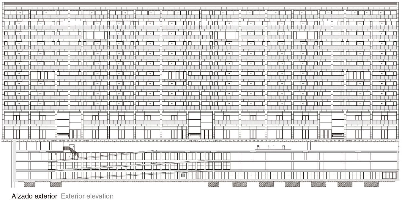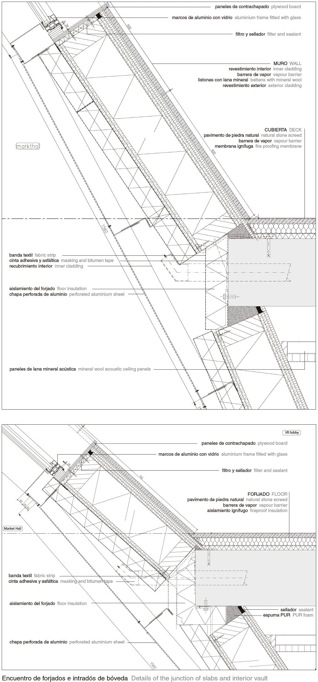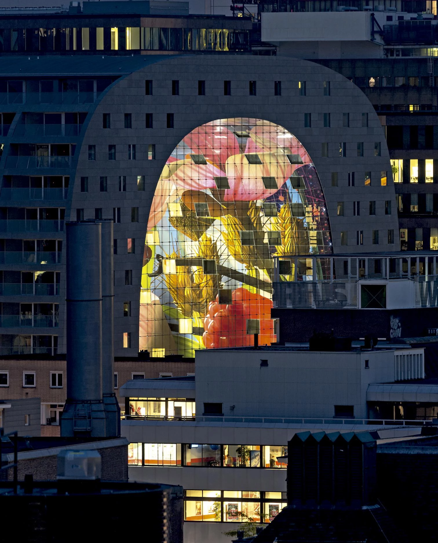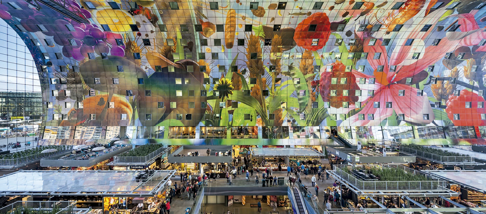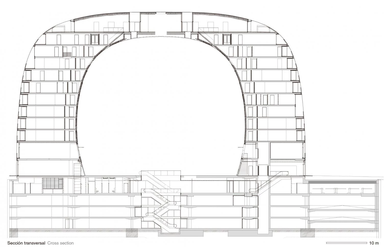El nuevo mercado del centro histórico de Rotterdam, caracterizado por su sección en arco de herradura con 40 metros de altura libre, ofrece una mezcla de usos diversos destinados a revitalizar el distrito de Laurenskwartier en el que se sitúa. Además de plaza de abastos, el edificio alberga comercio, restaurantes, viviendas y aparcamiento subterráneo, y su forma es la expresión directa de la separación programática y de las restricciones legales —la normativa europea obliga a cubrir los tradicionales mercados de carne y pescado por razones de higiene y salubridad—. De este modo, el proyecto emplea la imposición de la cubierta para dotar al edificio de todo el programa complementario, liberando el interior y fomentando, así, la ancestral cualidad de plaza y lugar de encuentro de los mercados.