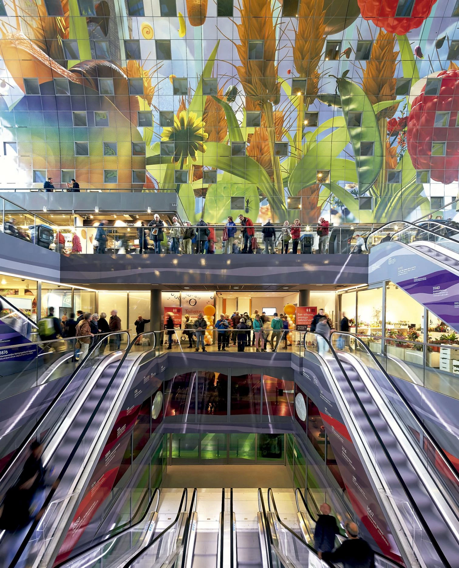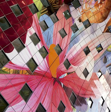 Las 228 viviendas que conforman este arco habitable, regidas por la estricta normativa holandesa, emplean doble fachada y sitúan la estancias principales hacia el exterior, orientando hacia el mercado las cocinas, zonas de almacenamiento y comedores. El intradós de la bóveda se cubre con un colorido e impresionante mosaico de frutas, flores y vegetales realizado por los artistas Arno Coenen e Iris Roskam cuyos 11.000 metros cuadrados conforman la obra artística más grande de los Países Bajos.