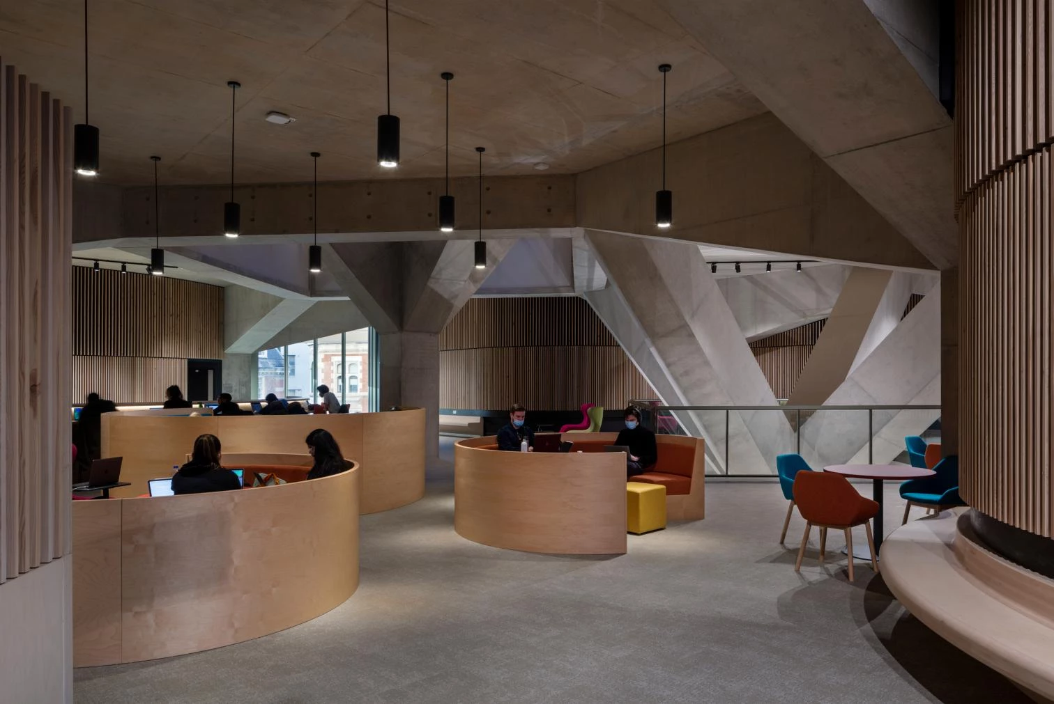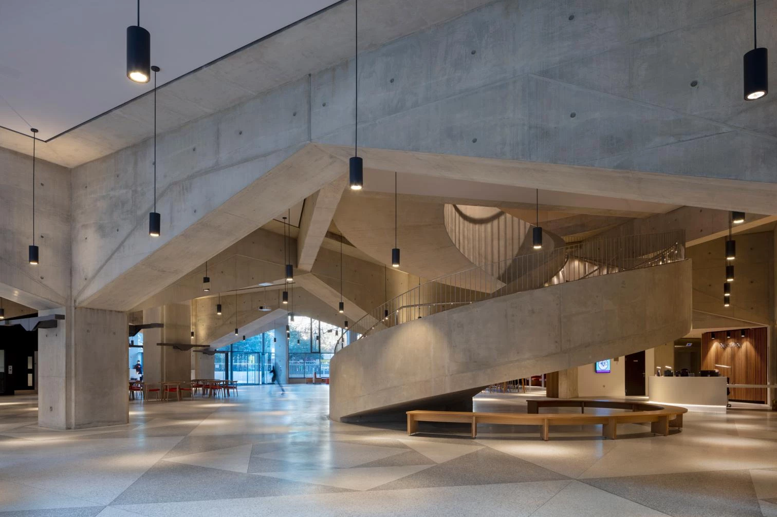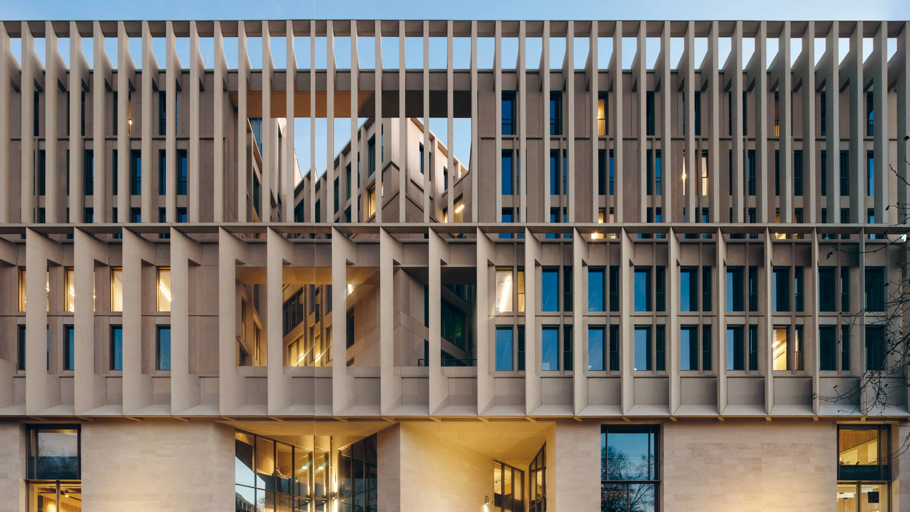 La parcela se encuentra en un enclave privilegiado dentro de la ‘city’, a medio camino entre la densa trama urbana y el paisaje abierto de Lincoln’s Inn Fields, la plaza más grande de Londres. La configuración formal del edificio responde así a esta condición de límite del solar. Por un lado, la planta baja del conjunto fue concebida como un generoso espacio no programado y abierto a la ciudad que ofrece una liberación frente al tejido colmatado de las calles vecinas. Por otro, cuatro mundos diferentes se apilan verticalmente, elevándose desde los niveles bajo tierra hasta la cubierta. Los distintos programas del conjunto —deporte, espacio cívico, docencia e investigación—, se entrelazan volumétrica y estructuralmente; dando lugar a un microcosmos, definido por una multiplicidad de usos que conforman un ambiente rico y estimulante para la vida universitaria. A nivel funcional, el centro alberga salas de conferencias, espacios informales de estudio, oficinas académicas, salas de ensayo, canchas de squash y un pabellón deportivo de 20x35 metros. Para adaptarse a la gran diversidad de usos, se desarrolló una compleja estructura consistente en entramado soportes arbóreos que dirigen las fuerzas de la gravedad hacia el suelo y que, además, canalizan la luz cenital y horizontal hacia el interior del edificio.