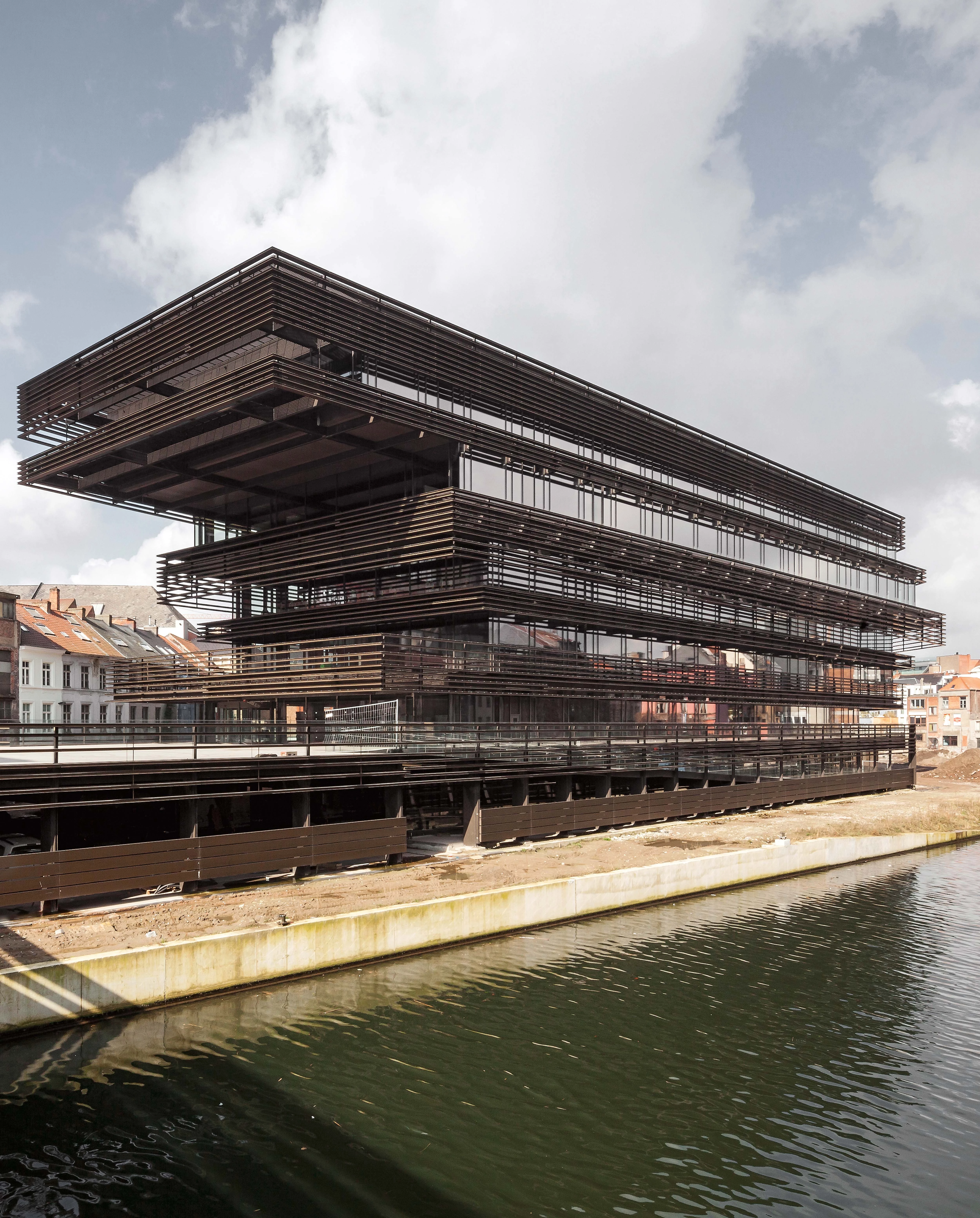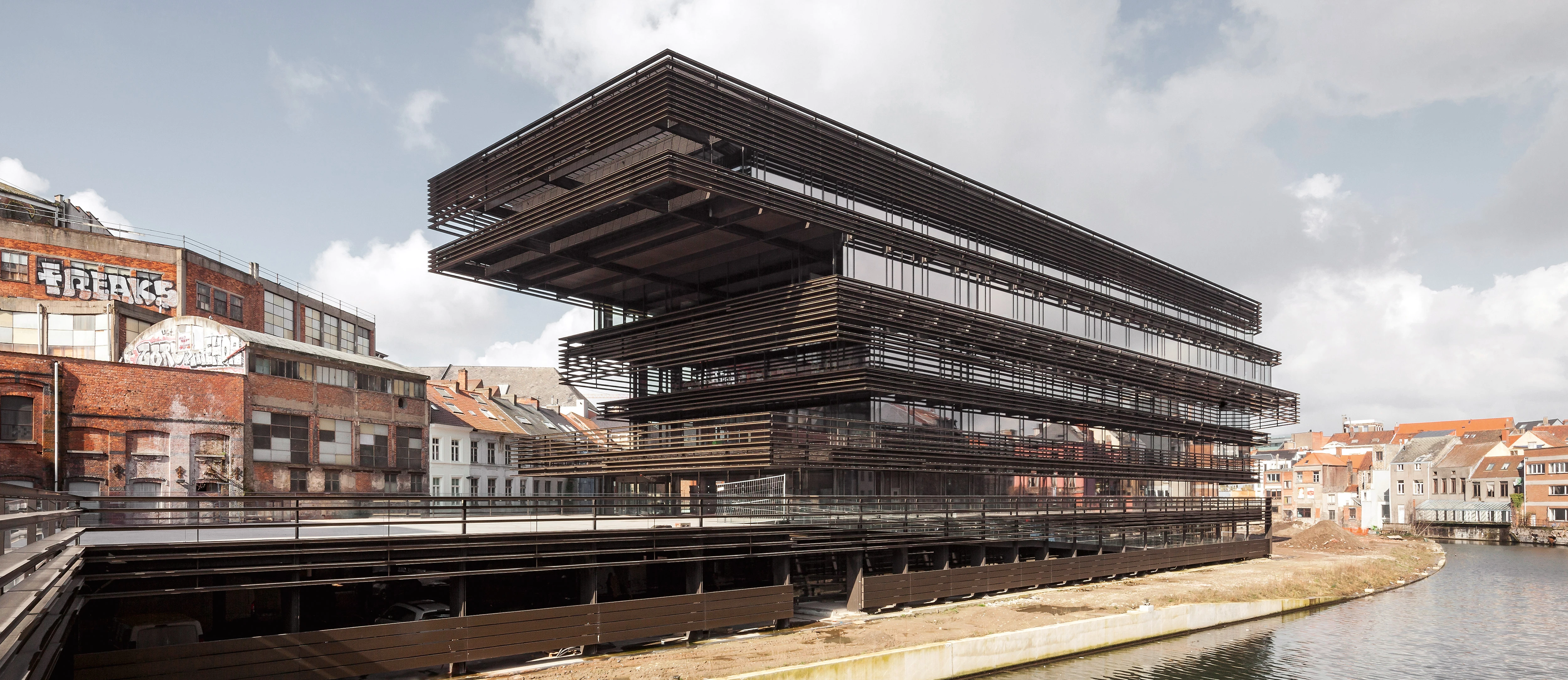 La nueva mediateca de Gante, emplazada en el centro histórico, consiste en un apilamiento de losas que resulta en un volumen flexible.