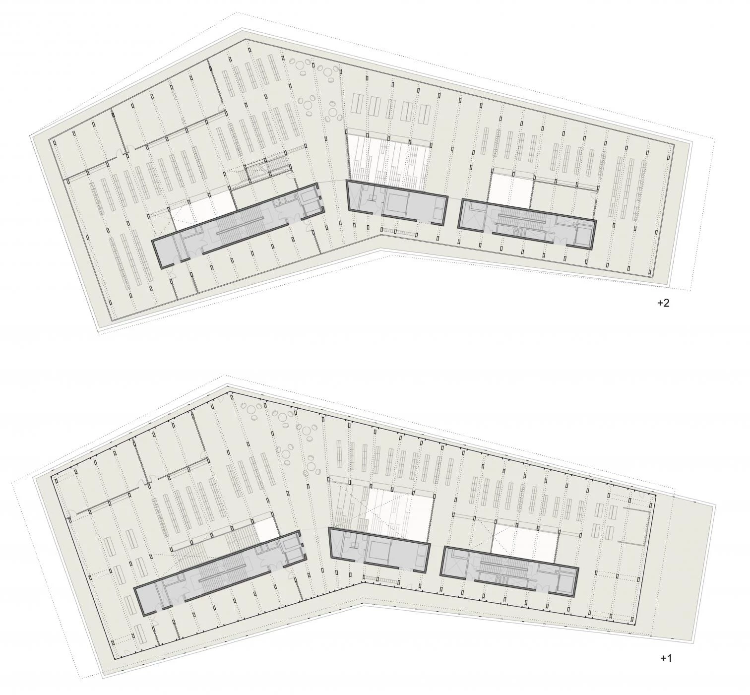 La planta baja se resuelve en dos cotas: el nivel de los canales y el de las pasarelas que los cruzan. El programa se desarrolla, fundamentalmente, en las plantas intermedias, que incluyen la Biblioteca Patrimonio de Flandes del Este, la biblioteca regional, el catálogo central de todas las bibliotecas de la provincia y un espacio de nuevos medios. Las oficinas se colocan en la quinta planta, y coronan así el edificio.