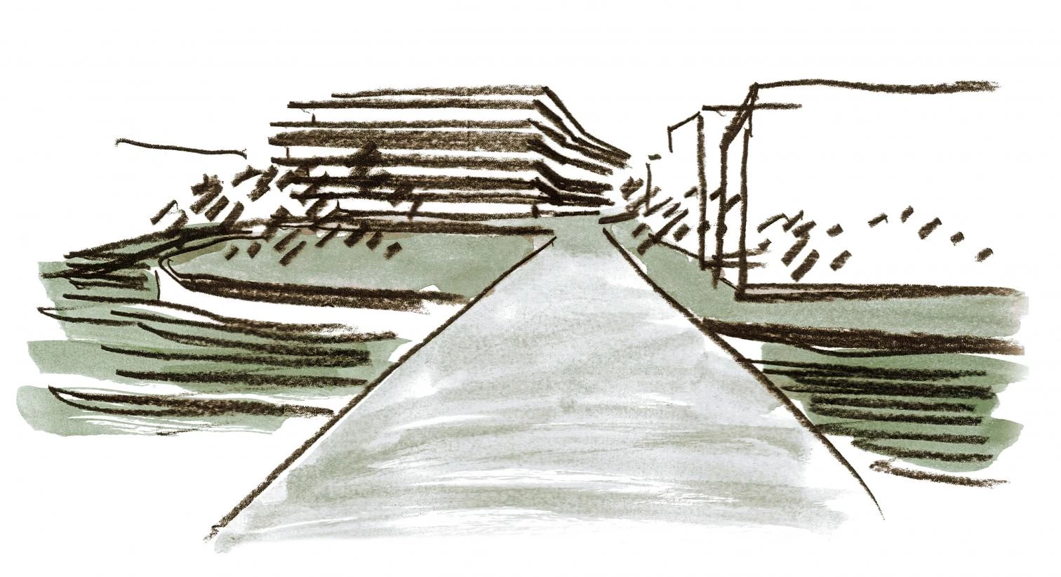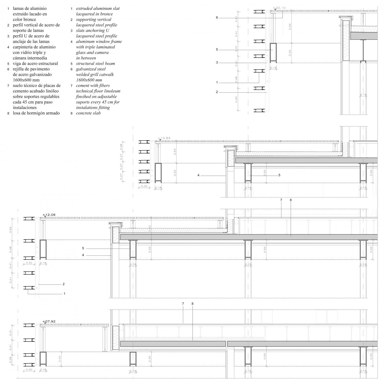 En la fachada, una serie de lamas metálicas horizontales protegen al edificio de la luz del sol. La escala urbana de la obra y la variedad de sus espacios públicos ayudan a potenciar el barrio: la plaza principal cuenta con un anfiteatro, y está conectada con la ciudad por una pasarela que cruza el río; una plaza más pequeña dispuesta en dos niveles enlaza con la anterior; y un parque cubre el recodo del río y lo separa del edificio.