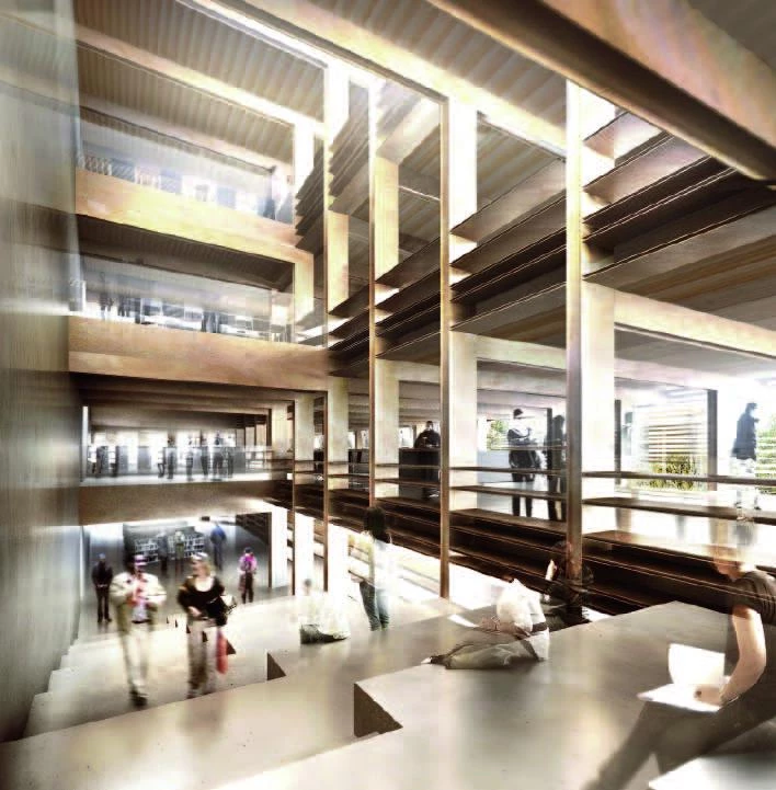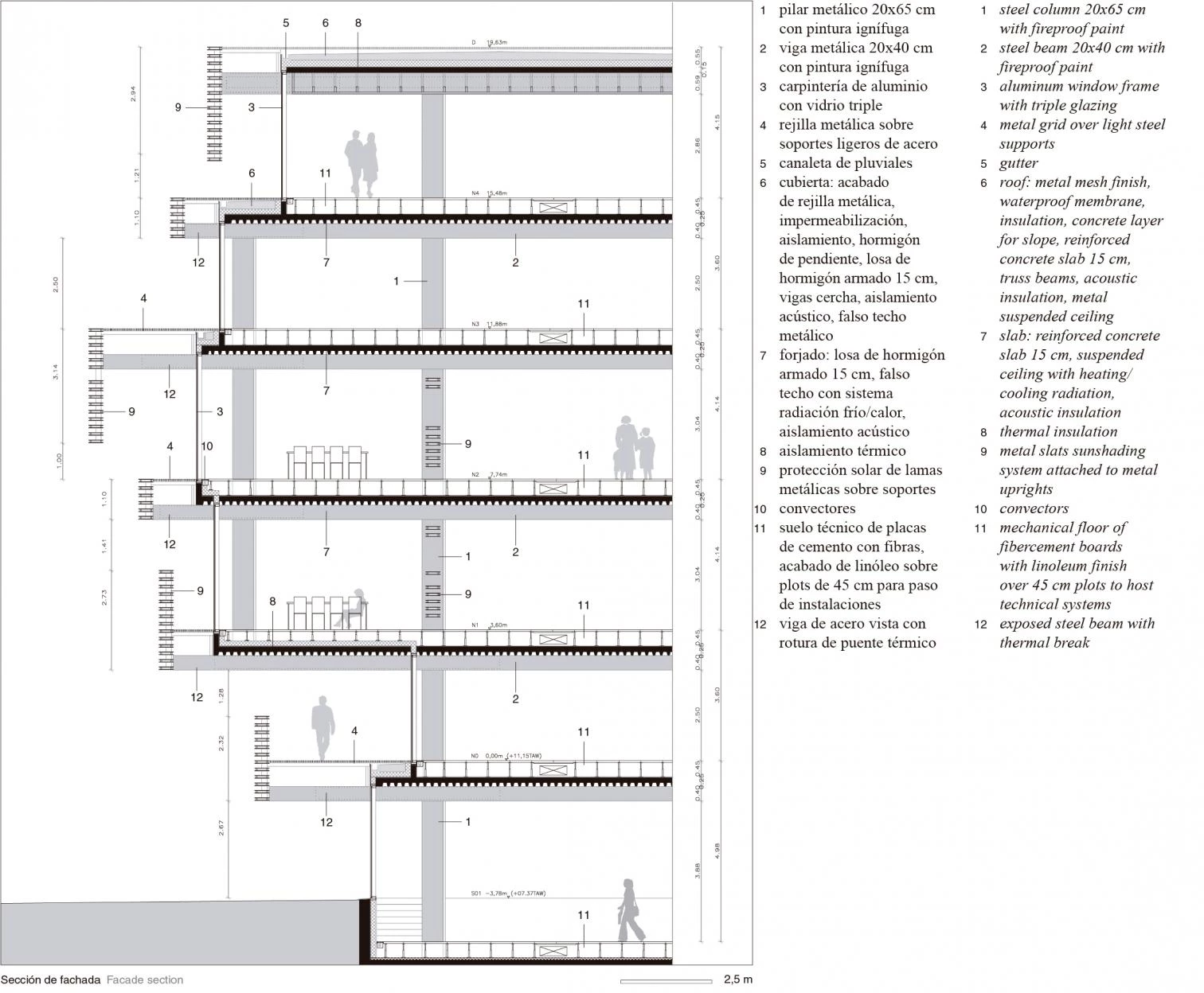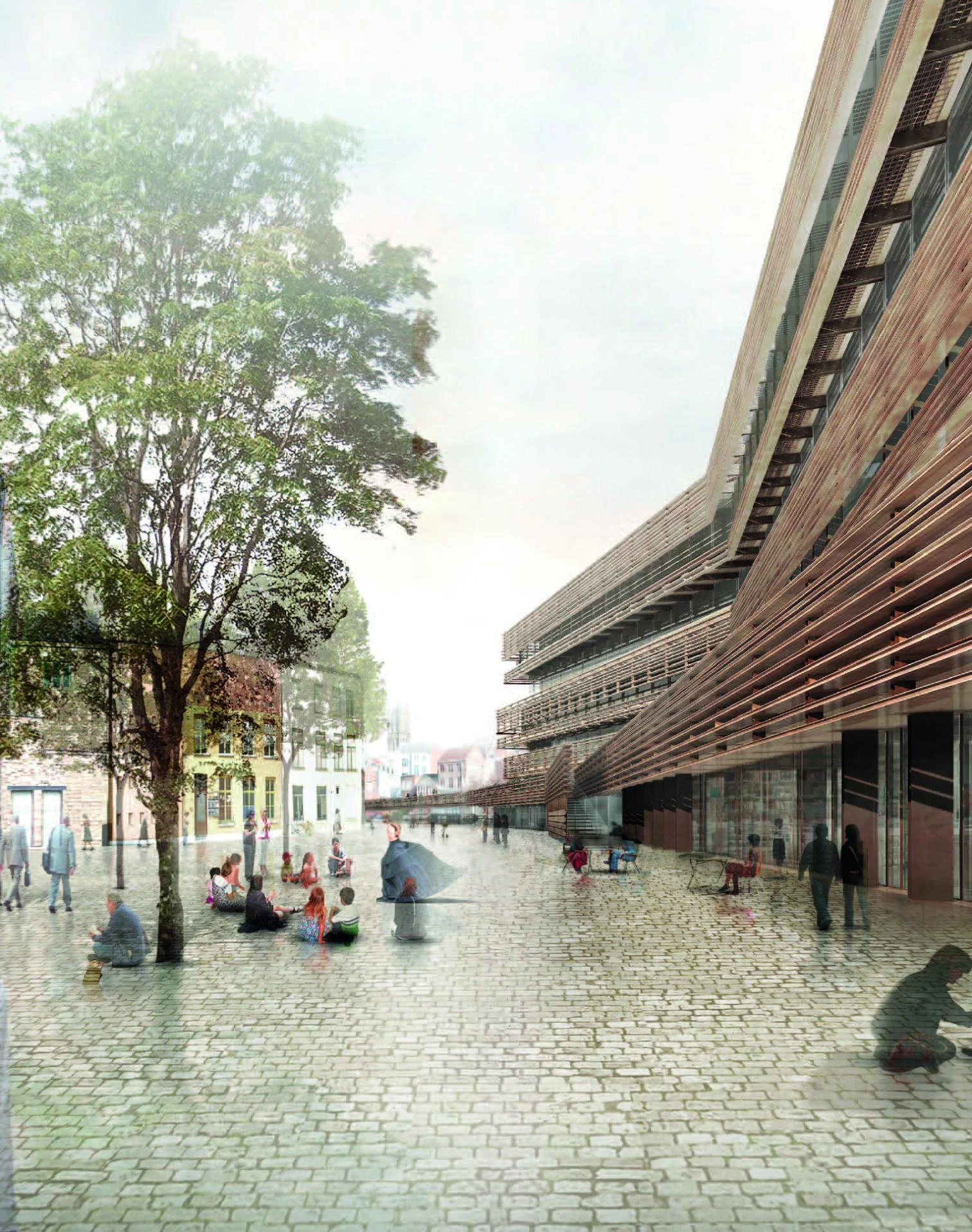 La nueva mediateca, en el centro de Gante, se sitúa en un recodo del krook, el canal que recorre toda la ciudad y que alcanza su cota más baja en este punto, poniendo de manifiesto las dos ‘cotas cero’ del tejido: la del propio canal y la de los incontables puentes que lo cruzan. El edificio parte de la conexión de estas dos cotas a través de un espacio a doble altura que, a modo de ágora, recoge las circulaciones y las introduce en el complejo mundo interior de usos que ofrece la mediateca: centro de nuevos medios, biblioteca, recursos para universitarios, centro de actividades para niños y aulas polivalentes. El frente urbano del edificio, que responde a la cota de los puentes, se define con una zona peatonal en ele que comunica dos de ellos. Hacia el sur, el edificio se retranquea para generar una plaza, que queda protegida por el vuelo progresivo de las plantas superiores y que da acceso al vestíbulo. Entendida como un condensador social, la mediateca se organiza a través de espacios de circulación que recorren diagonalmente la sección y que se aprovechan para introducir servicios y zonas de estancia para la relación de los diferentes usuarios. Las fachadas, acabadas en vidrio, permiten inundar de luz natural el interior, y exteriormente se protegen con una celosía metálica de lamas horizontales.