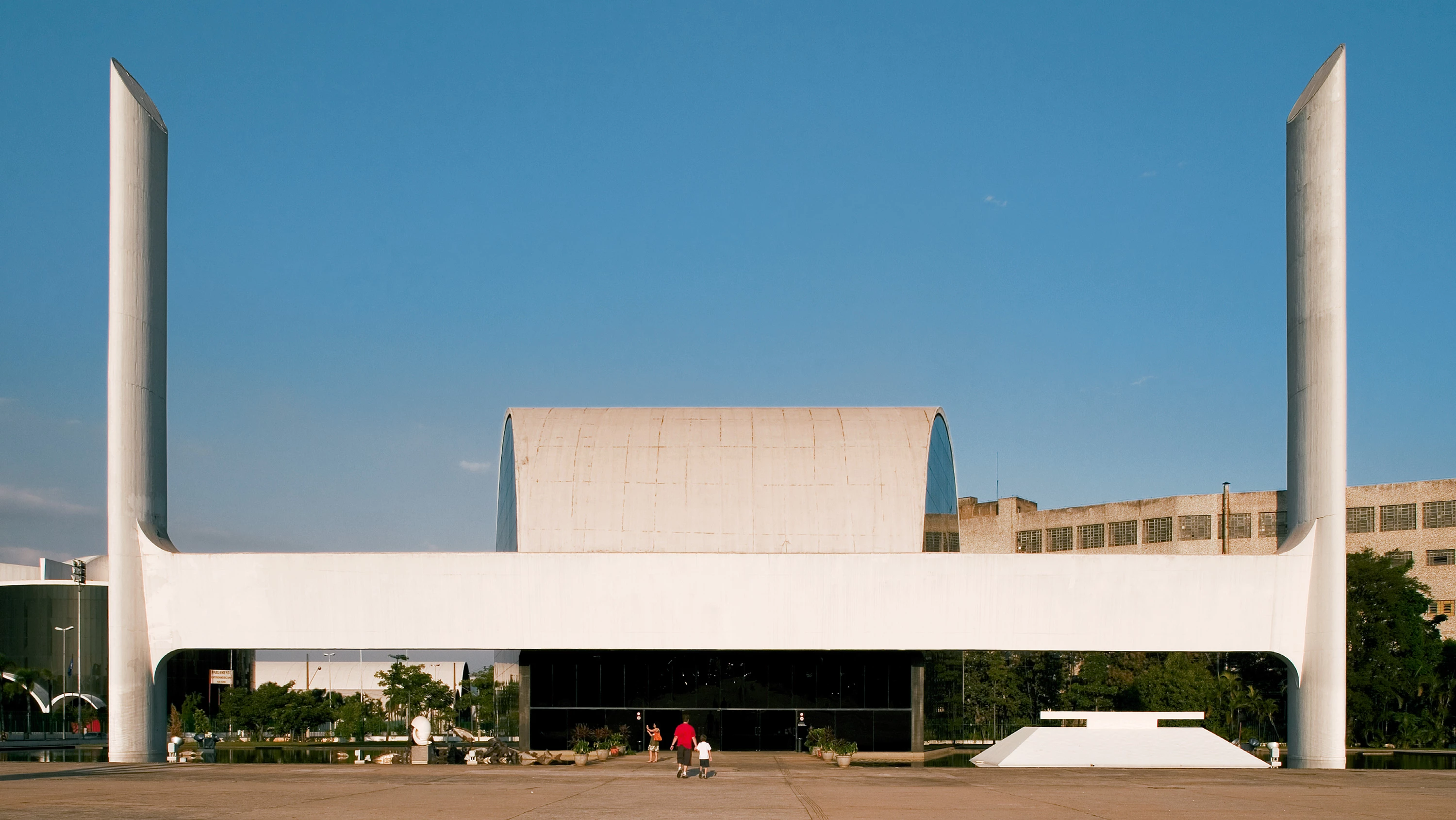 Después de atravesar la pasarela peatonal se llega al otro lado, donde está la administración, el pabellón de la creatividad y el teatro. La administración hace referencia al MASP (creado por Lina Bo Bardi en la década de los sesenta), pero con pilares interiores que ocultan un gran vano. El pabellón de la creatividad dispone de una secuencia de pórticos, derivados del proyecto de la Universidad de Brasilia. Con obras de Carlos Scliar, Alfredo Ceschiatti y Tomie Ohtake, el auditorio es la más interesante de las construcciones, semejante a la tipología del salón de actos y la biblioteca. El espacio tiene un escenario central y doble platea, que remite al SESC Pompeia (también de Lina Bo Bardi, década de los ochenta), que demostró ser poco adecuado. Una vez construido el conjunto, en 1991 fue ampliado con el Parlamento Latinoamericano, también diseñado por Niemeyer. Como respuesta a las críticas sobre la aridez del espacio libre, el arquitecto ideó una retícula con palmeras... [+]