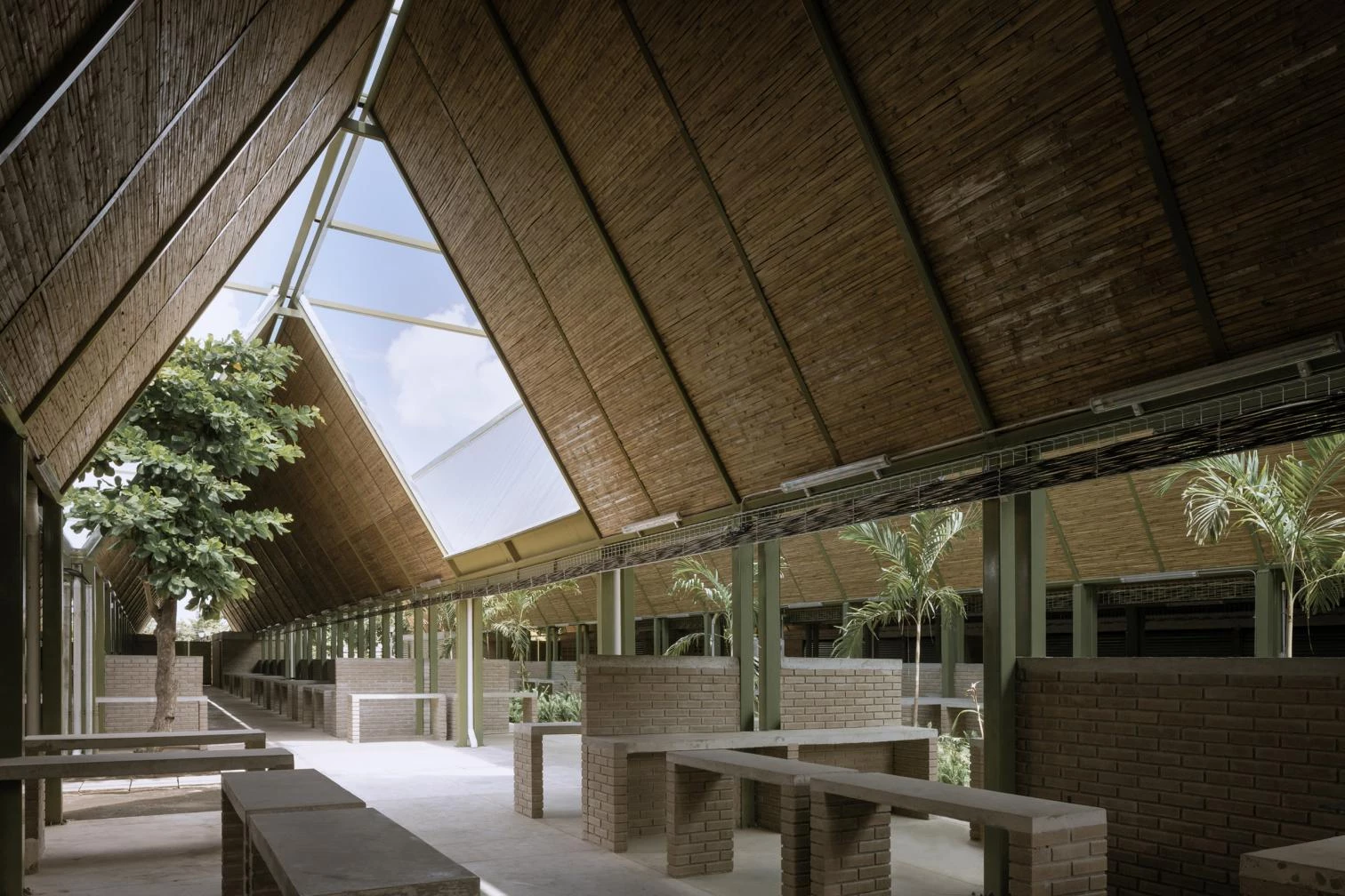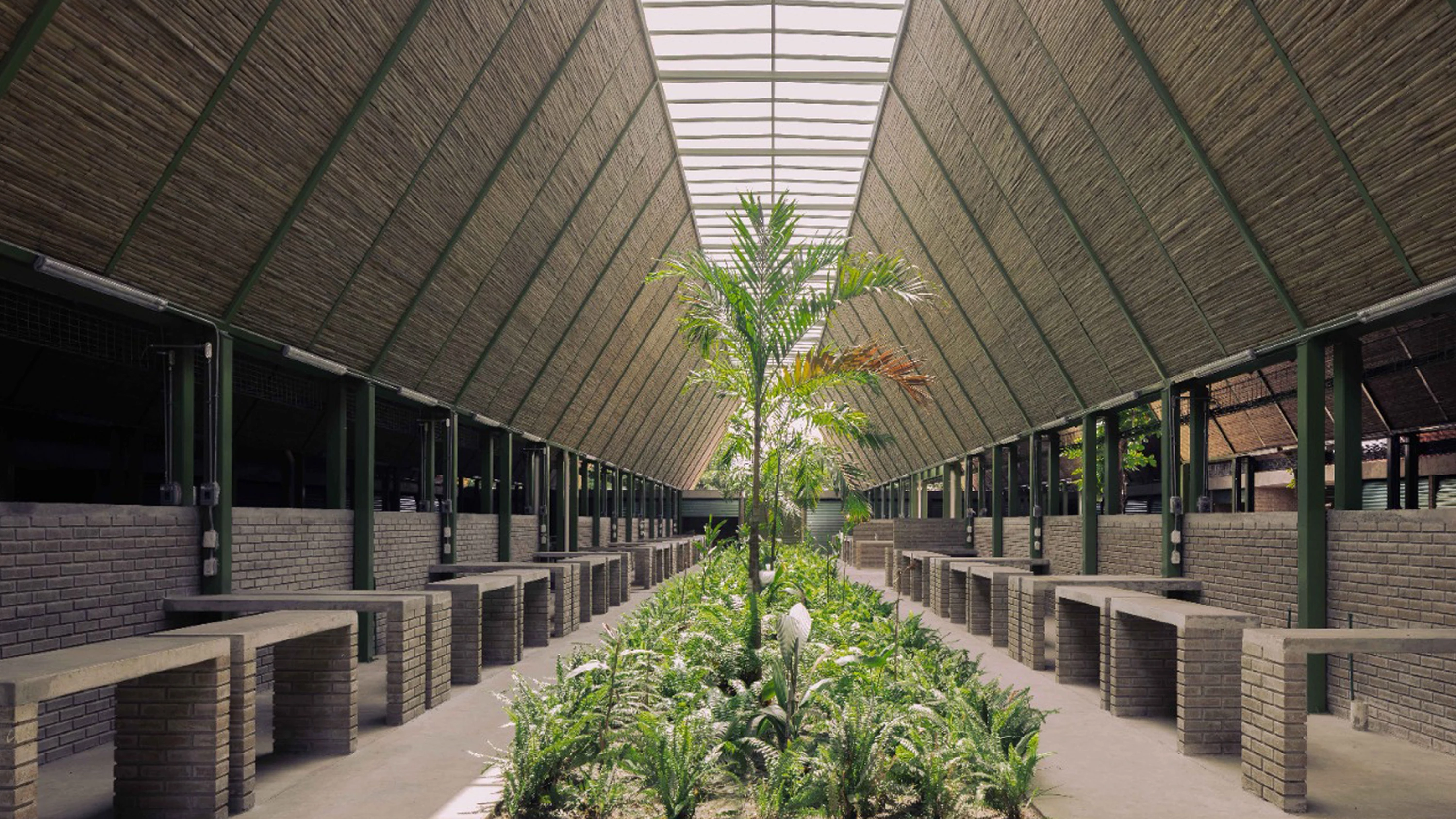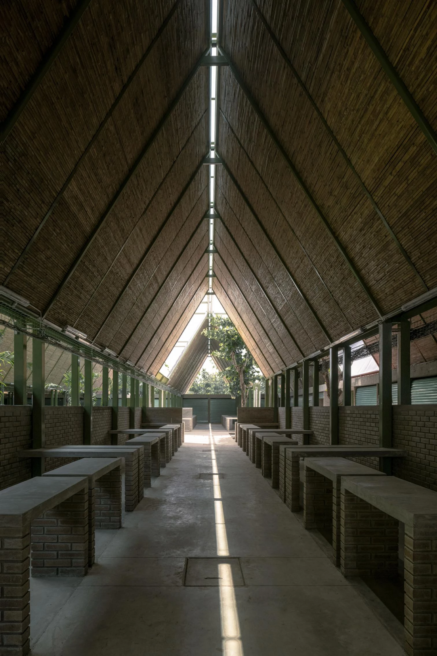 Las líneas de los puestos del mercado se enfatizan por techumbres inclinadas, compuestas por una estructura metálica y paneles de bambú, que proporcionan excelentes condiciones térmicas y acústicas. Las crestas en zigzag de la cubierta permiten la iluminación natural y la captación de aguas pluviales para su posterior reutilización en baños y riego de jardines.