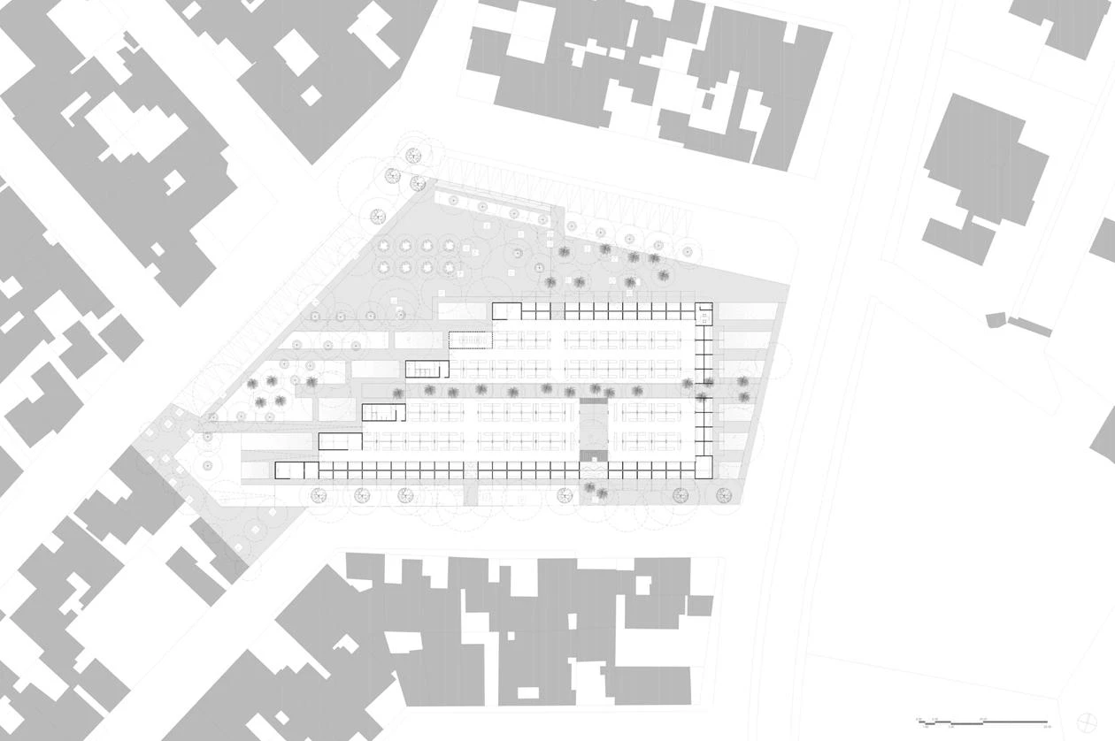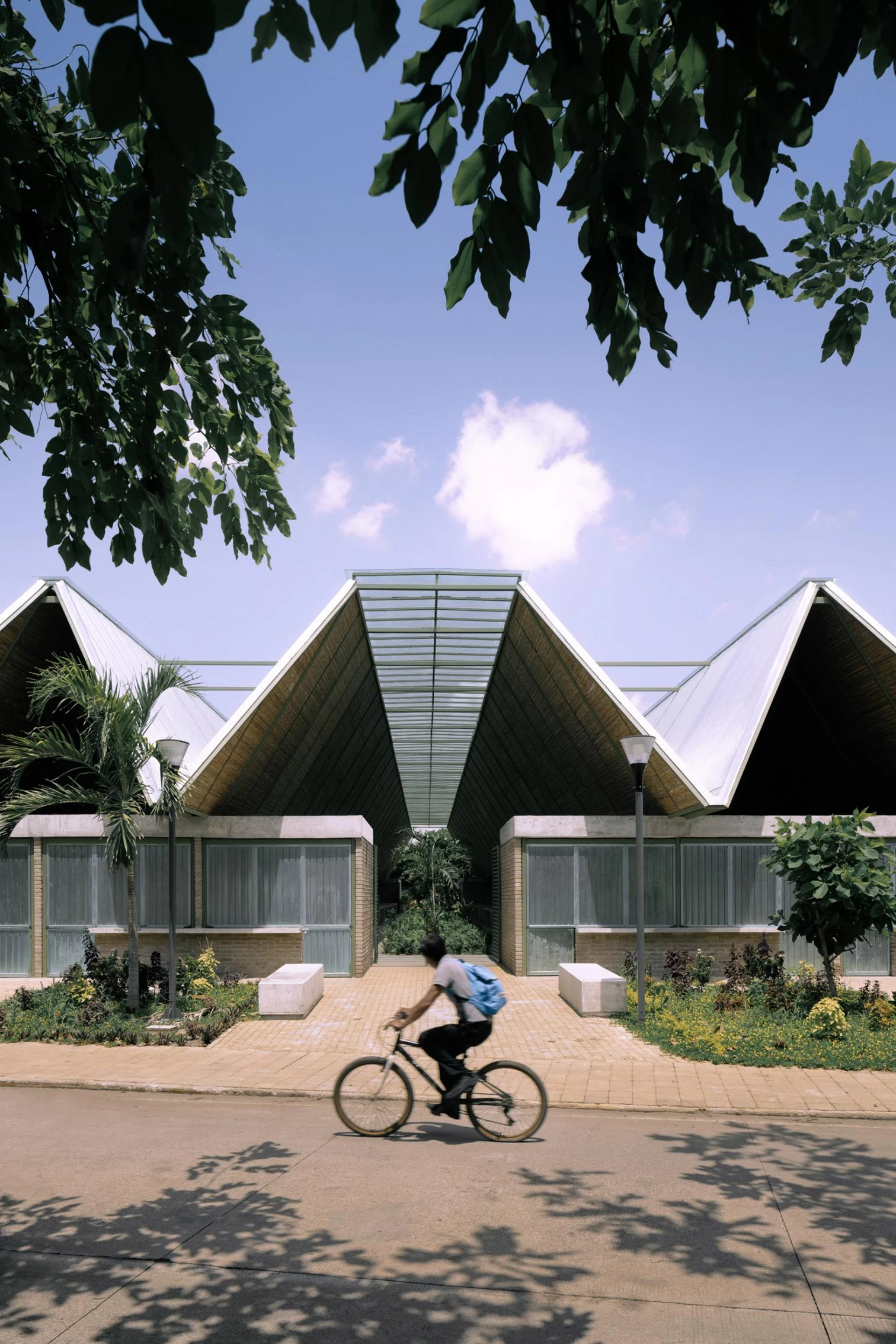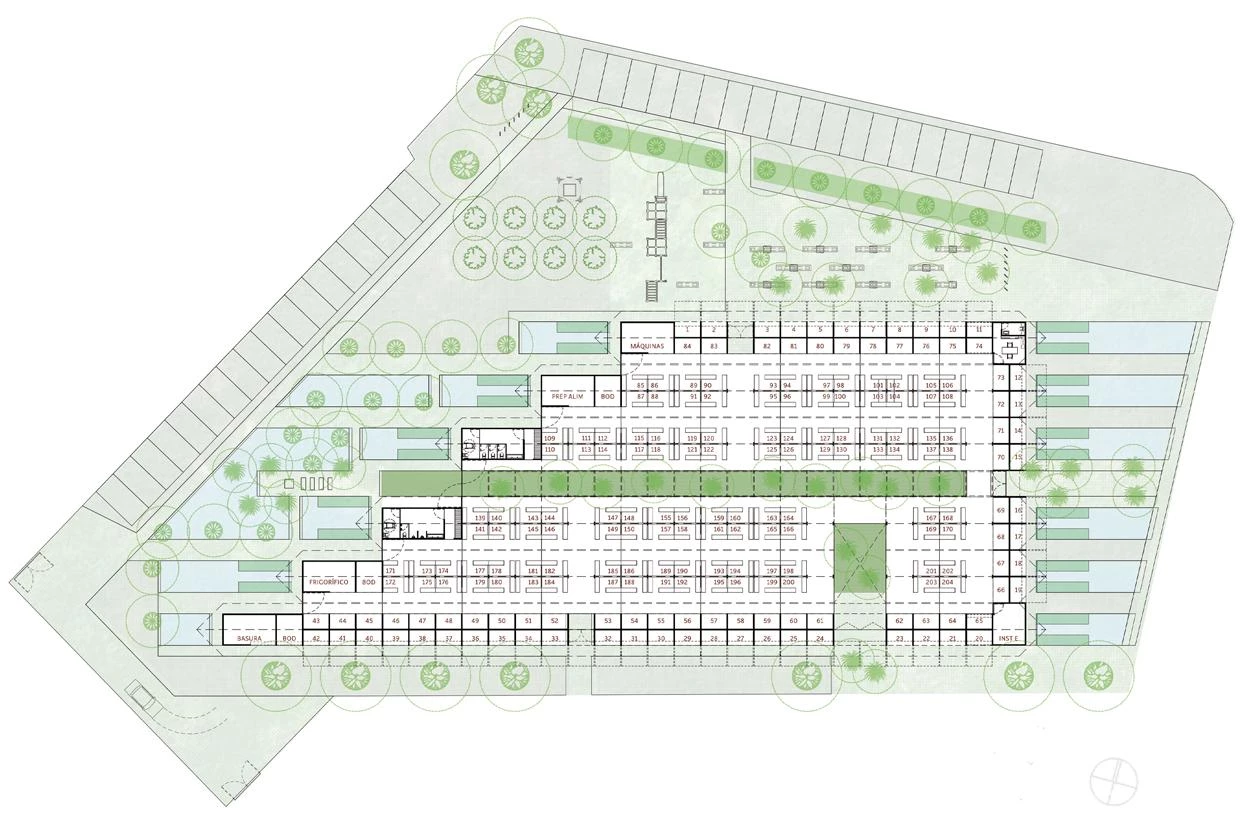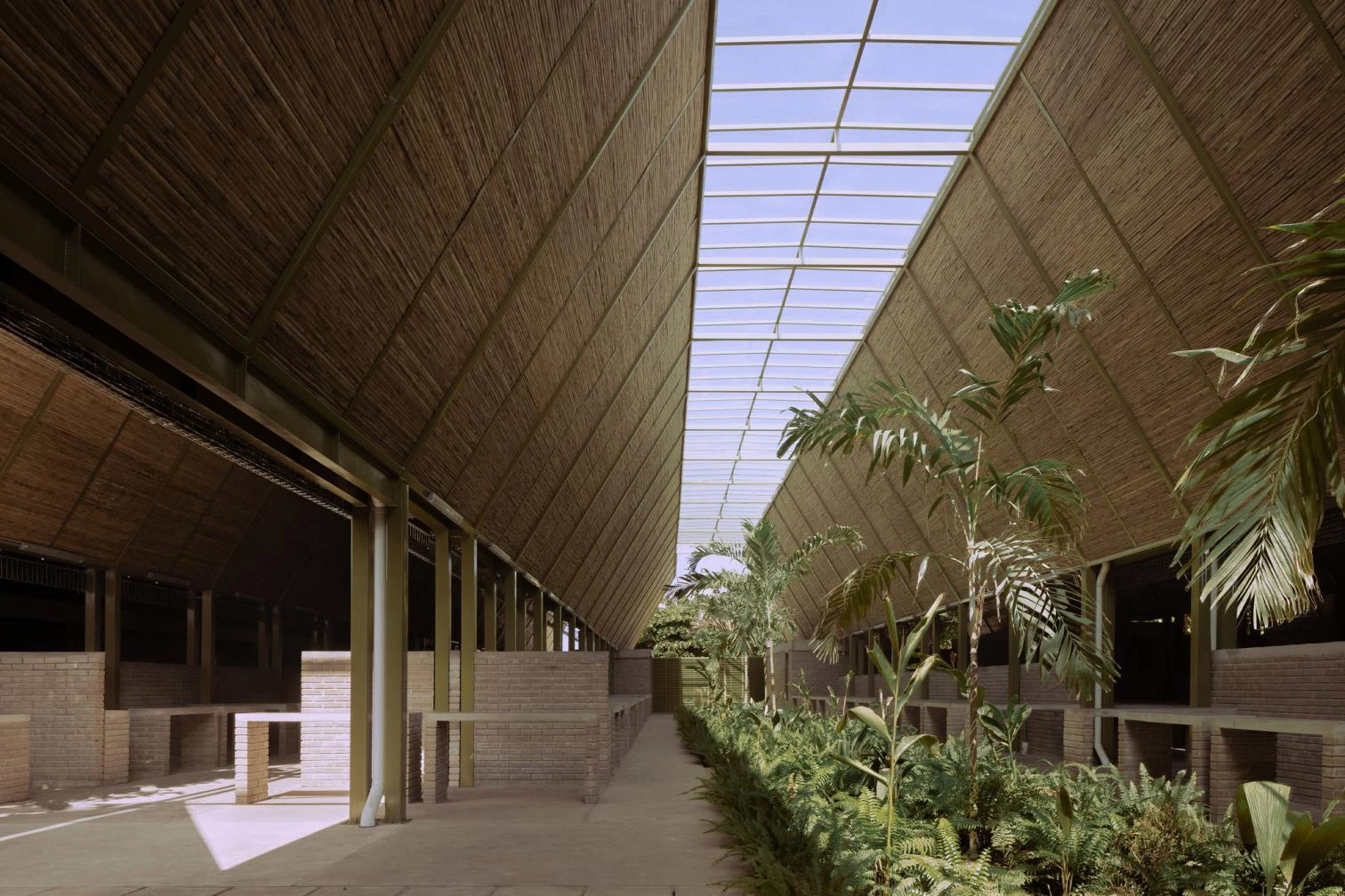 Las líneas de los puestos del mercado se enfatizan por techumbres inclinadas, compuestas por una estructura metálica y paneles de bambú, que proporcionan excelentes condiciones térmicas y acústicas. Las crestas en zigzag de la cubierta permiten la iluminación natural y la captación de aguas pluviales para su posterior reutilización en baños y riego de jardines.