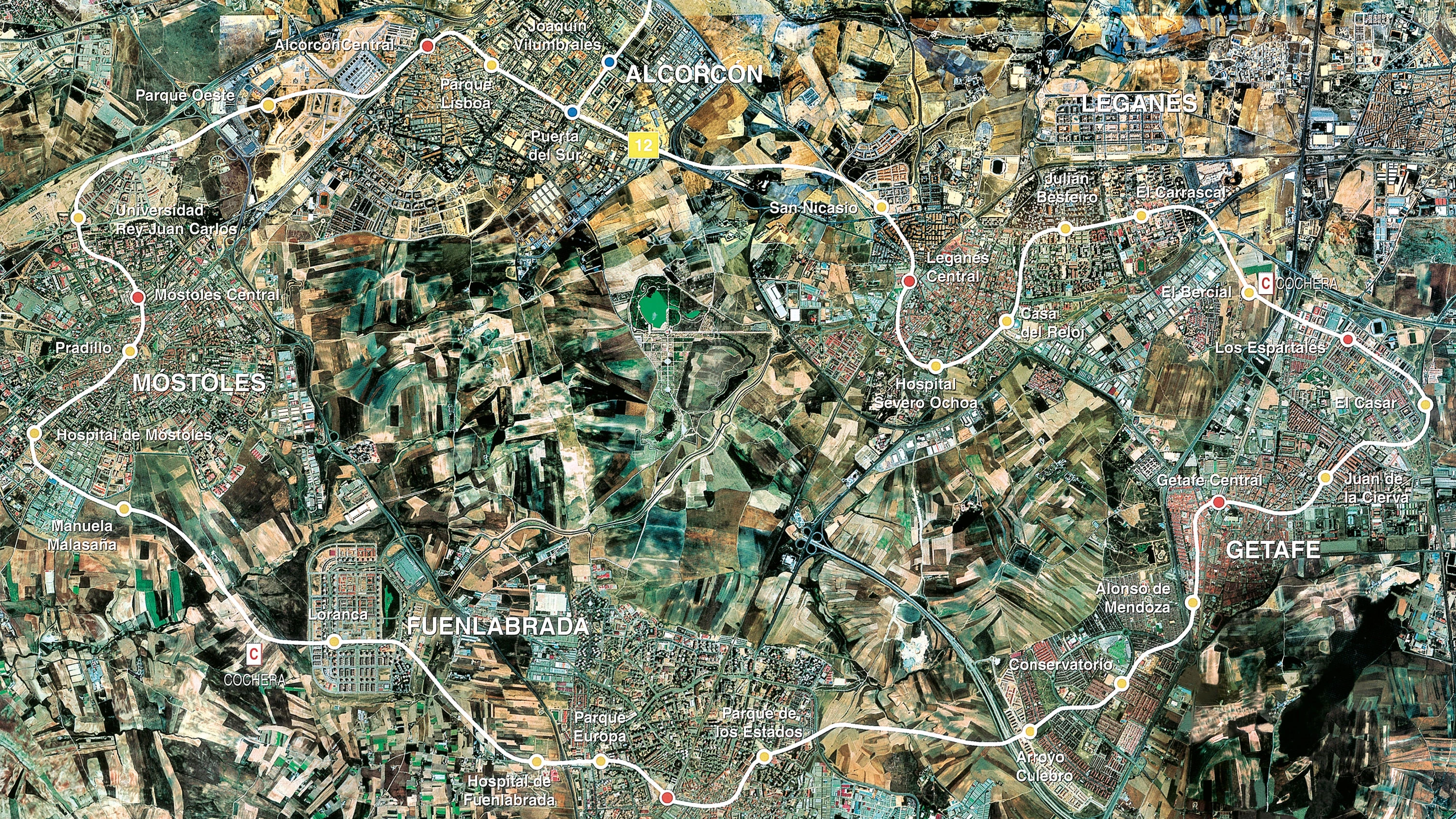 Con 28 estaciones distribuidas en más de 40 kilómetros, la línea Metrosur es un anillo que conecta con la línea 10 del suburbano los cinco grandes municipios del suroeste madrileño: Alcorcón, Leganés, Getafe, Fuenlabrada y Móstoles, rompiendo así con el tradicional sistema radial de relación de Madrid con la periferia... [+]