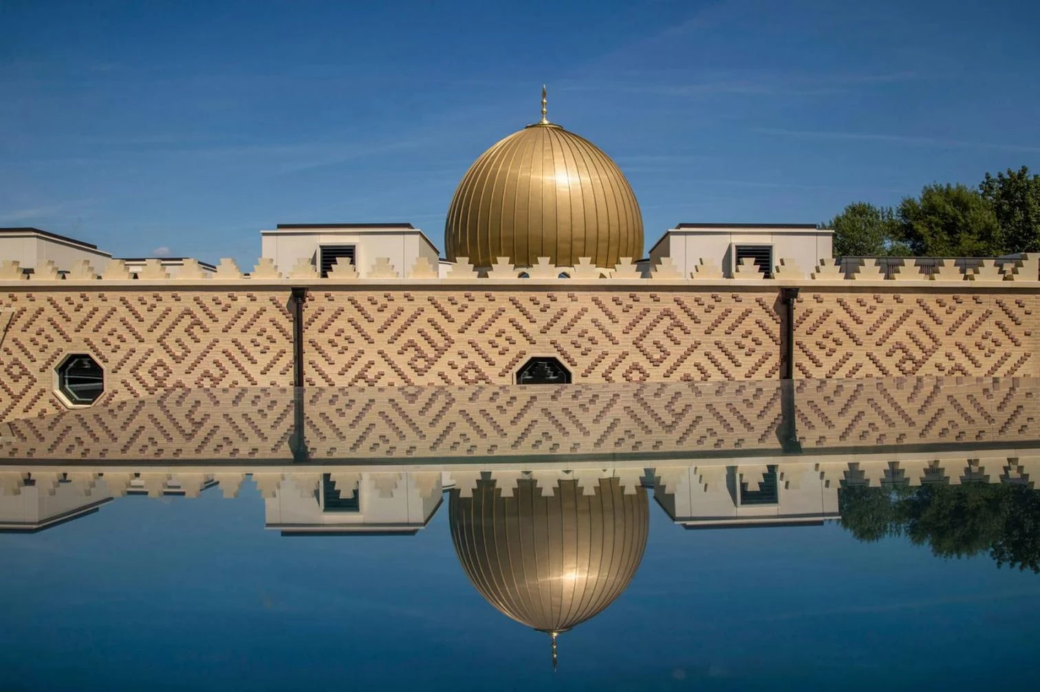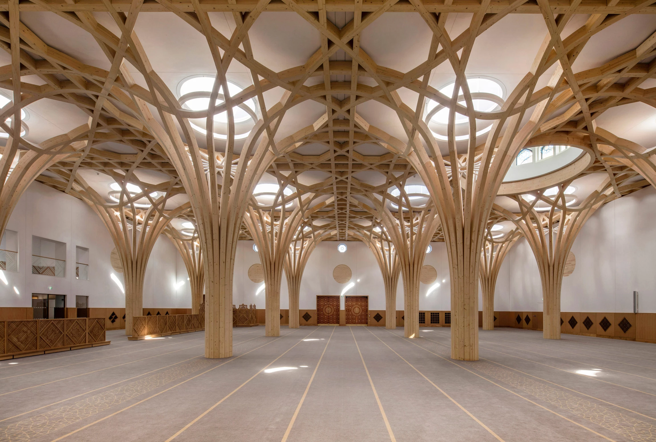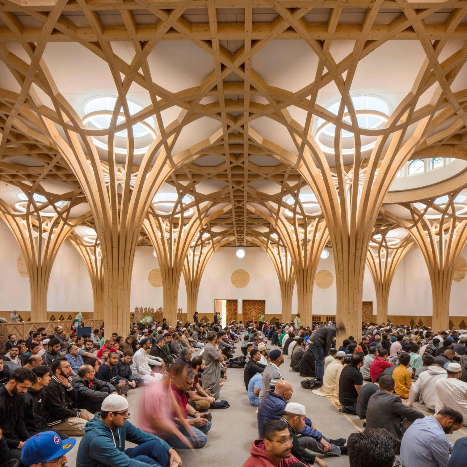 Combinando elementos de la arquitectura local y de la tradición islámica, con patrones decorativos geométricos que simbolizan el infinito, se levanta esta mezquita según el proyecto ganador en 2009 de un concurso, elaborado por Julia Barfield y su marido David Marks, fallecido en 2017. Destinado a acoger a mil fieles, el edificio religioso presenta una estructura de madera soportada por columnas ramificadas que se extienden como nervios entrelazados que evocan las bóvedas de abanico del gótico inglés, que se encuentran en la capilla del King's College de la Universidad de Cambridge. Al exterior, una piel cerámica envuelve el conjunto a semejanza de las construcciones cercanas. Inserto en un barrio residencial de poca altura, el centro espiritual y cultural ha sido diseñado para minimizar su impacto en el medioambiente, mediante medidas sostenibles pasivas y activas. La mezquita funciona en parte con energía solar e incluye un sistema de recolección de aguas pluviales. El proyecto ha ganado varios premios y recientemente ha sido preseleccionado para el Premio RIBA Stirling 2021.