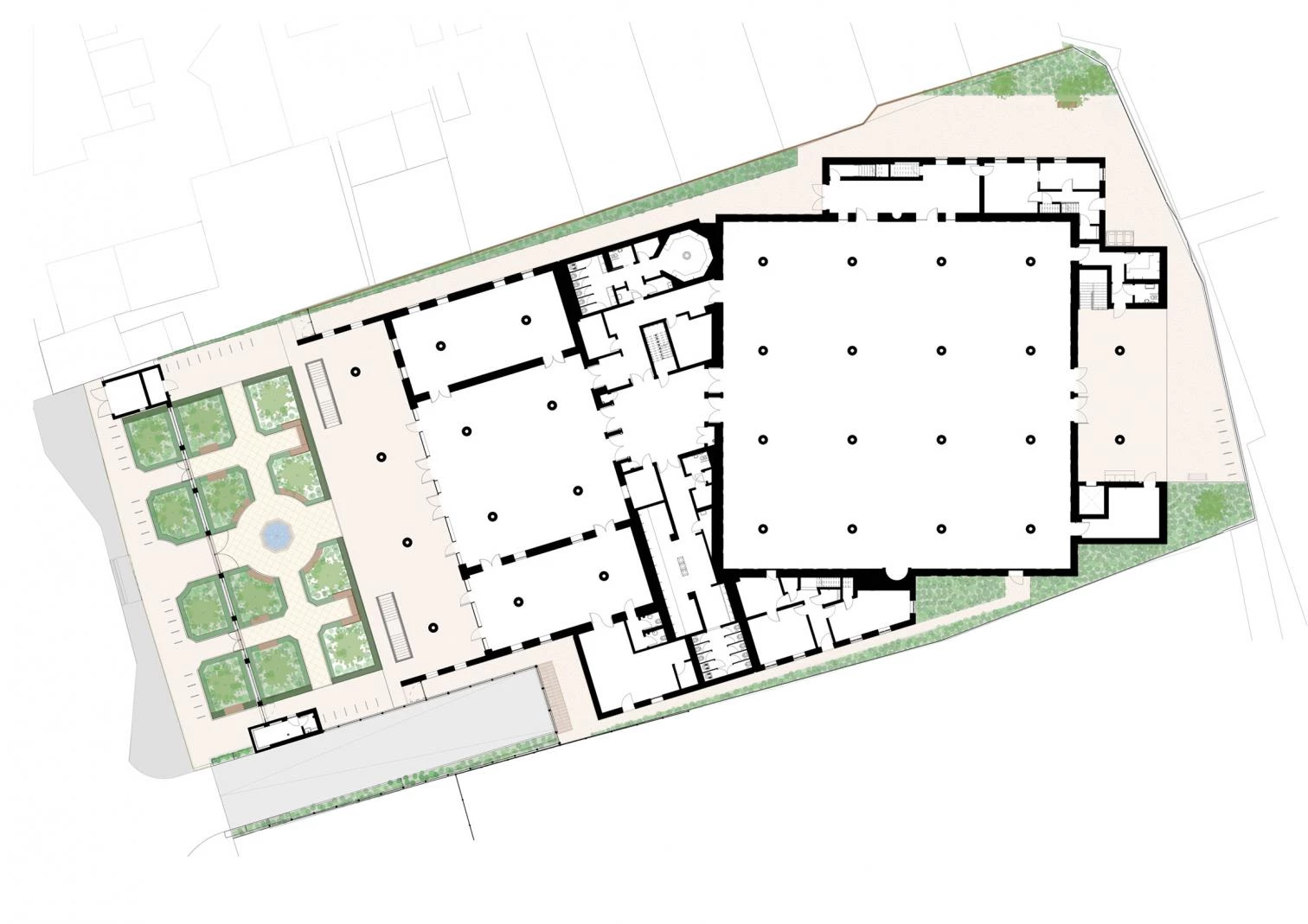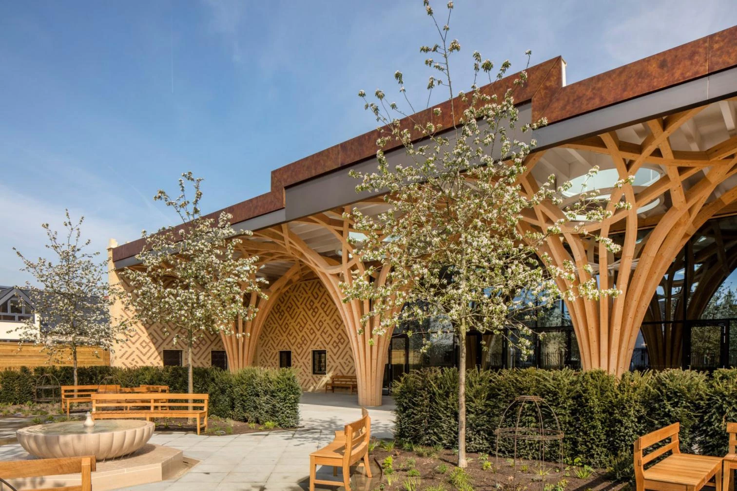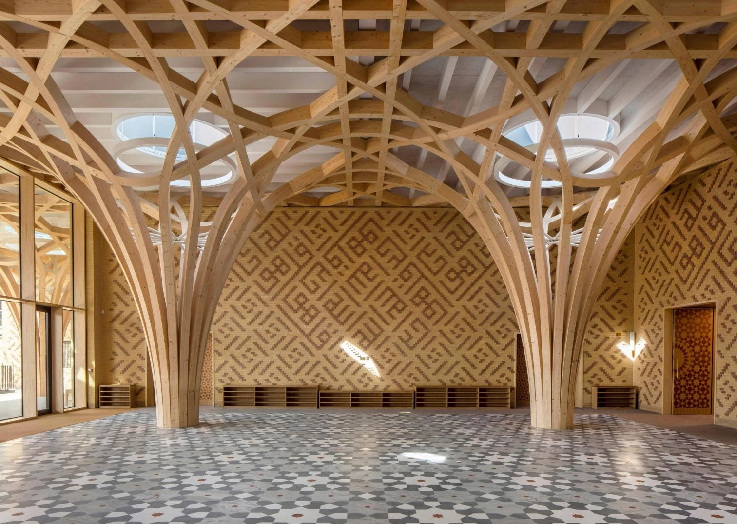 Combinando elementos de la arquitectura local y de la tradición islámica, con patrones decorativos geométricos que simbolizan el infinito, se levanta esta mezquita según el proyecto ganador en 2009 de un concurso, elaborado por Julia Barfield y su marido David Marks, fallecido en 2017. Destinado a acoger a mil fieles, el edificio religioso presenta una estructura de madera soportada por columnas ramificadas que se extienden como nervios entrelazados que evocan las bóvedas de abanico del gótico inglés, que se encuentran en la capilla del King's College de la Universidad de Cambridge. Al exterior, una piel cerámica envuelve el conjunto a semejanza de las construcciones cercanas. Inserto en un barrio residencial de poca altura, el centro espiritual y cultural ha sido diseñado para minimizar su impacto en el medioambiente, mediante medidas sostenibles pasivas y activas. La mezquita funciona en parte con energía solar e incluye un sistema de recolección de aguas pluviales. El proyecto ha ganado varios premios y recientemente ha sido preseleccionado para el Premio RIBA Stirling 2021.