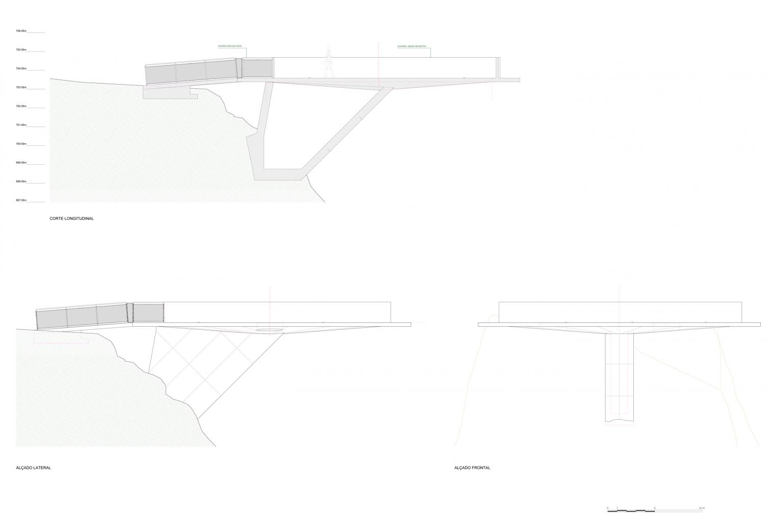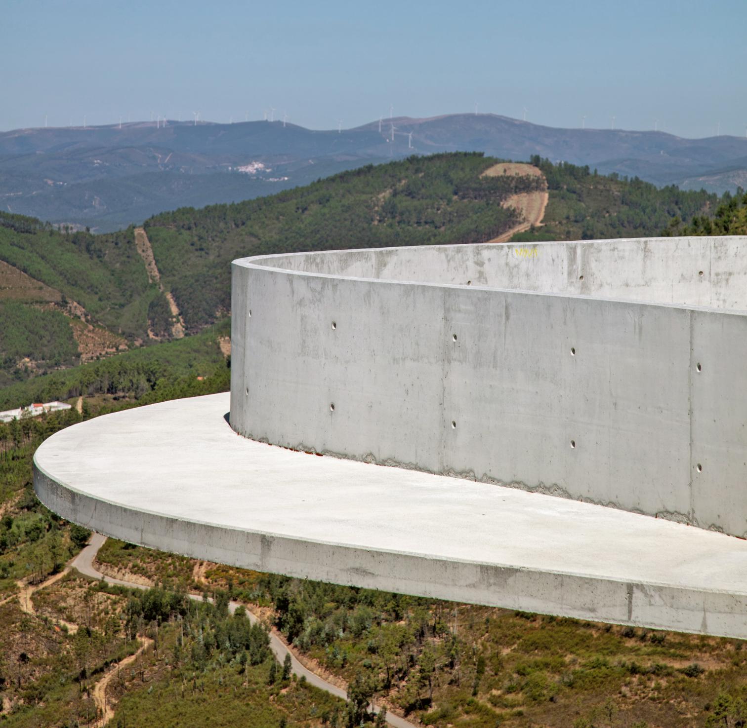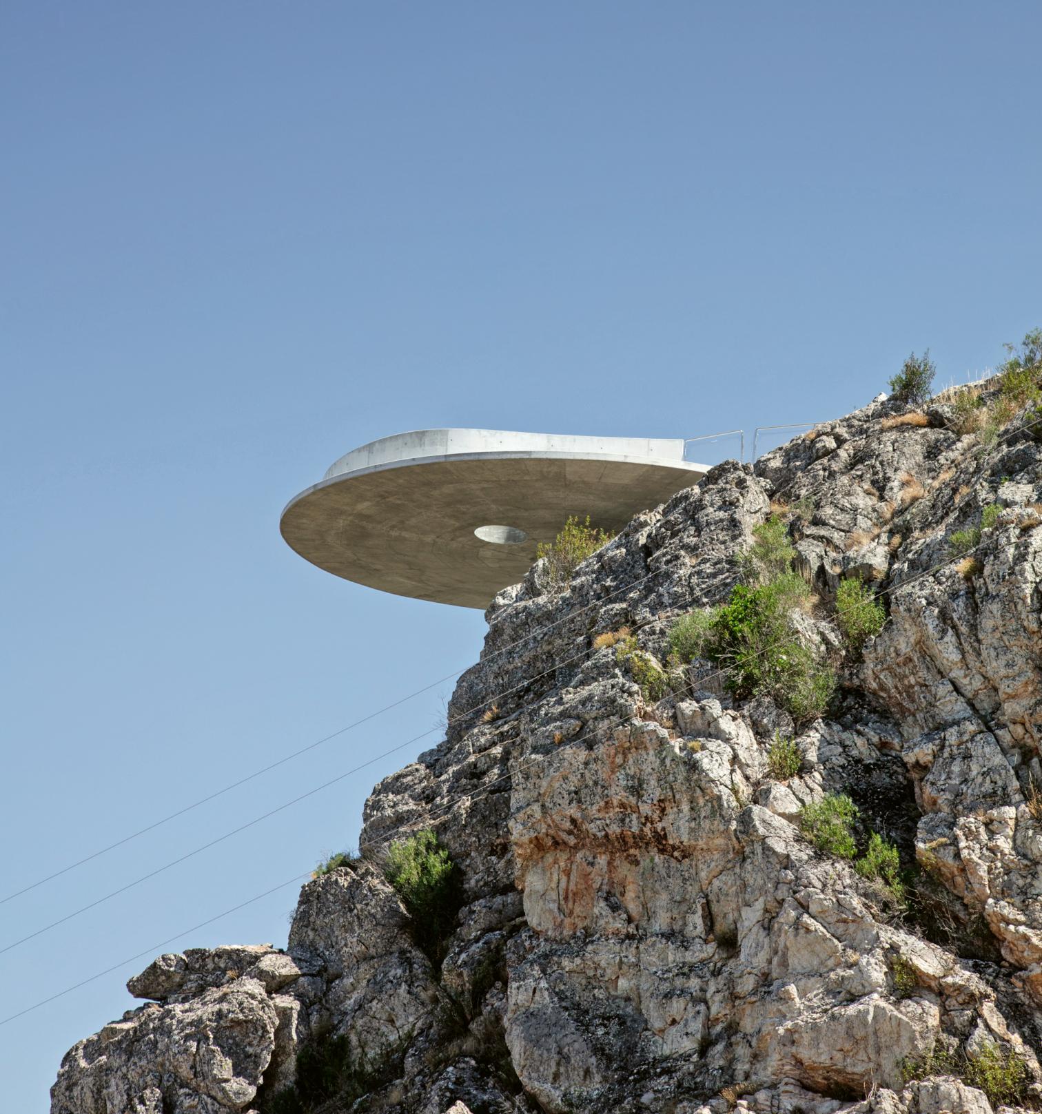 Sostenida por una simple ménsula fijada directamente a la pared de roca, una plataforma circular de quince metros de diámetro, toda ella ejecutada en hormigón visto, se guarnece con un ondulante peto opaco que acentúa los dos ojos de buey perforados en el suelo, de suerte que la sensación vertiginosa de flotar sobre el precipicio acompaña al esperable arrobo del paisaje.