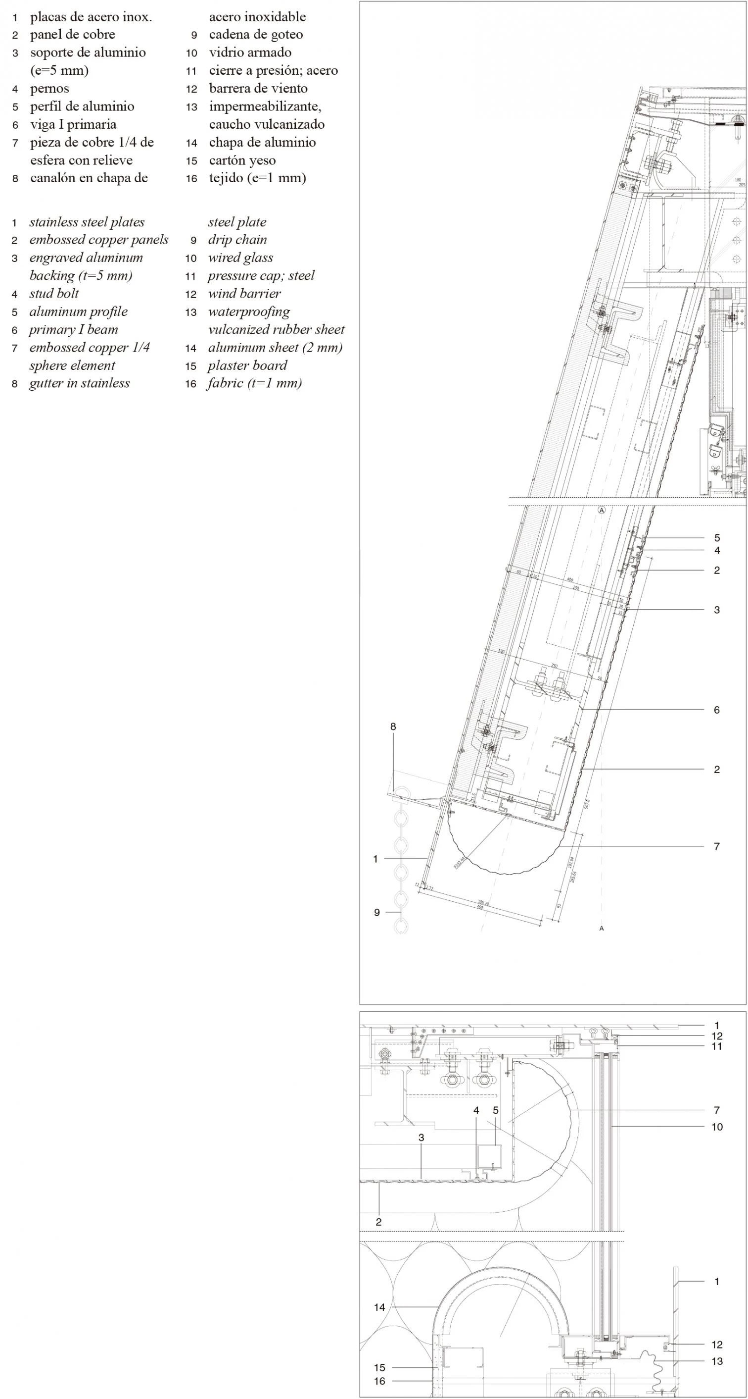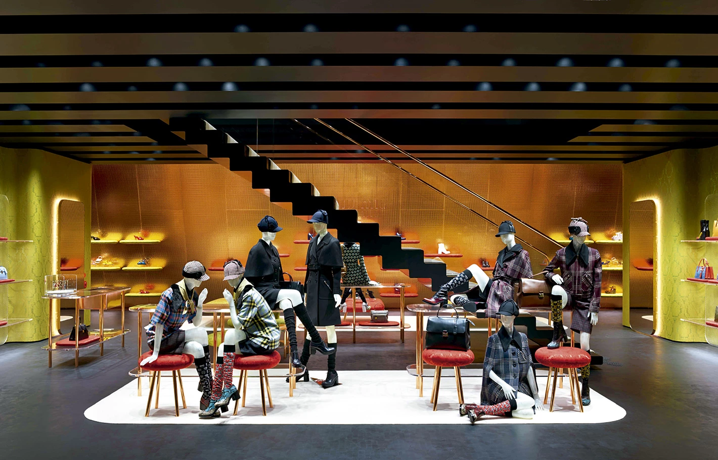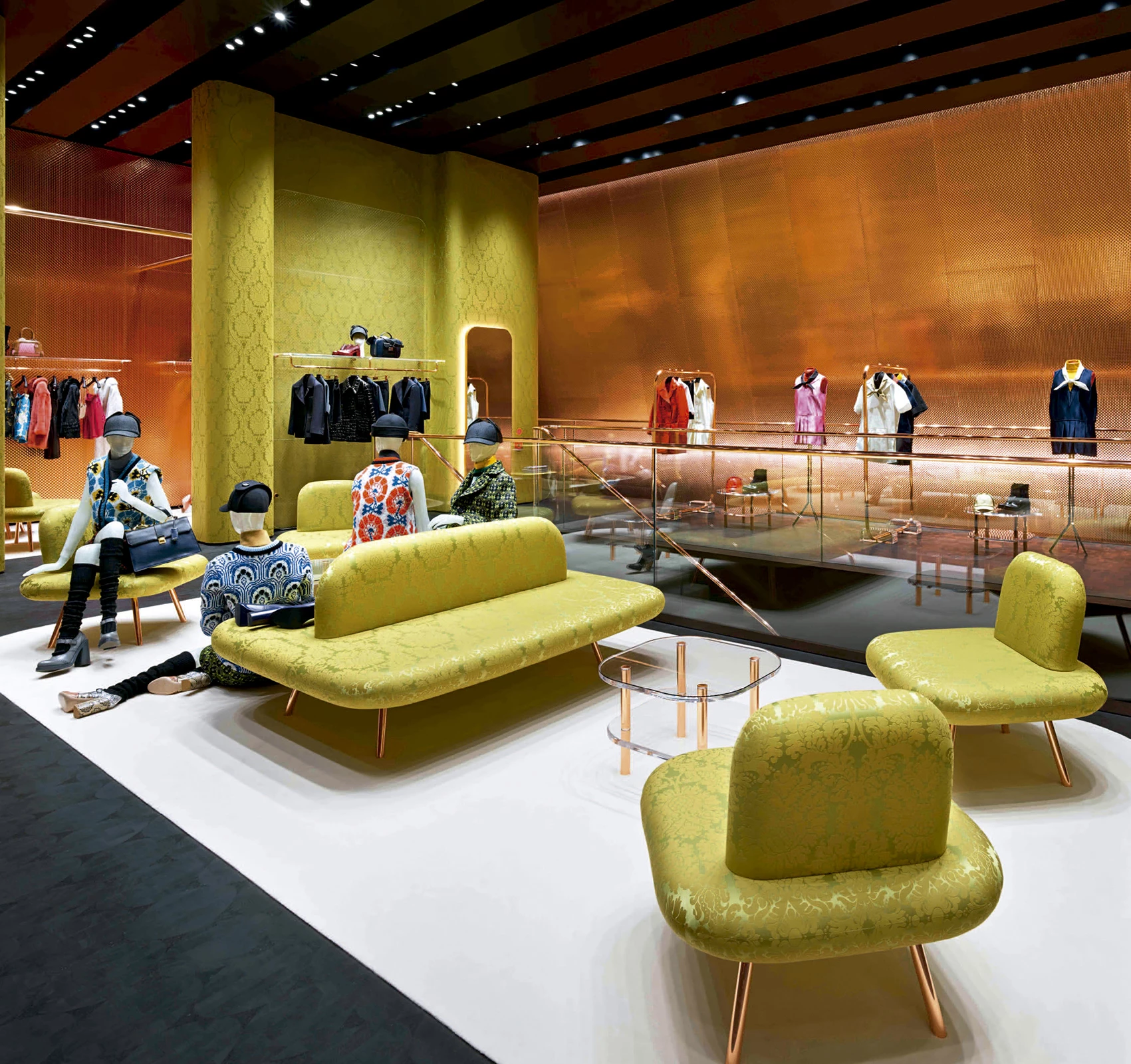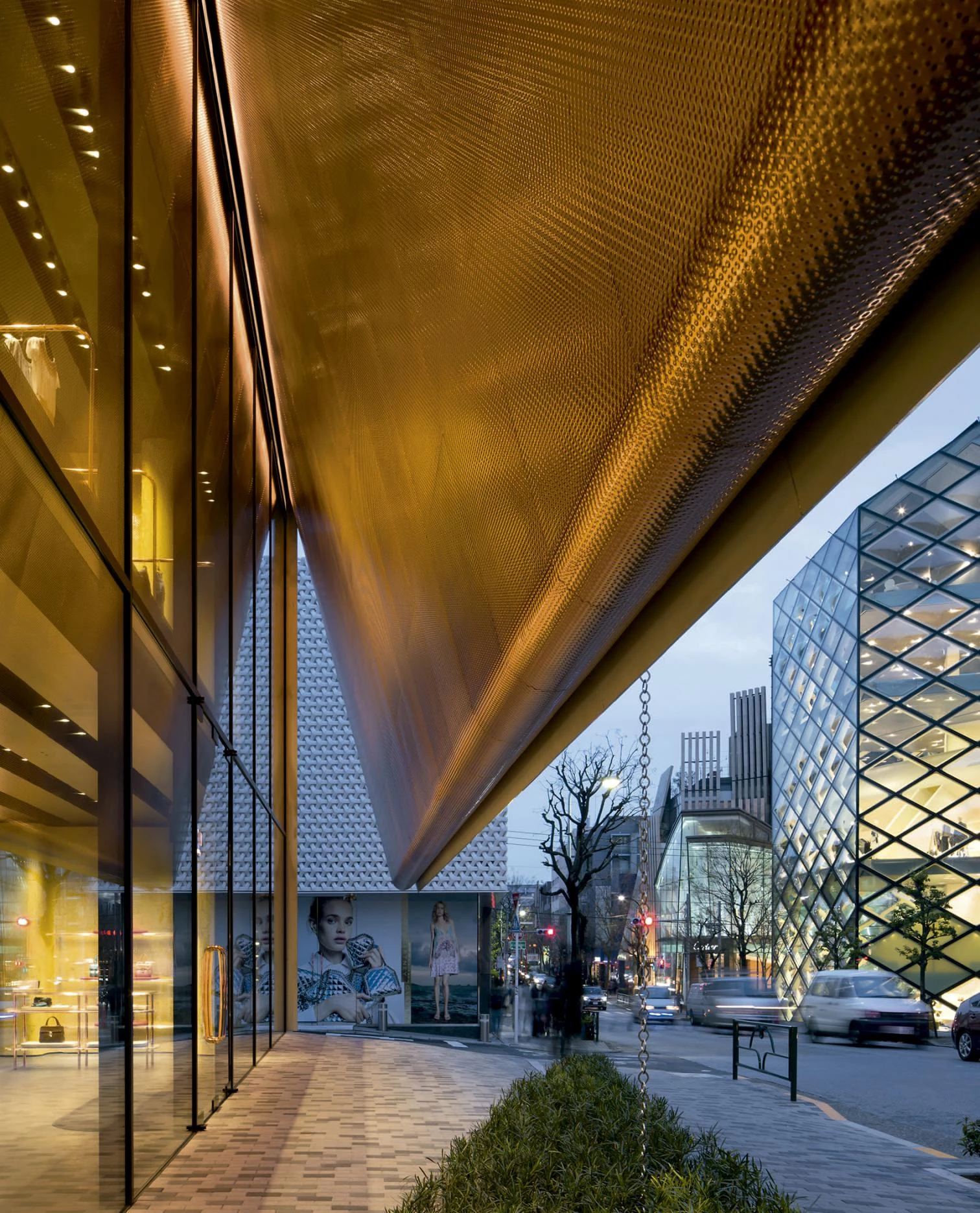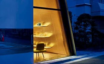 El modelo tipológico que mejor se adapta a estas especificaciones es una caja situada directamente a nivel de calle con una cubierta entreabierta para señalar la entrada y permitir que los peatones miren hacia adentro. Sólo entonces se descubre que el edificio es una tienda. Desde este punto, bajo el umbral sobredimensionado, se observan las dos plantas de un solo vistazo, como si el volumen se hubiese abierto con un gran cuchillo, transformando el interior en exterior. En este lugar intersticial, las aristas redondeadas de las superficies de cobre que envuelven el interior se encuentran con las esquinas afiladas de la caja de acero exterior. Por su parte, los nichos laterales revestidos con tejido brocado se vuelcan hacia el centro como los palcos en un teatro. La tienda, por tanto, no se limita a exponer sus productos sobre mesas o vitrinas; sino que también es un lugar amplio y confortable con sofás y sillones que hacen sentir cómodo al cliente.