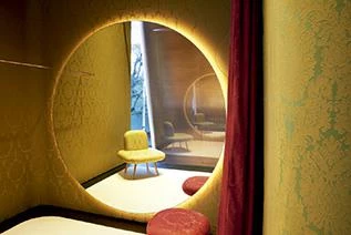 La fachada no tiene ni logo ni iluminación; es una superficie pulida, lisa como un espejo que atrae la mirada y la curiosidad de la gente. Pero en lugar de ver lo que hay al otro lado del cristal, como en un escaparate, la mirada se invierte y los peatones se encuentran con su propio reflejo. Mientras que la calle no es un lugar que incite a quedarse y mirar alrededor, el edificio en sí mismo es un gesto que invita a entrar y quedarse.