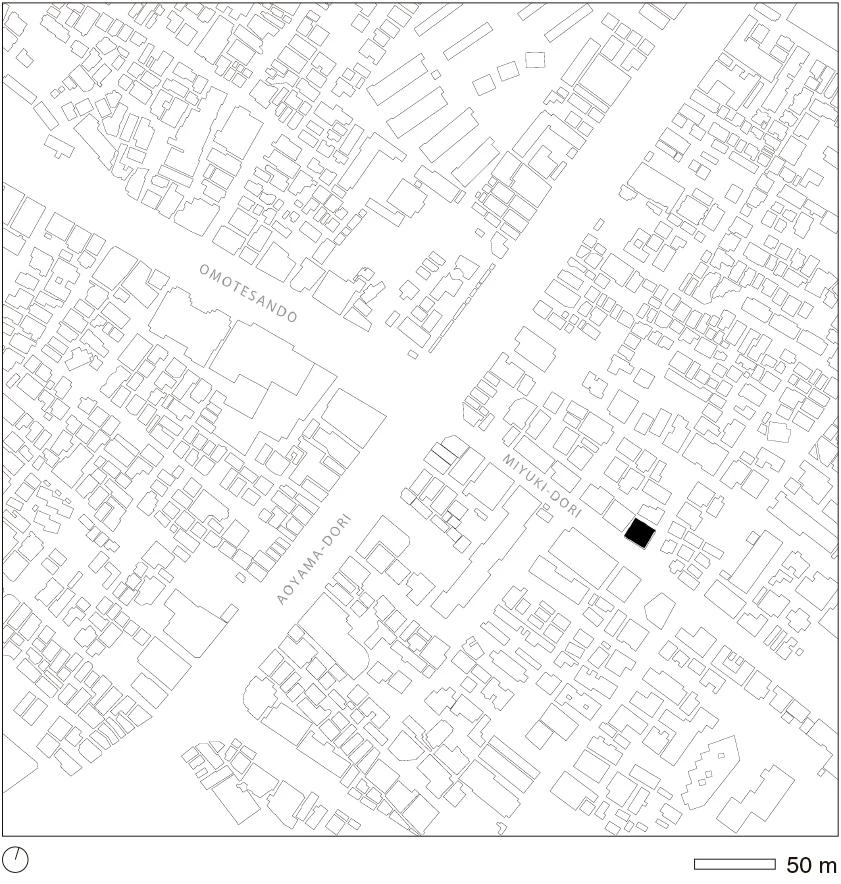 A diferencia de lo que se puede esperar de la zona donde se sitúan las principales marcas de lujo en Tokio, la calle Miyuki en el barrio Aoyama no es particularmente bonita o elegante. Su arquitectura es heterogénea —una mezcla de edificios autónomos de diferentes alturas y formas— sin tradición histórica ni características en común. Lejos de ser un lugar en sí mismo, esta calle es un mero enlace funcional entre dos puntos y, a pesar de que cuenta con algunos árboles aislados, carece de la atmósfera agradable que se genera en un bulevar o una plaza. Estas consideraciones ya se tuvieron en cuenta al construir el edificio para Prada, situado en la misma calle, cuando se optó por un volumen transparente de siete alturas que reservaba un pequeño espacio público a un lado. En el caso de la tienda para Miu Miu la regulación urbana limitaba la altura permitida, por lo que se exploró el potencial de un volumen más pequeño e íntimo. Para canalizar las diferentes ideas del proyecto se enunció una serie de líneas de pensamiento: la tienda debía parecerse más a una casa que a unos grandes almacenes, estar más escondida que expuesta, ser más comedida que extravagante, más opaca que transparente.