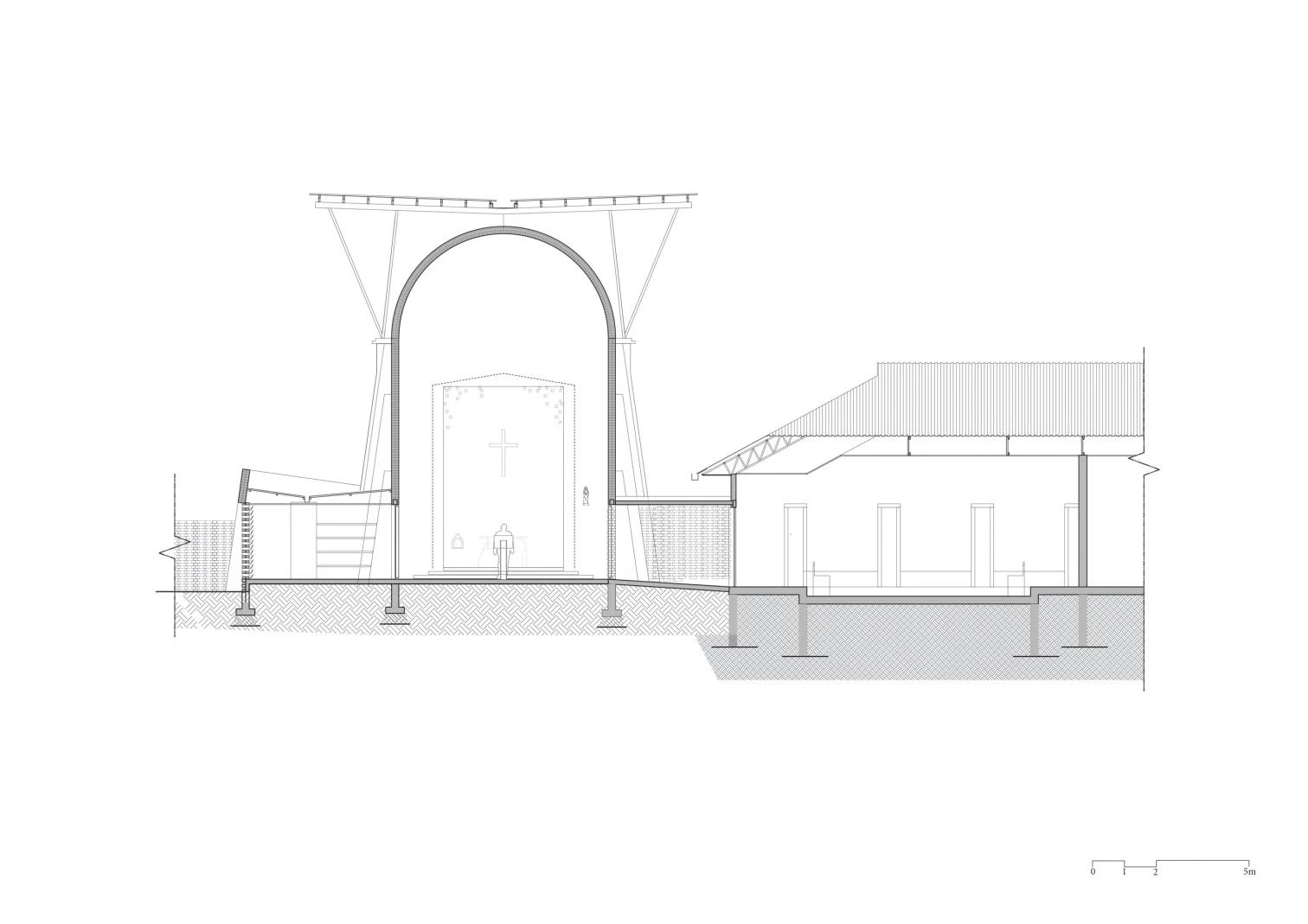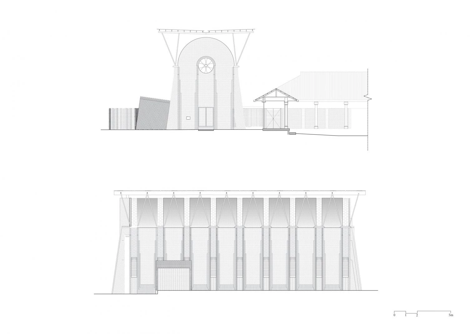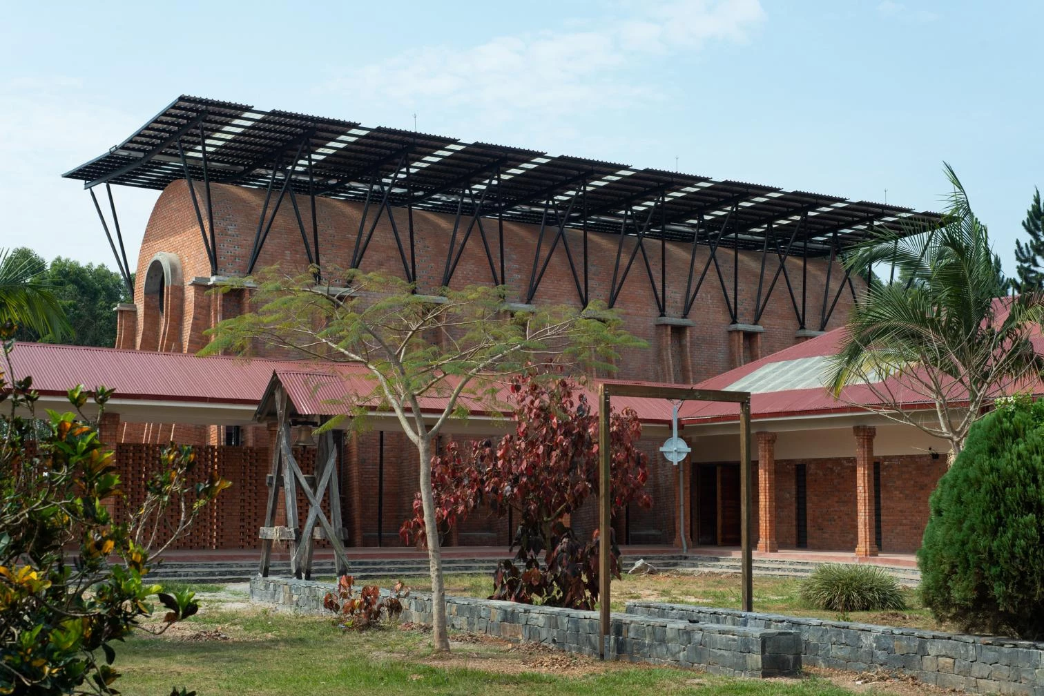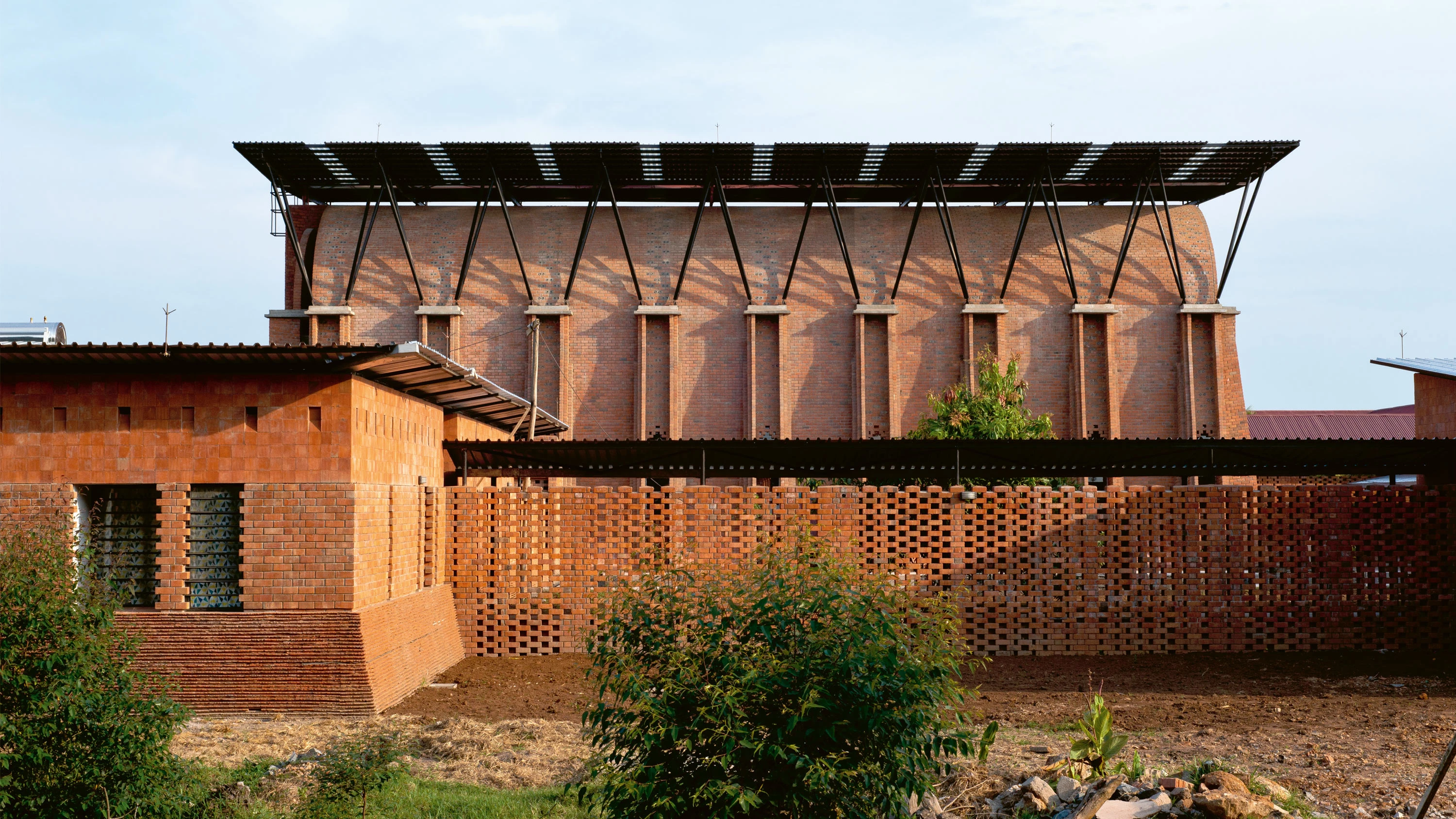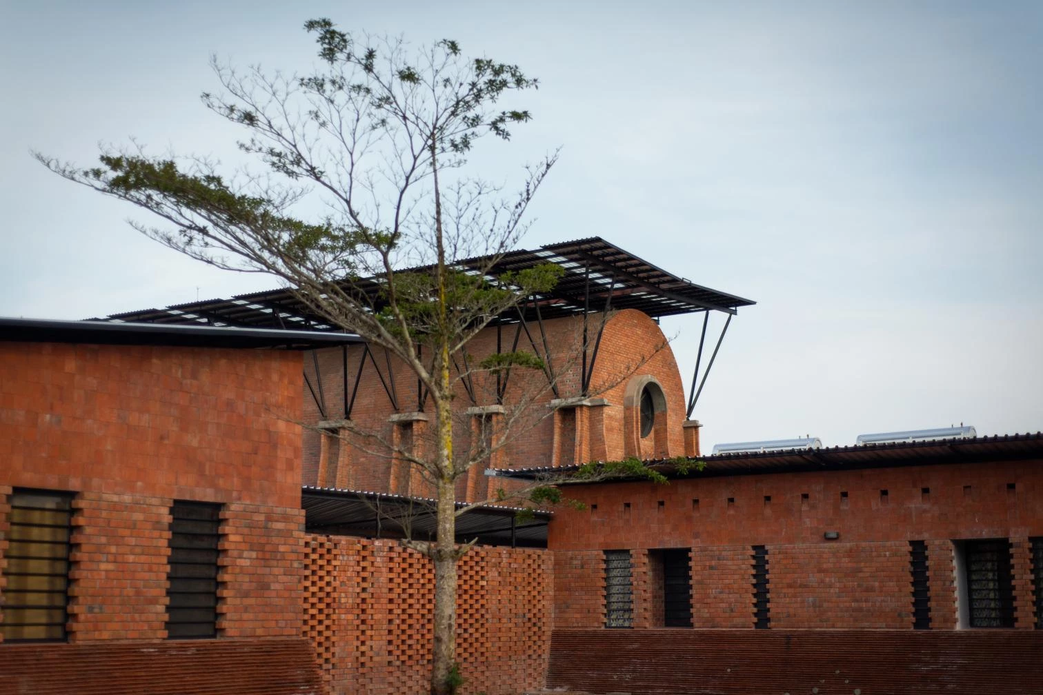 Parapetada bajo una amplia cubierta ventilada, la iglesia es un volumen longitudinal definido por una bóveda de cañón que intercala franjas de ladrillos cocidos con cáscaras de café y piezas de vidrio incrustadas que permiten la entrada de luz.