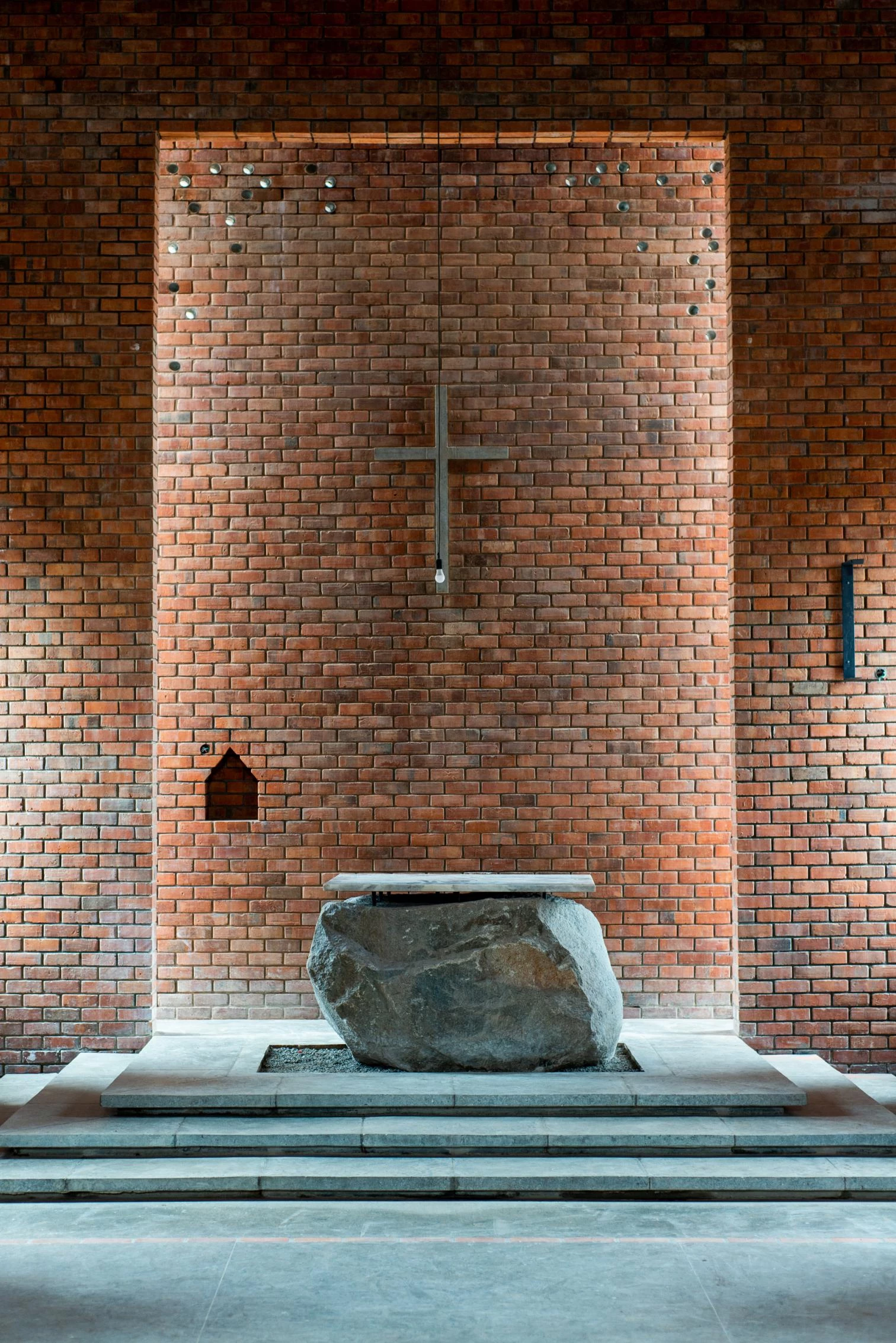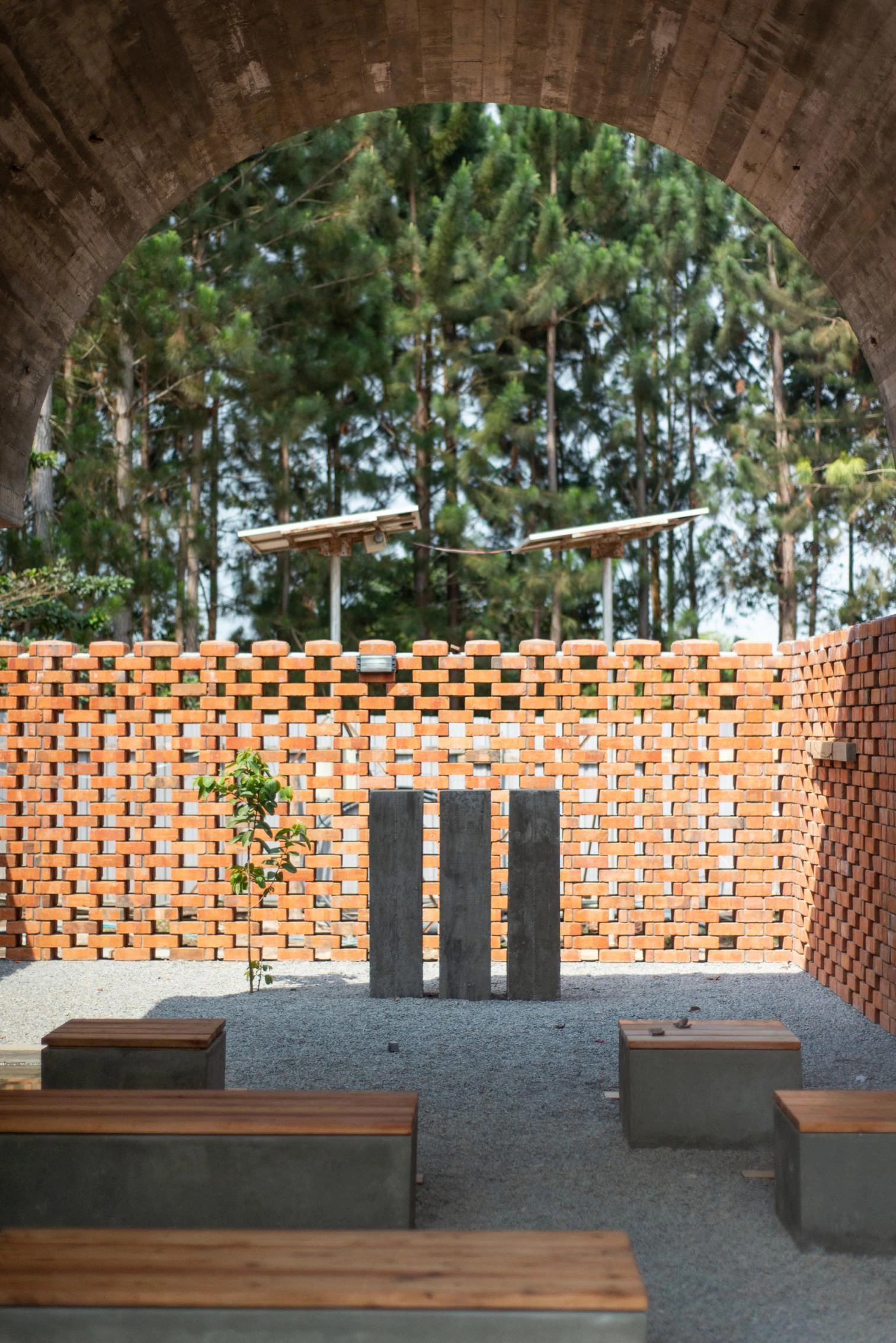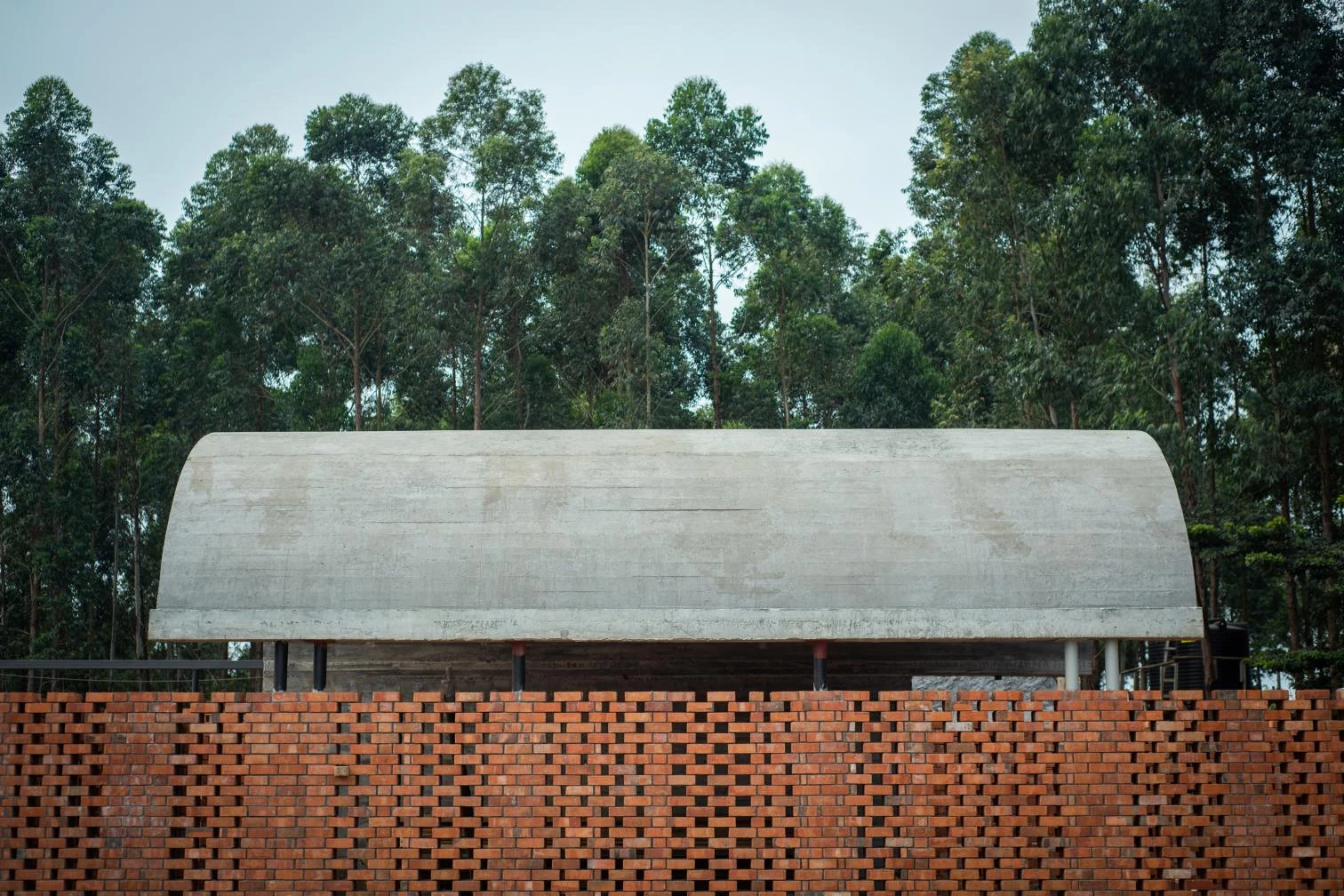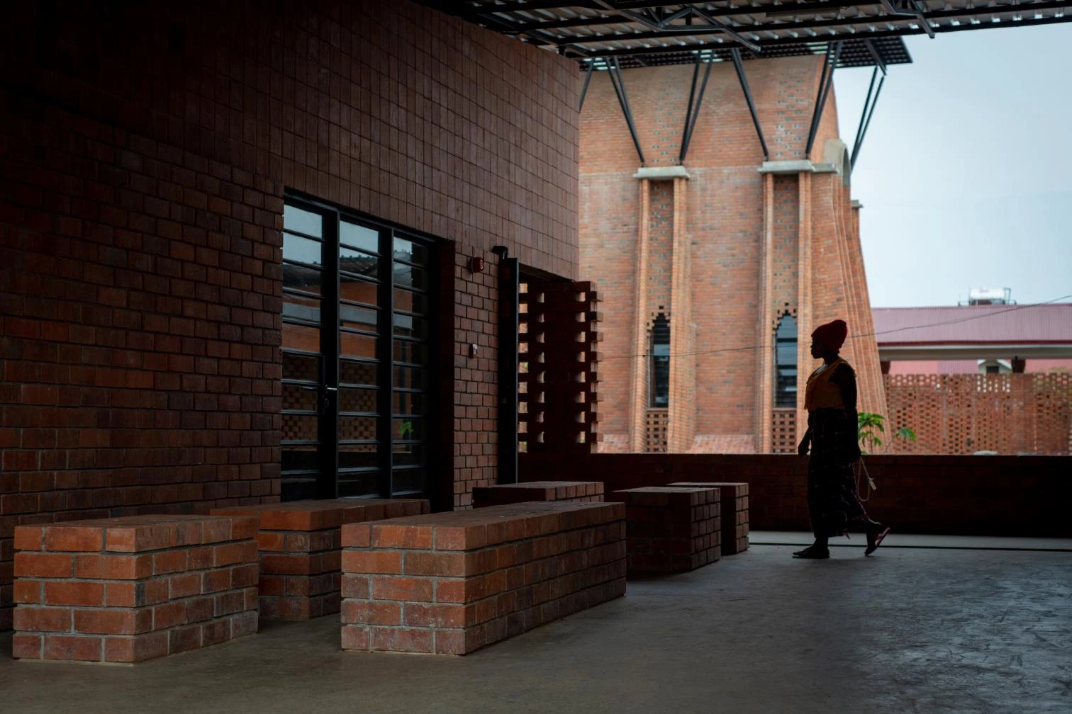 Parapetada bajo una amplia cubierta ventilada, la iglesia es un volumen longitudinal definido por una bóveda de cañón que intercala franjas de ladrillos cocidos con cáscaras de café y piezas de vidrio incrustadas que permiten la entrada de luz.